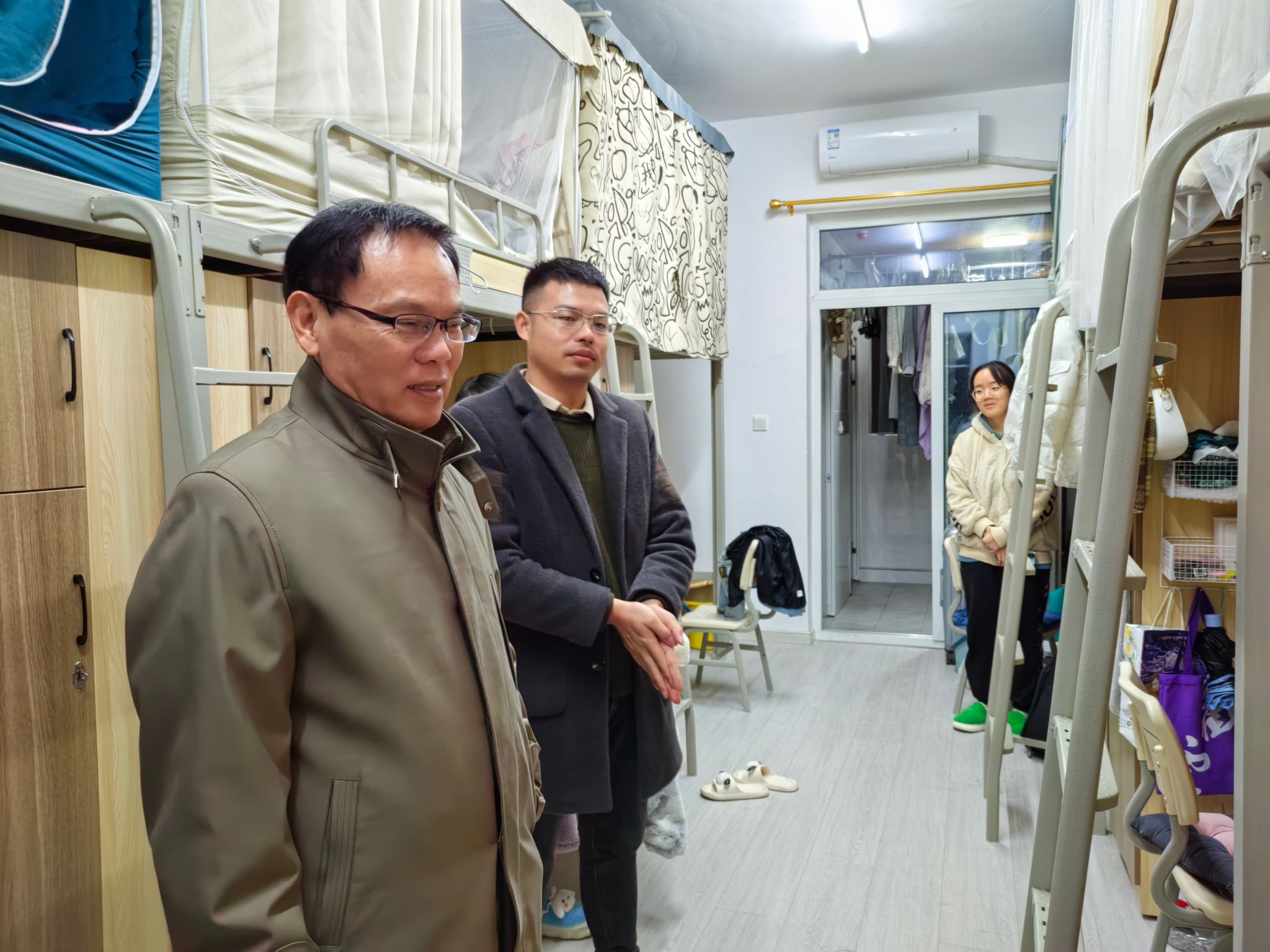当天晚上,计算机学院学工副院长周俊、教学副院长林泽金以及全体辅导员老师深入学生寝室,对同学们的居住环境进行了全面检查。检查内容包括寝室卫生、用电安全、内务整理等方面。在检查过程中,老师们与同学们亲切交谈,了解他们的生活状况,对存在的问题提出了整改要求和建议。