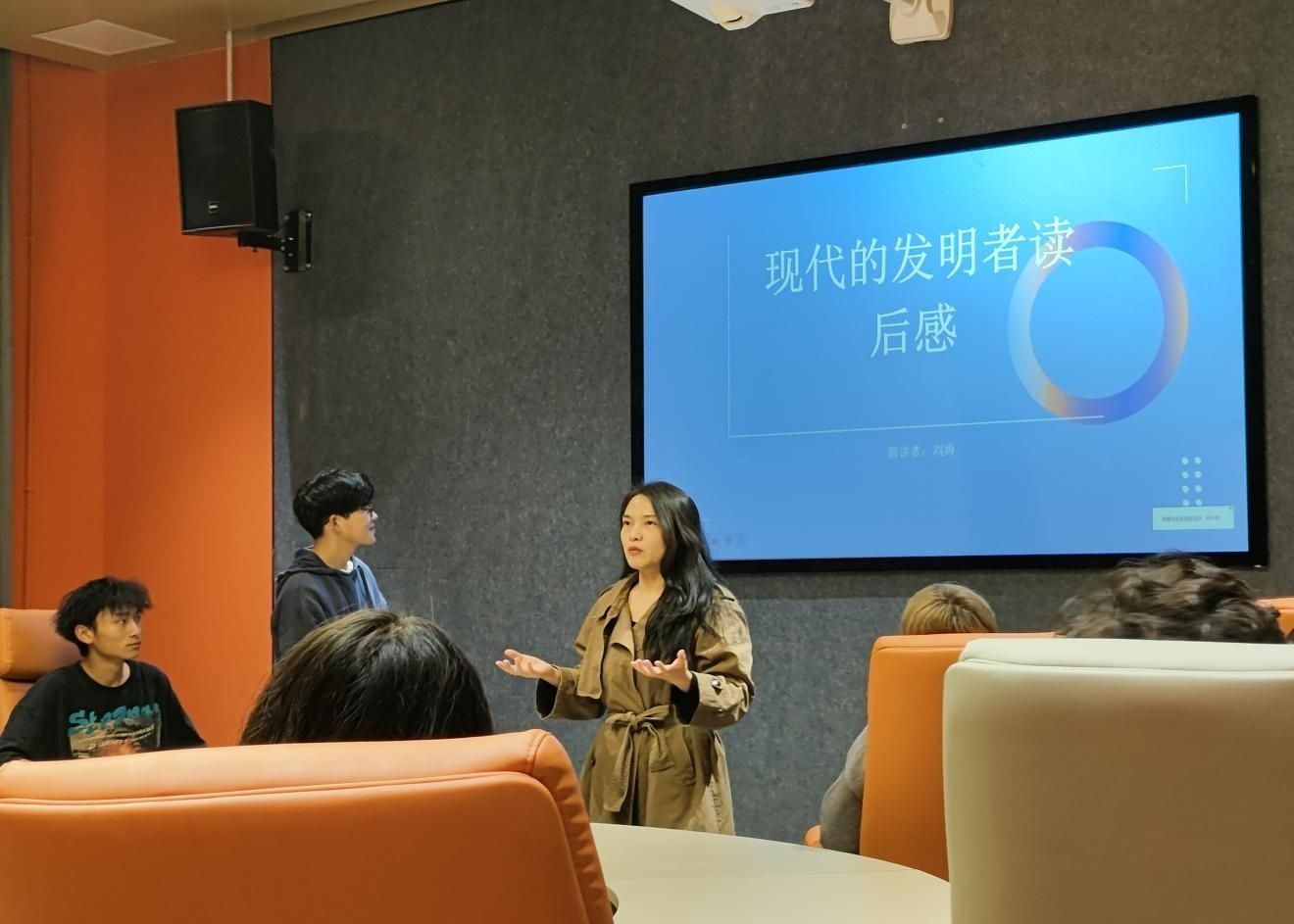 此次活动是由第一组代表刘涛同学分享阅读的大咖书籍——《现代的发明者》。首先,他落落大方地向大家介绍了自己和小组成员,让同学们对班级同学加深印象及了解分工。紧接着,他便从此书的作者背景、内容概要、主题观点、评价影响、观后感受这五个方面向大家介绍看了这本书后的心得体会。