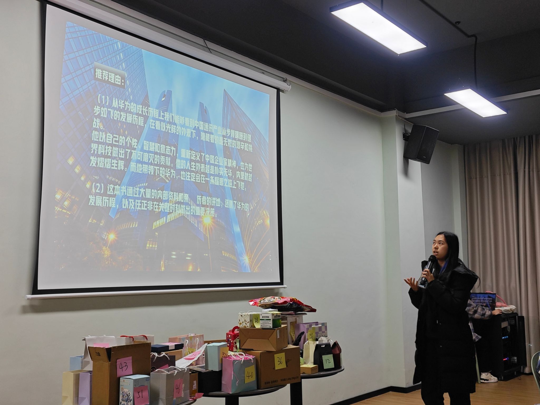 接下来是来自2023级信息安全学院软件工程12班的牟雨涵同学为大家上台分享,他们小组带来的是《任正非传》。从军营到国企,巨大的转变,不同的工作,任正非不断努力从负债200万到带领华为成为年营业额超百亿美元的超级企业,其中的艰辛和最后的成功让他们认识到在日常生活中要但行好事,莫问前程。