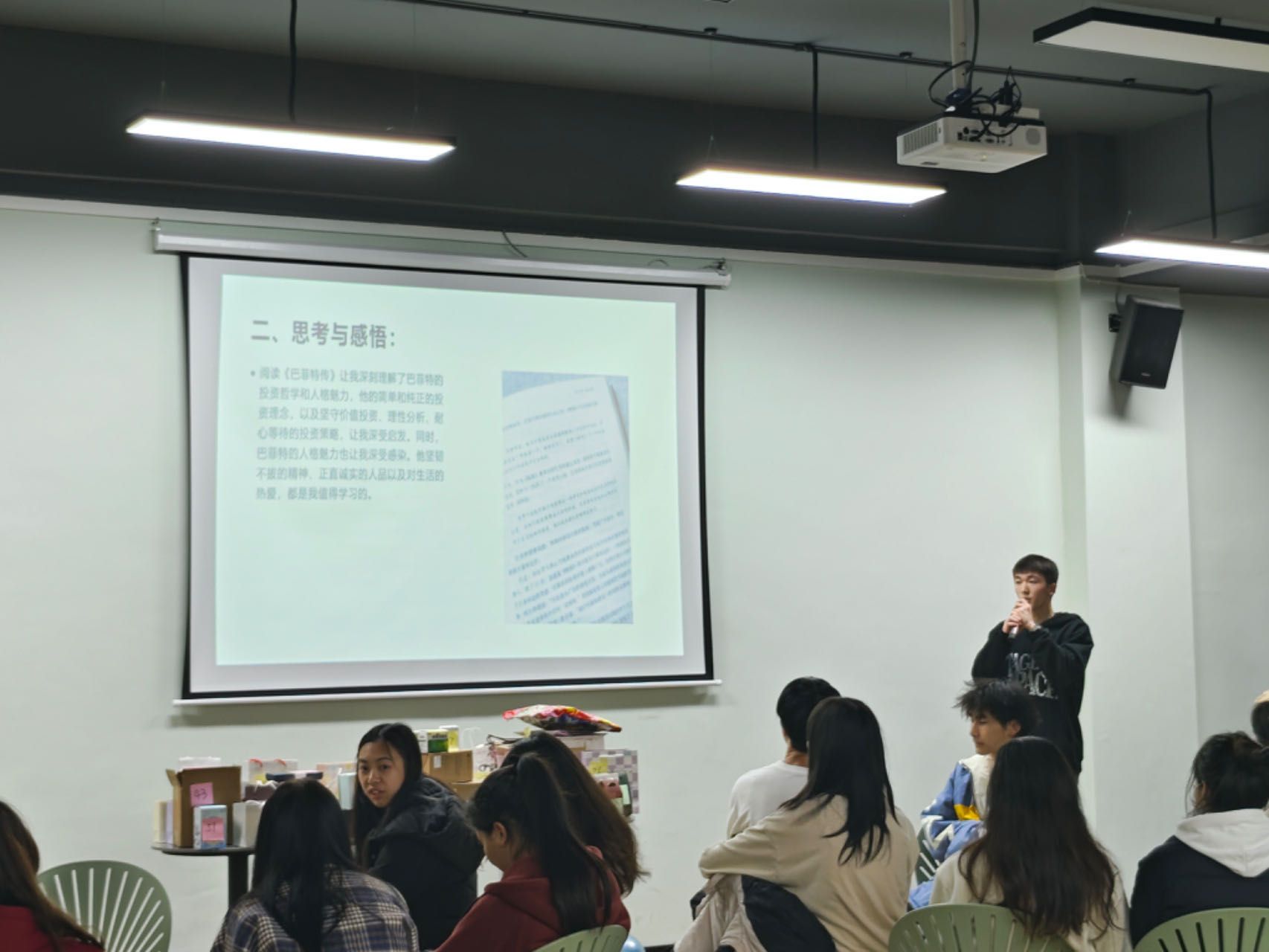 活动开始,首先为大家介绍的是来自2022级计算机学院计科9班,他们为同学们带来的是《巴菲特传》,通过对巴菲特经典语录的讲解,分享者体会到巴菲特坚韧不拔的精神、正直诚实的人品以及对生活积极热爱的态度都是值得学习的。在追求梦想的道路上要保持简单纯正的心态,坚守自己的价值观,理性分析问题,不被短期利益和外界诱惑所影响。