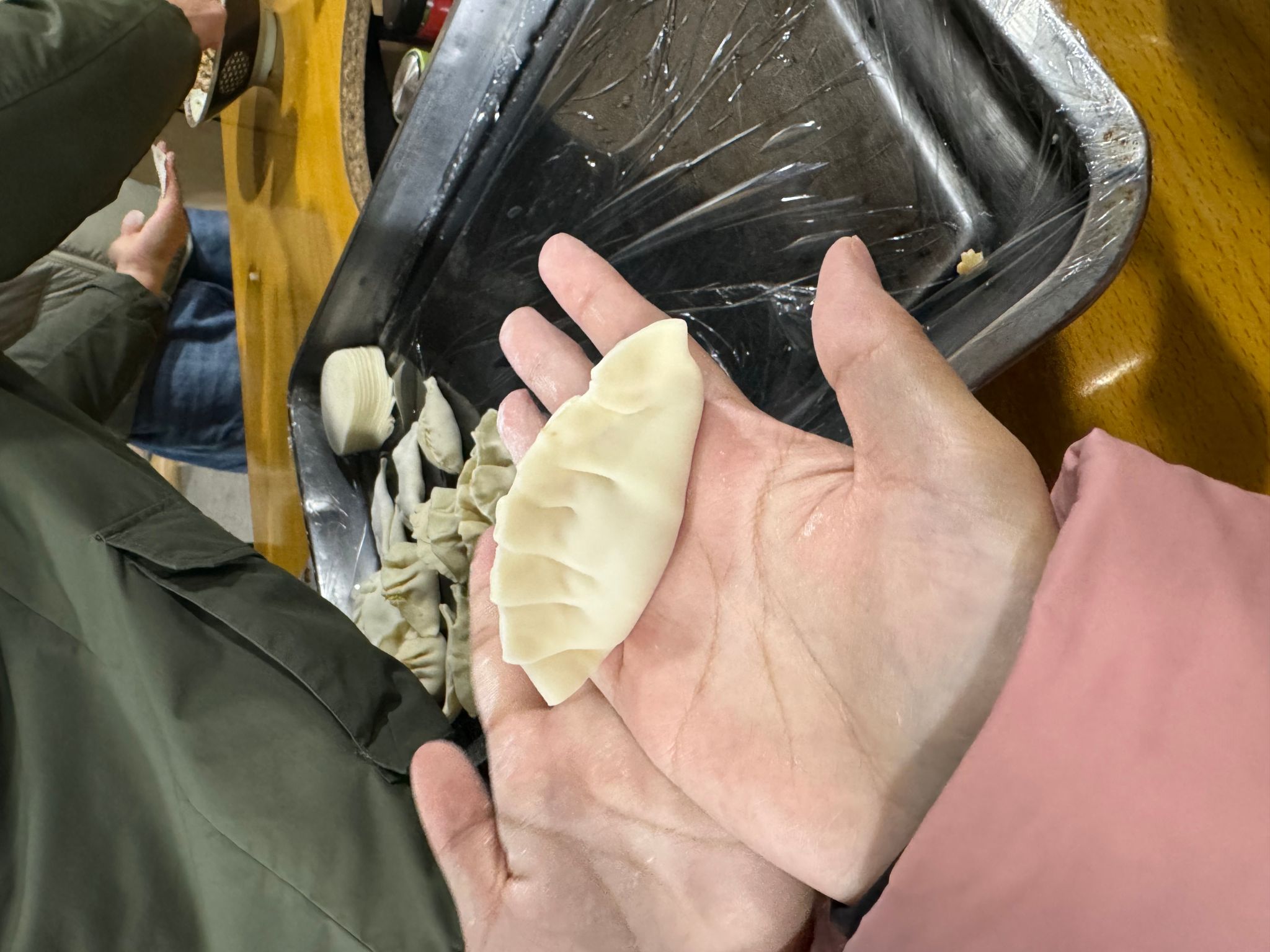 活动伊始,北渡食堂周经理现场教学,展示多种饺子形状的包法和技巧,有常见的大肚饺,也有略微复杂的柳叶饺、元宝饺,同学们认真观察学习。