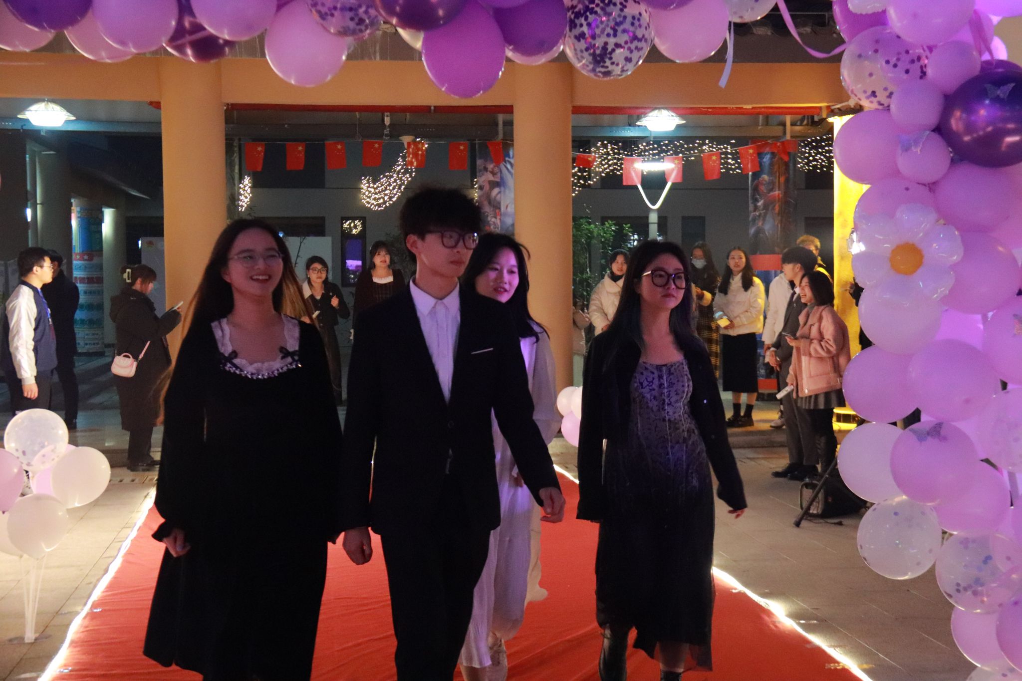 酒会在一片欢快的气氛中拉开帷幕。古剑书院中庭被装点得格外美丽。闪亮的灯光以及五彩的气球,营造出一种热烈而庄重的氛围。计算机学院的师生们拿着邀请函纷纷进场涌向签名墙,他们或拍照留念,或相互点评,交流着自己的创作心得。这不仅是一个签名的时刻,更是一个展现自我、相互欣赏的时刻。随后,他们踏上了铺满红毯的走道,缓缓走向会场。红毯两侧,灯光笼罩,在会场的入口,精心准备的照明灯下映照出耀眼的明星般的师生们。大家陆续坐下,满怀期待地等待着酒会的正式开始。