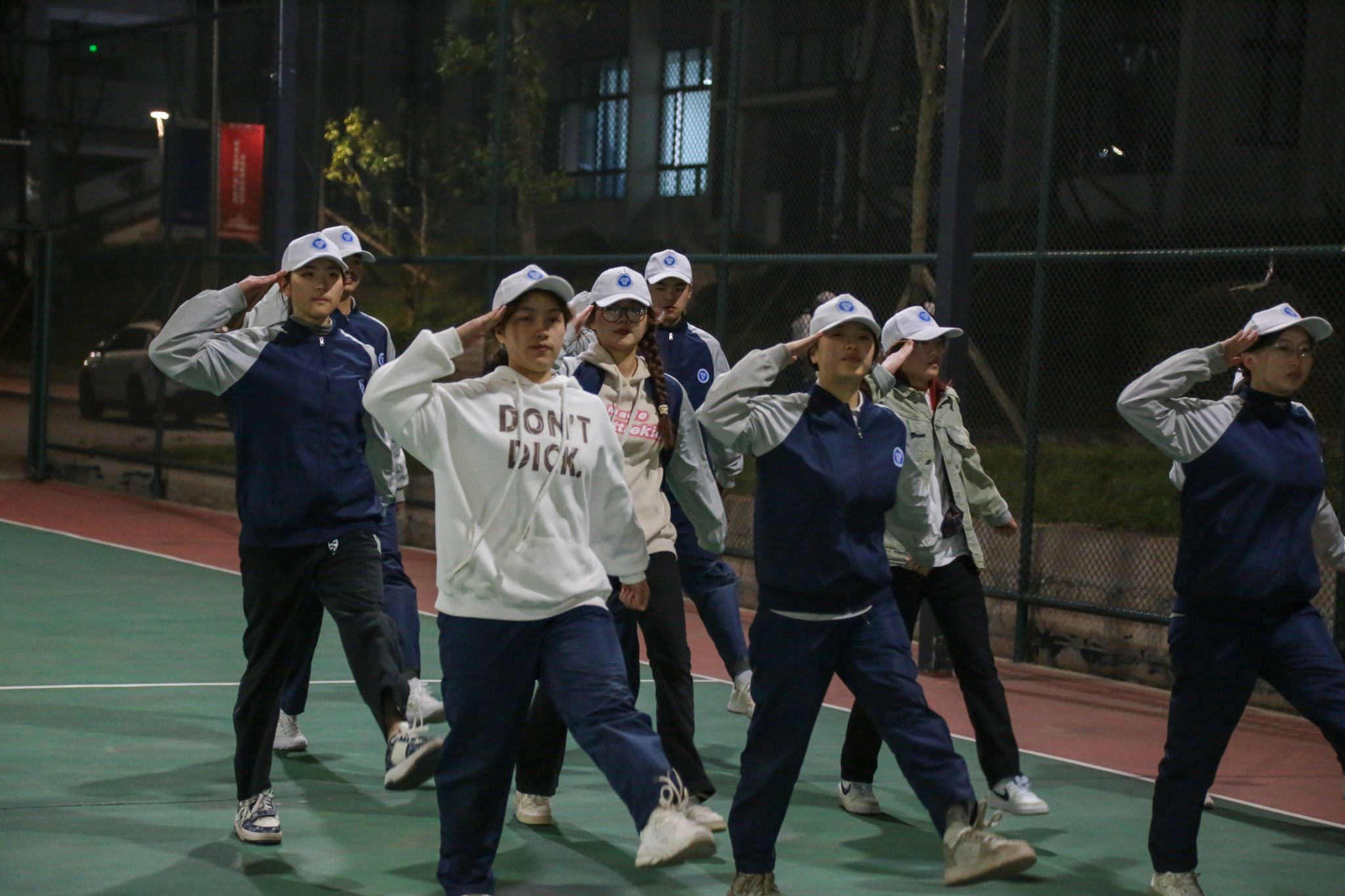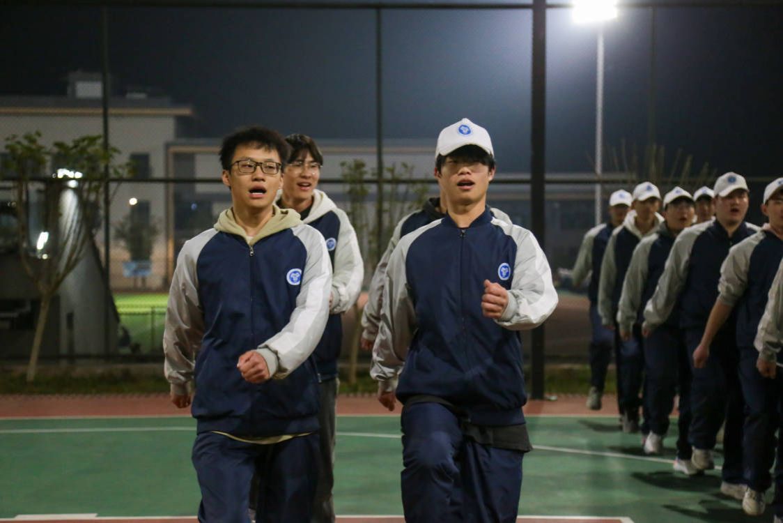 在夕阳余晖渐淡的夜晚,军训训练场依然灯火通明。在这静谧的夜晚,学生们的身影在灯光下显得格外坚定和刻苦。尽管夜色深沉,他们依旧认真完成每一个训练动作,无一丝懈怠。
