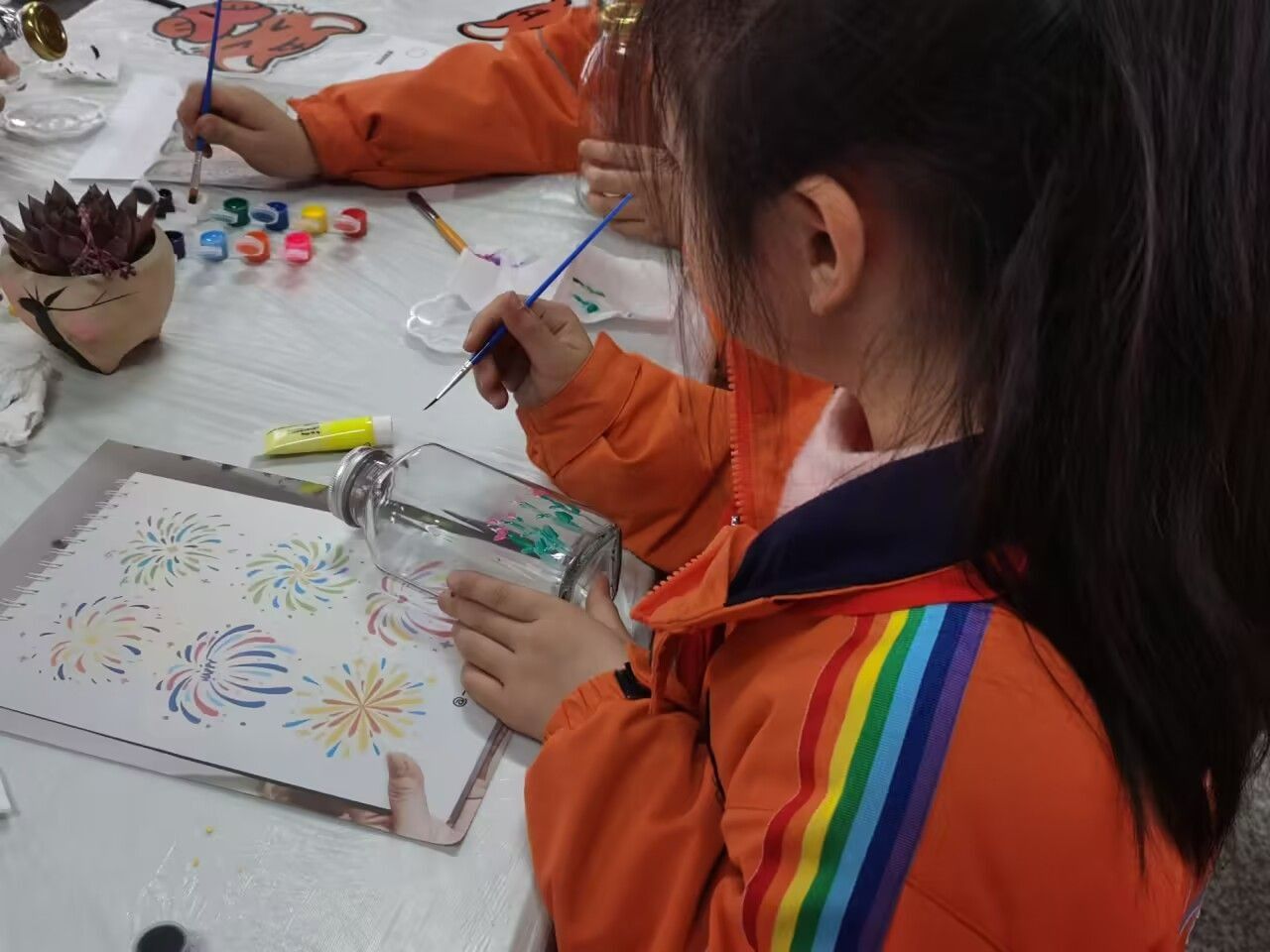 小朋友们观察着桌上的颜料及画笔,经过相互间的讨论,选好了属于自己的玻璃瓶,随后选定自己喜欢的颜色,根据自己的兴趣和想象力,选开始有条不紊地童心的创作。