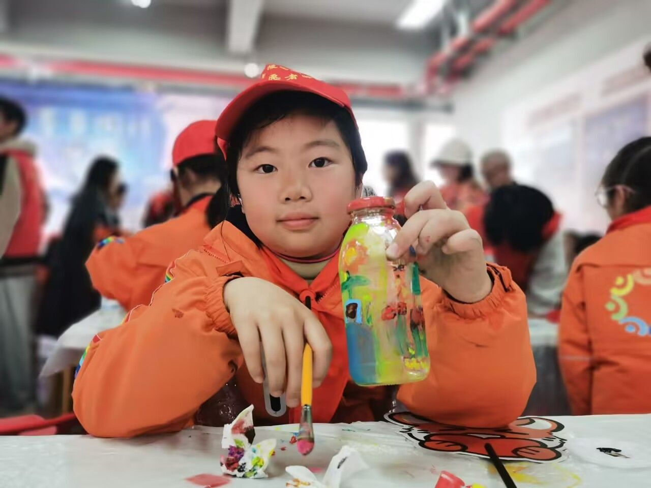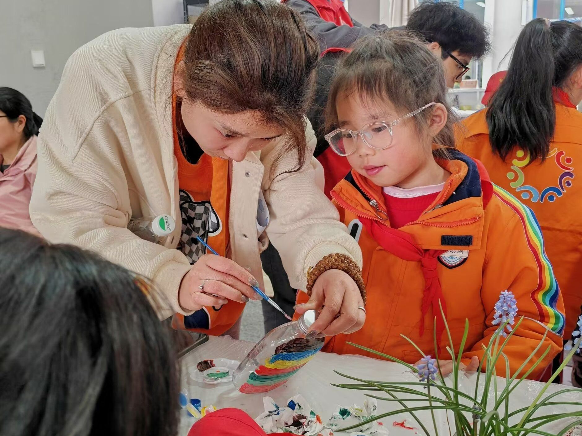 热闹的氛围中,小朋友们有的选择可爱的卡通人物模版慢慢“复刻”;有的热衷于色彩斑斓涂绘,用色彩释放心中的洒脱;更不乏依托想象的世界,结合植树节爱护环境的思考,画出心中的“树”。小朋友们充分发挥自己的想象力,用稚嫩的小手创造出一个个别出心裁的作品。涂绘过程中,志愿者们耐心指导,及时帮助孩子们抚瓶调色,在相互间的配合下,顺利完成了自己满意的植物瓶。