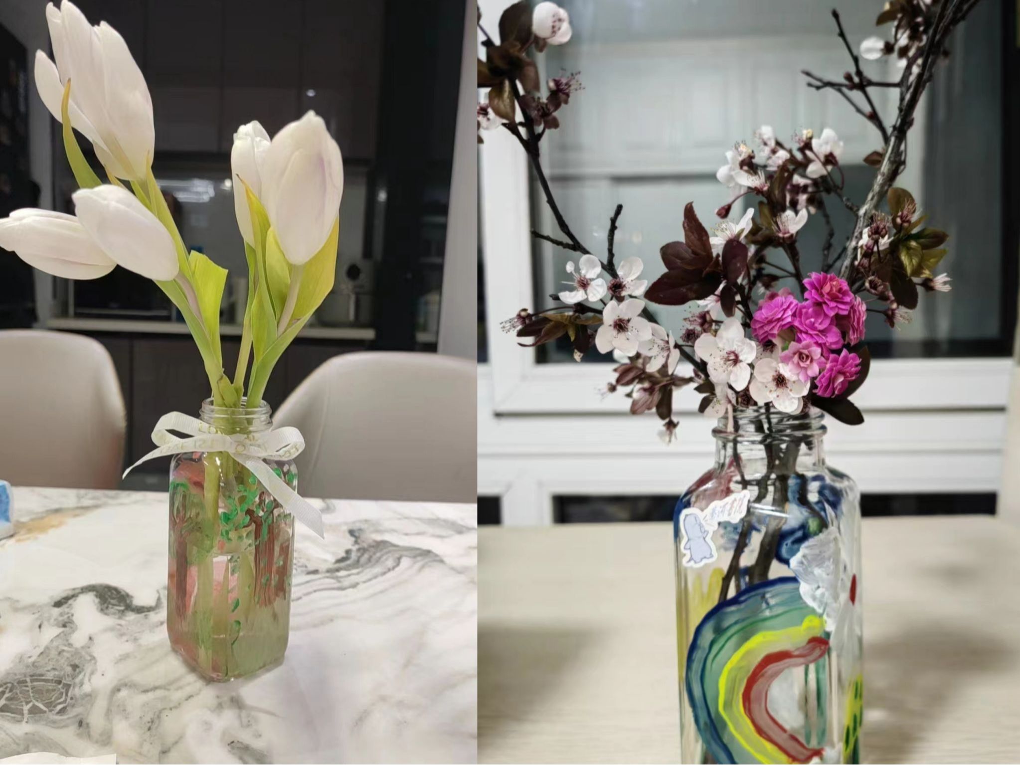 老师传来孩子们家中植物瓶的照片。看着五颜六色的花卉枝条插进孩子们创意绘出的植物瓶,就像春天的暖阳渗透在了孩子们的童心。春花开在瓶中,爱护体现在行动里。
