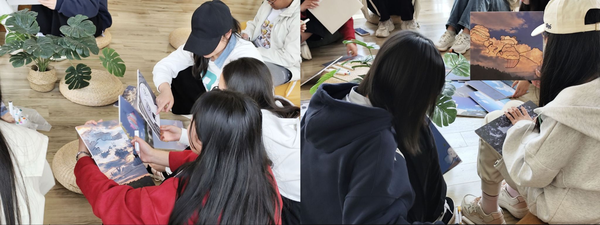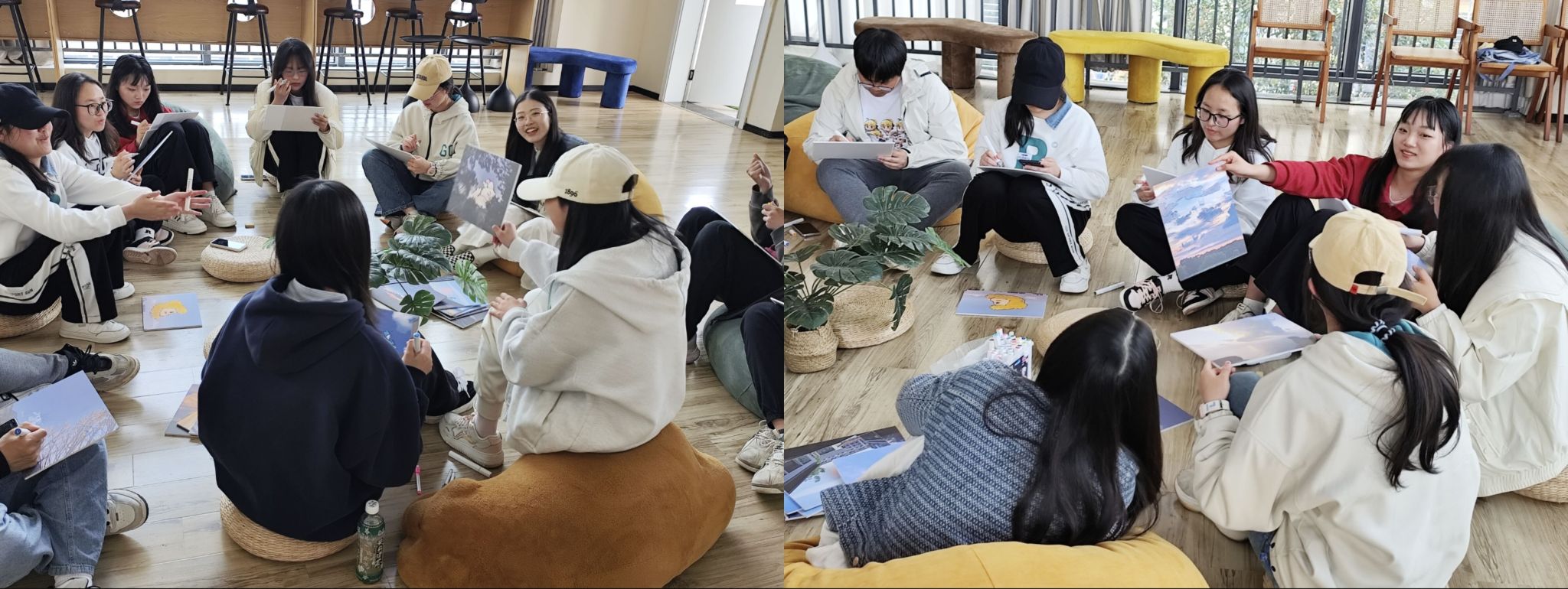活动现场,同学们在画画的同时,还一起相互探讨、交流。同学们说在画笔舞动时,不仅学习到了实用的心理调适方法,也学会了在微小的事物中感知幸福,在感受到幸福时表达和传递快乐,在轻松愉快的氛围中加深了彼此之间的了解与友谊。同学们将自己的情感寄托在云画中,大方地交流互动,给大家介绍自己的云画,不仅放松了心情,更在互动交流中收获了成长与进步。