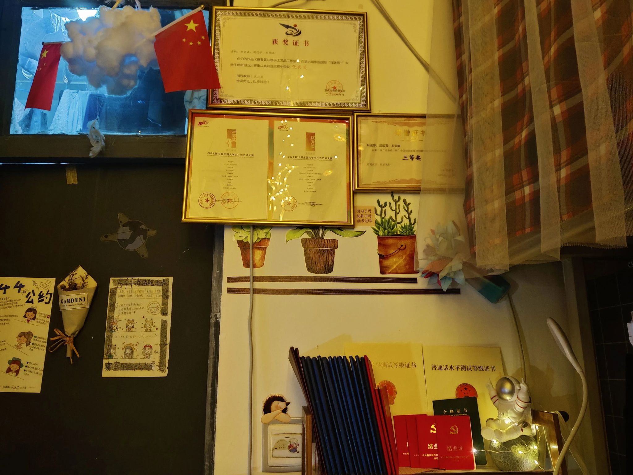 (三)文化氛围营造:设立读书角、张贴名人名言、摆放荣誉证书等,营造寝室的学习氛围和荣誉感。同时设立寝室公告栏,展示寝室成员的作品、活动照片等,增强团队凝聚力。