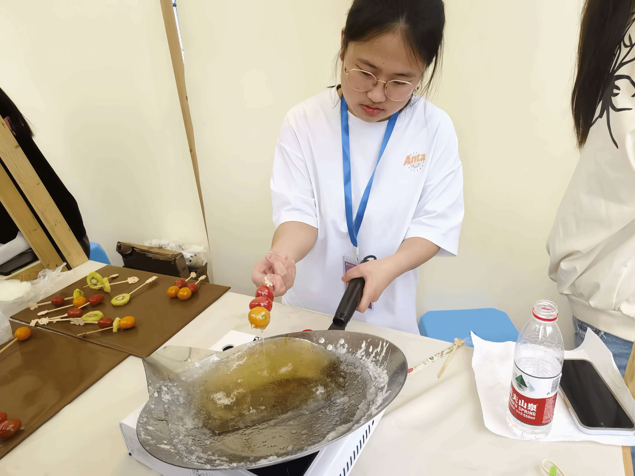 首先,由部门的工作人员准备食材,串好水果,部长杨秋香同学亲手熬制糖浆。同学们看到这些,纷纷自觉排队,等待活动开始后进行品尝。活动开始,同学们依次挑选自己想吃的糖葫芦,且热情高涨,纷纷参与到糖葫芦的制作过程中。他们在工作人员处挑选自己喜欢的水果,然后在制作人员的耐心指导下,学习裹糖浆的技巧,每一个步骤都充满了乐趣和挑战。