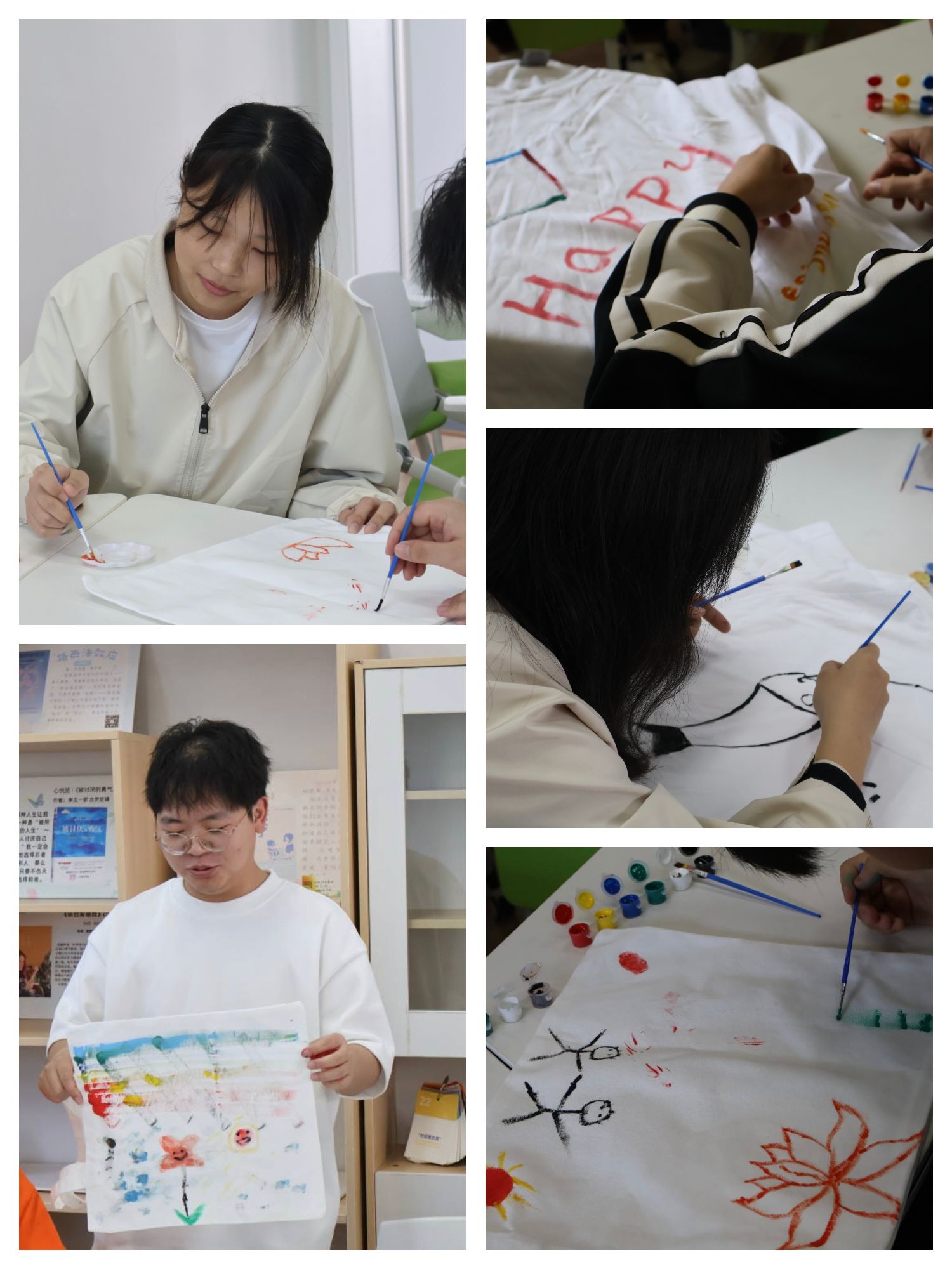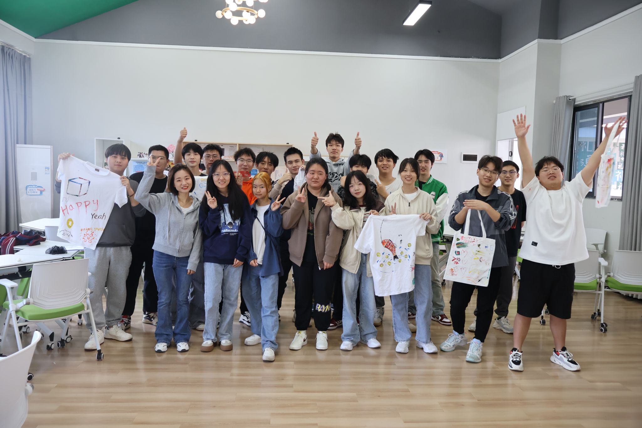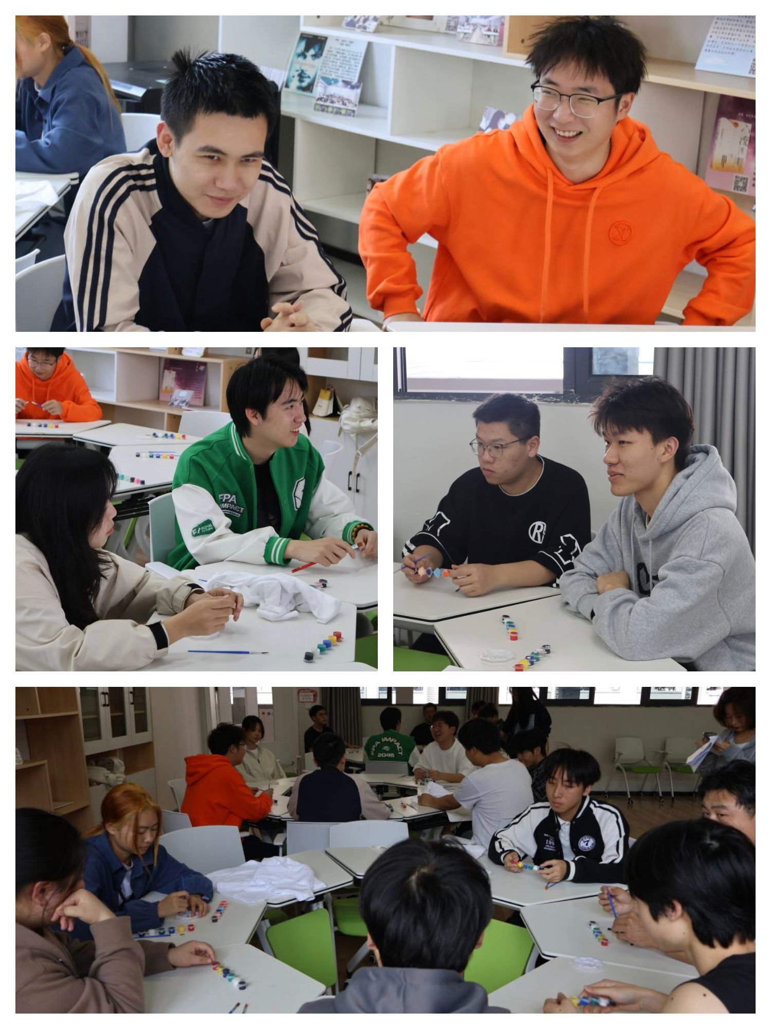 而最令人期待的就是接下来的创意手绘环节。这一环节不仅让同学们展现了自己的创造力和想象力,更让他们跨越了分组的界限,互相学习、共同进步。在手绘的过程中,他们不只是和自己组的同学交流,还与其他小组的同学们相互探讨、互相启发。有的小组的作品上有着他们的名字,还有的有着各种寓意深远的图案,如象征发财的幸运鲤鱼、特殊的彩虹、荷花、树叶和春天等,每一幅作品都体现了同学们的创造力和艺术感。大家在拿起手中的白T恤和帆布袋时,都尽情展现着自己天马行空的想象力,将普通的物品化作了独一无二的艺术品。在手绘的过程中,欢笑声不断,友情之花也在这个过程中悄然绽放。