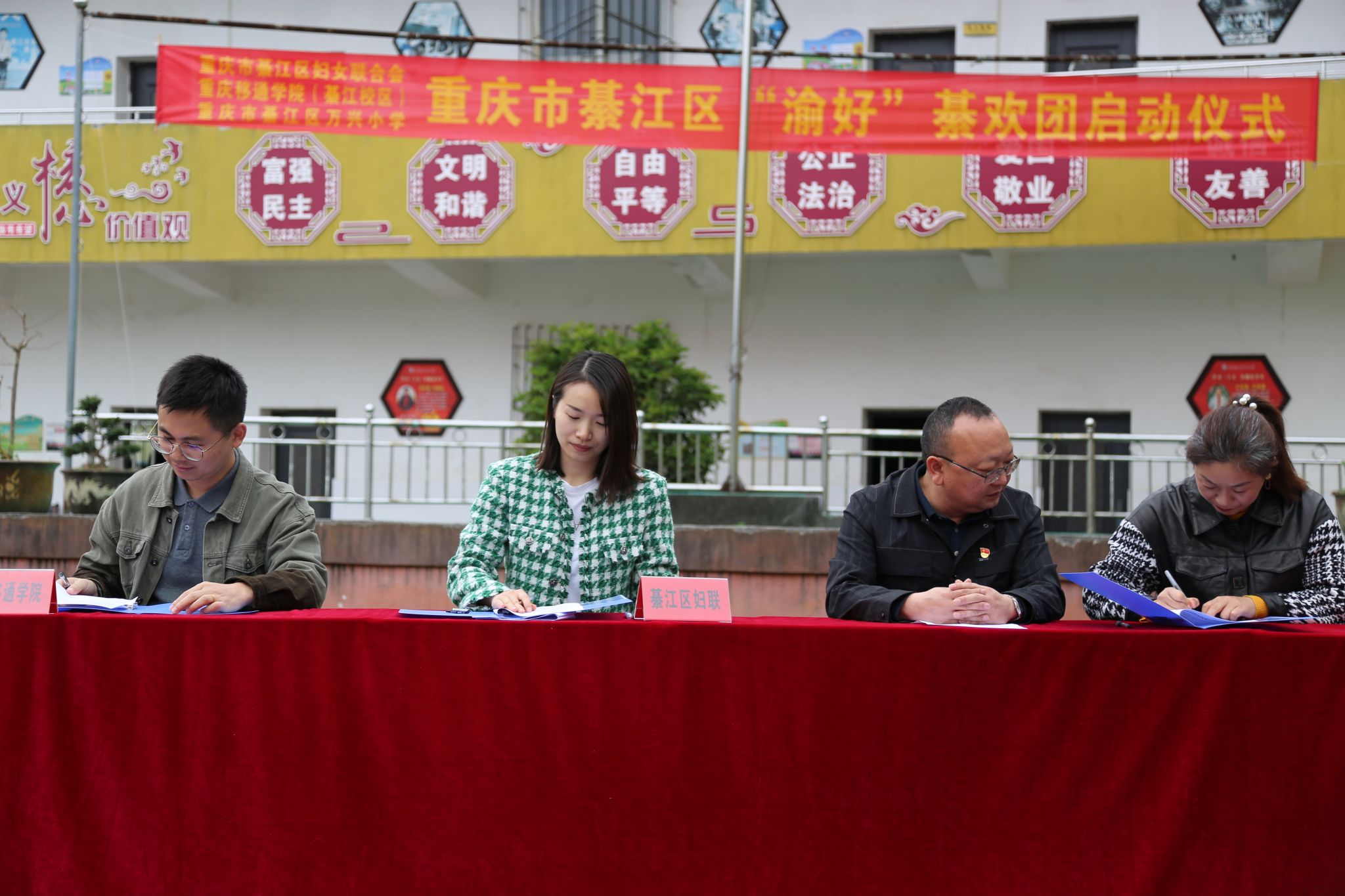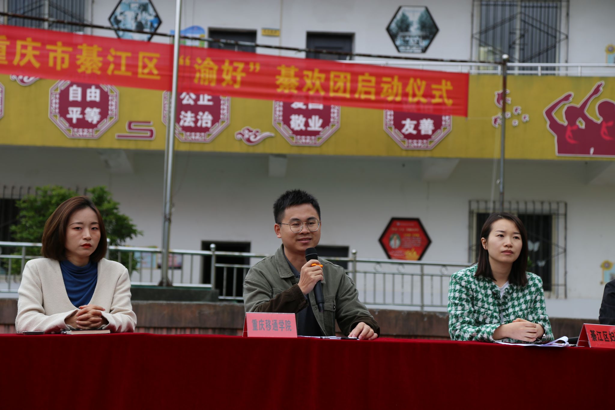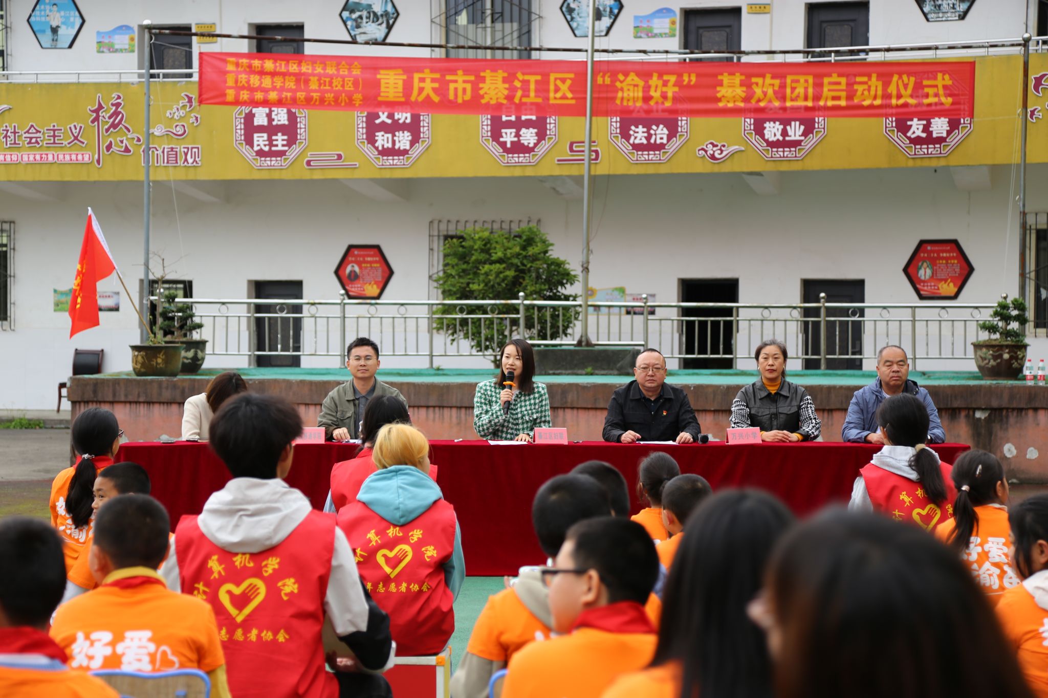 在启动仪式上,綦江区妇联主席赵娅梅、副主席杨茜及区妇联相关工作人员,万兴小学校长王小猛、副校长刘素敏以及全校师生,重庆移通学院(綦江校区)计算机学院学工副院长周俊,艺术修养、志愿服务、宣传工作等版块的指导教师以及30名学生志愿者共同参与。