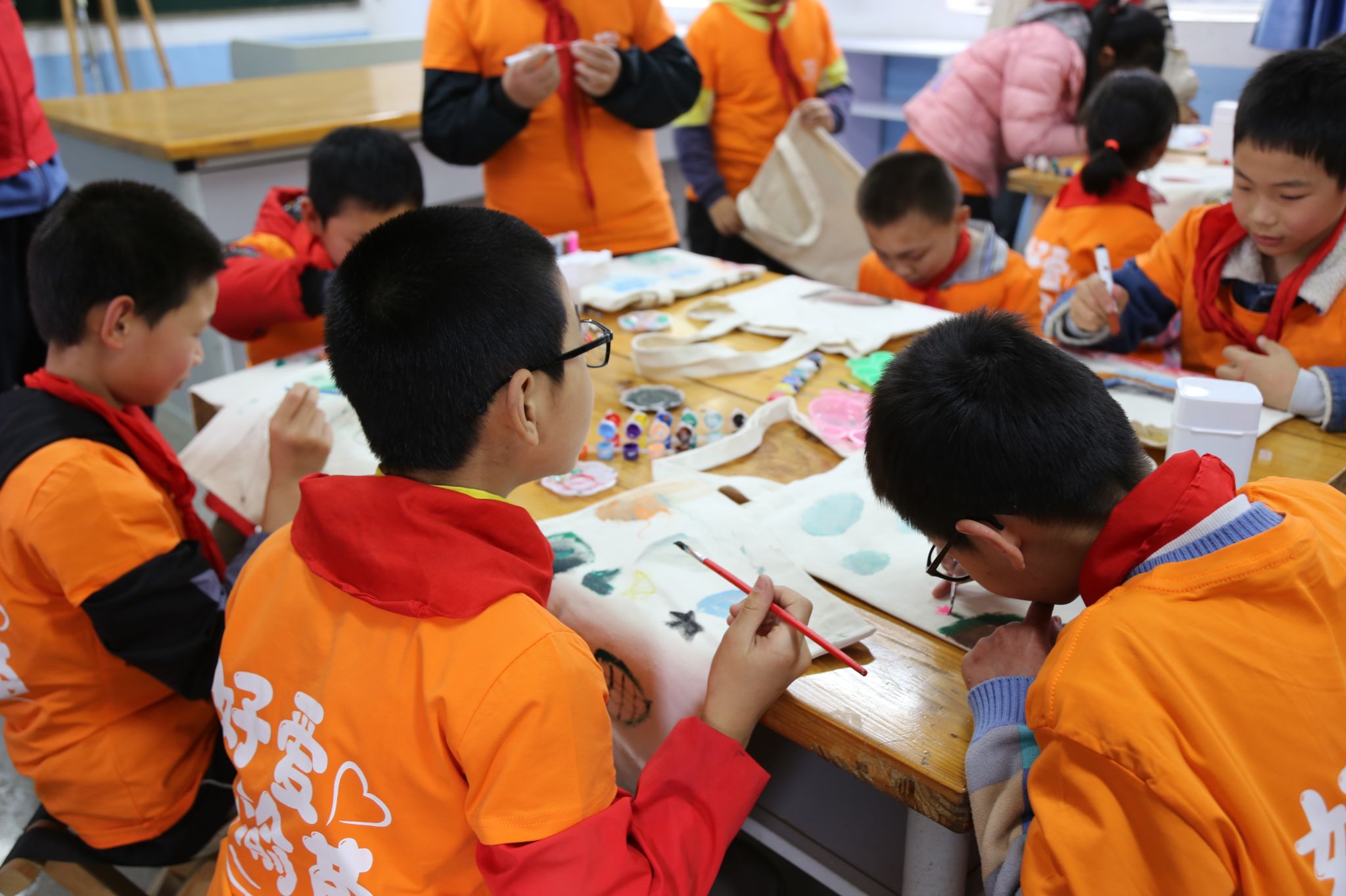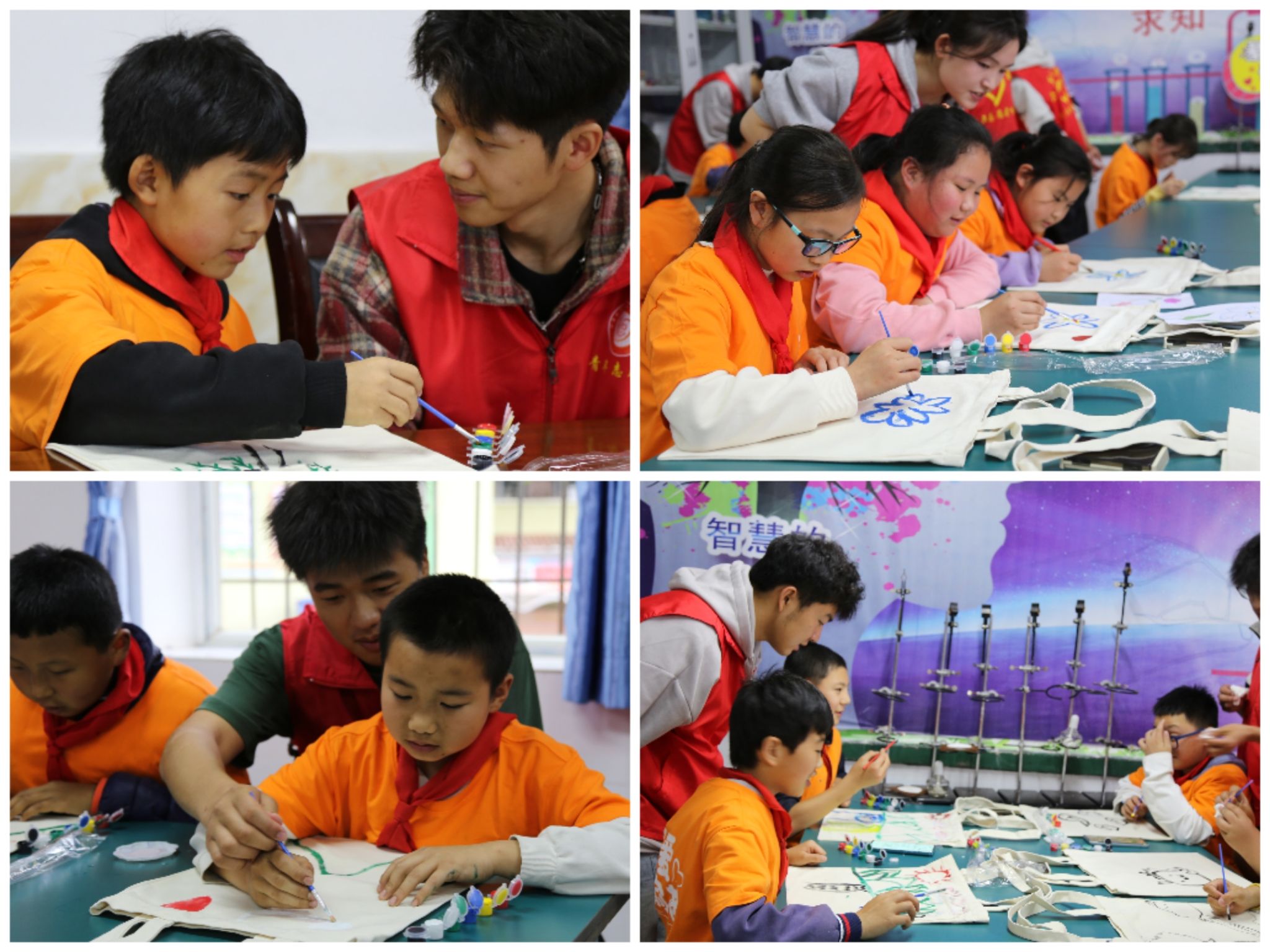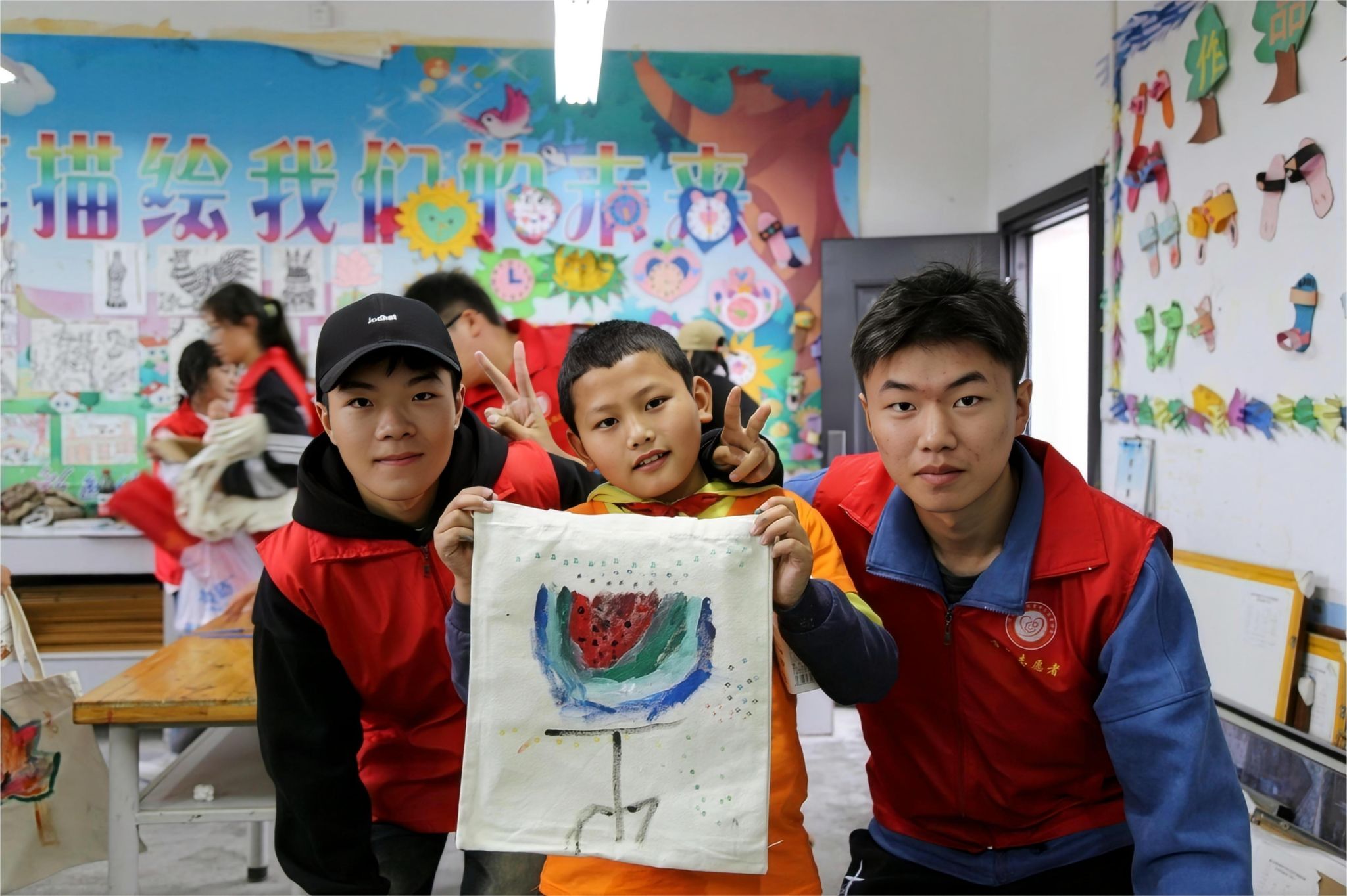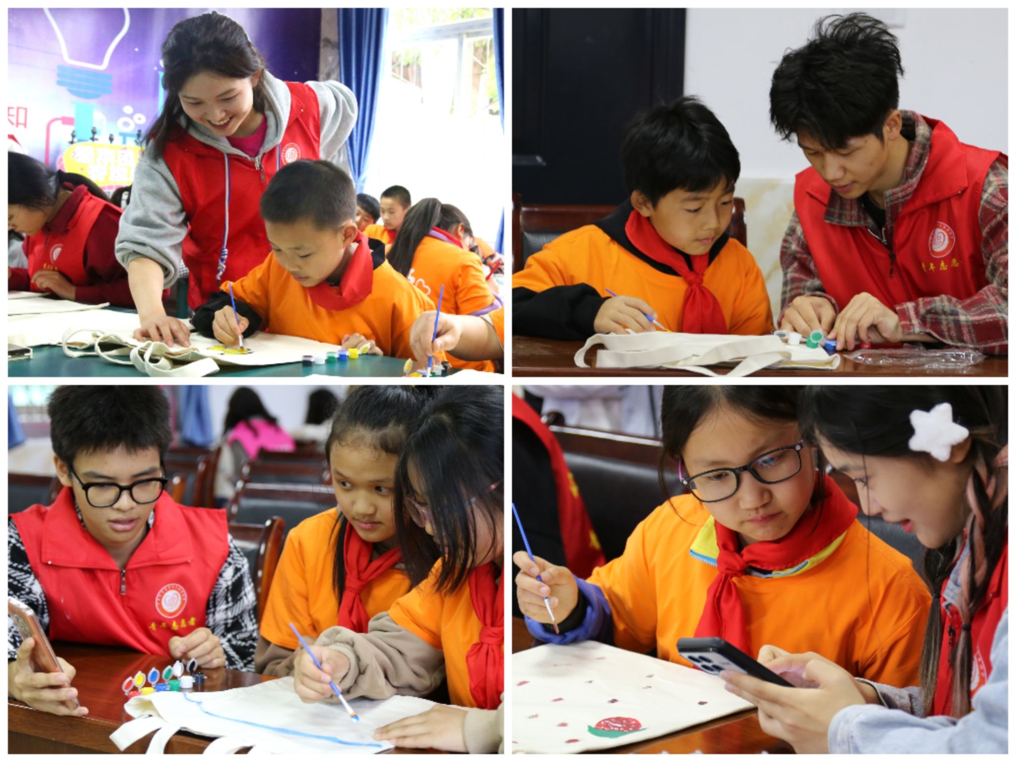 紧接着,本项目的第一次活动随即开展——春意满园DIY手作大比拼。孩子们在志愿者的陪伴下,用五彩斑斓的画笔在手提袋上描绘出自己的心愿和梦想。他们画出了美丽的花朵、高楼大厦、快乐的家庭……每个画面都充满了孩子们对未来的美好憧憬和无限期待。这个环节不仅锻炼了孩子们的创造力和想象力,更让他们在志愿者的陪伴下感受到了关爱和支持。志愿者们耐心指导,鼓励孩子们大胆表达自己的想法和感受,让他们在创作的过程中逐渐建立起自信和勇气。