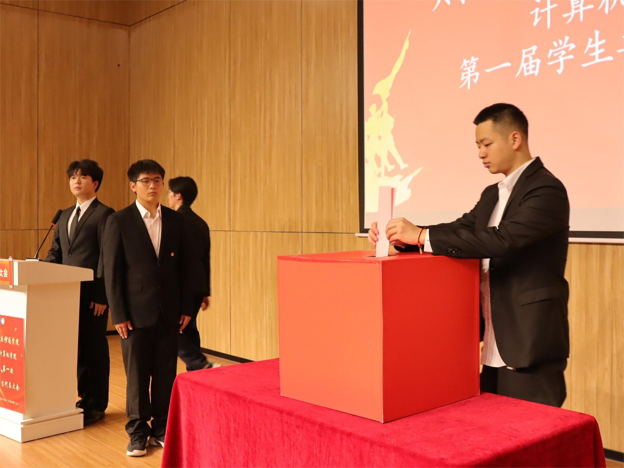 随后,李佳豪同学宣读《重庆移通学院计算机学院第一次学生代表大会代表资格审查报告》,计票员清点到会的正式代表人数,且总计票人解释选票规则:采用无记名式选票方式进行公开选举。在公平公正的选举过程中,正式代表们依次投下自己的票,在严格的监票过程,共同期待着计算机学院主席团成员的诞生。