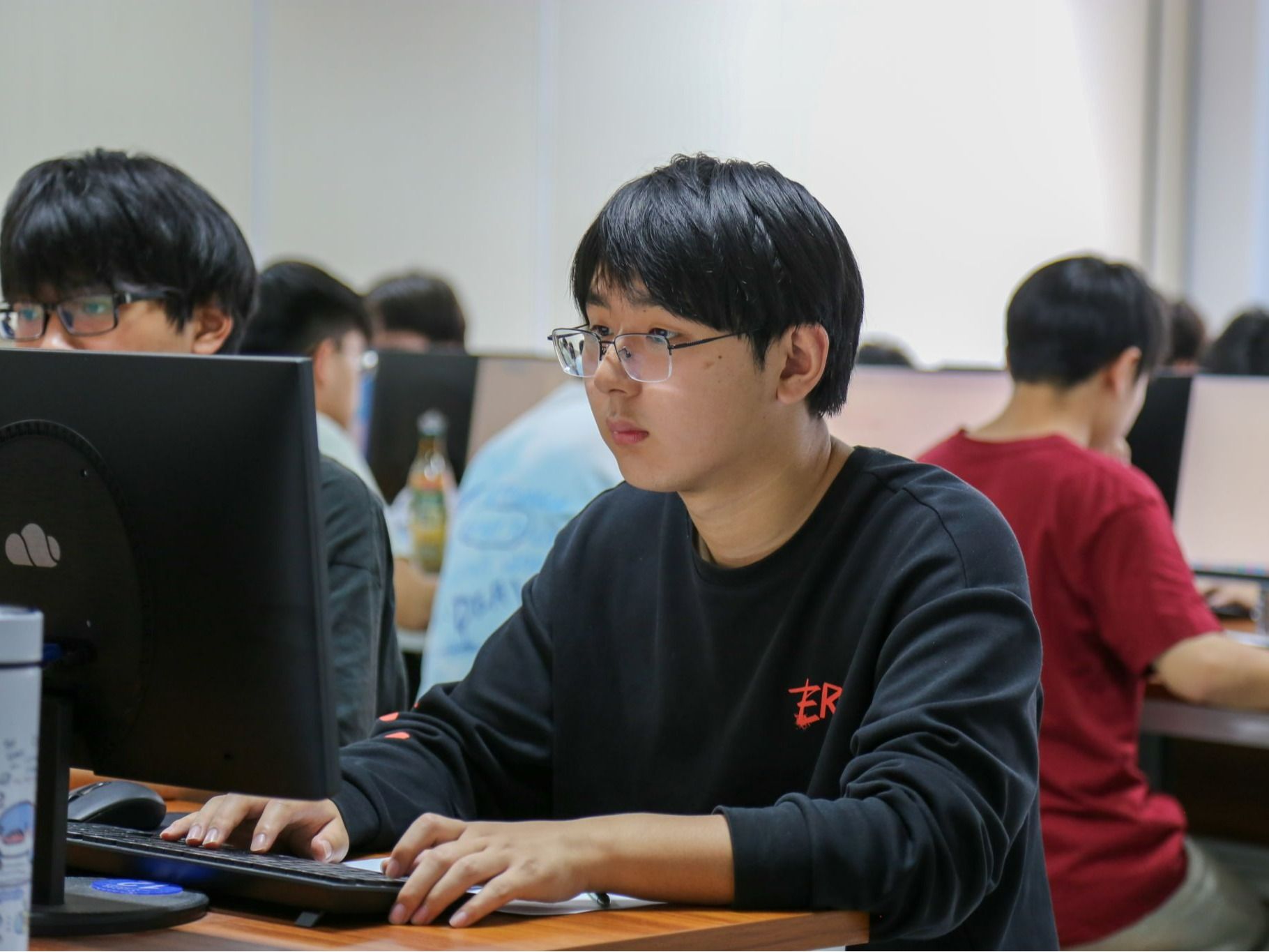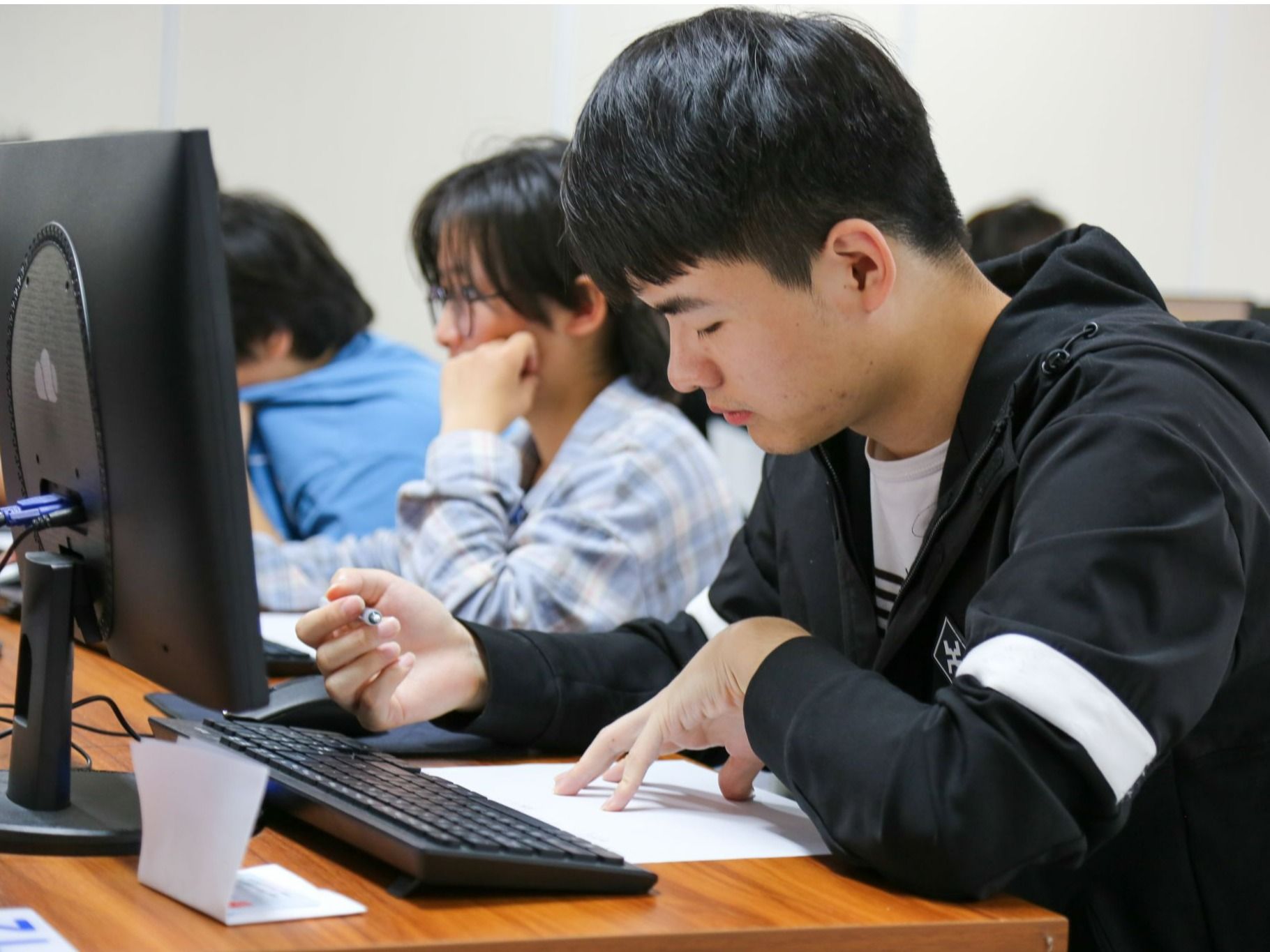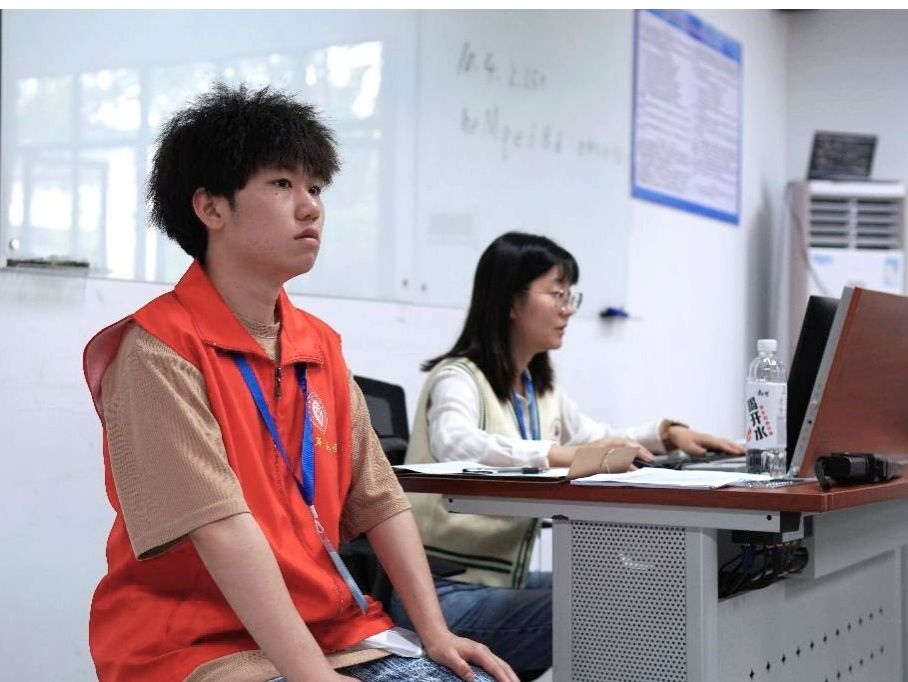 待参赛选手落座完毕,考试铃准时响起,告知比赛要求,宣布比赛开始。志愿者顺势加入到进监考队列,协助监考老师营造一个良好的考场风气,确保同学们在比赛中发挥出最佳水平。