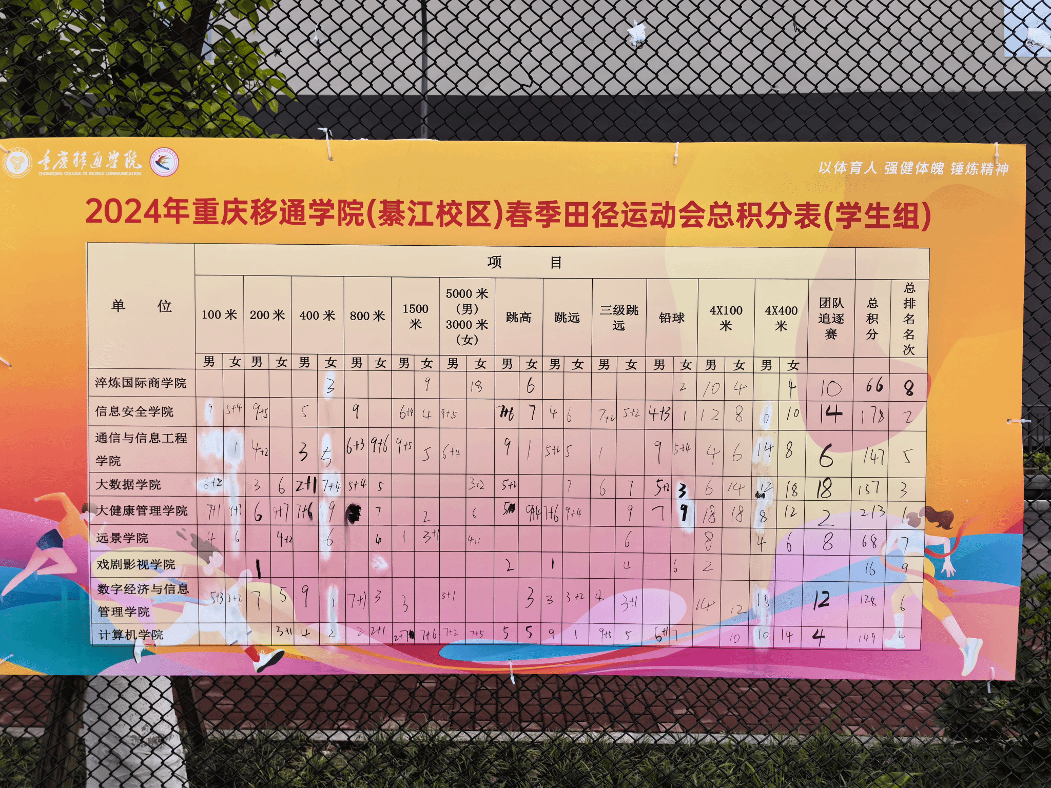 在本次运动会的团体比赛中,计算机学院同样取得良绩。2024年春季田径运动会计算机学院获奖情况如下: