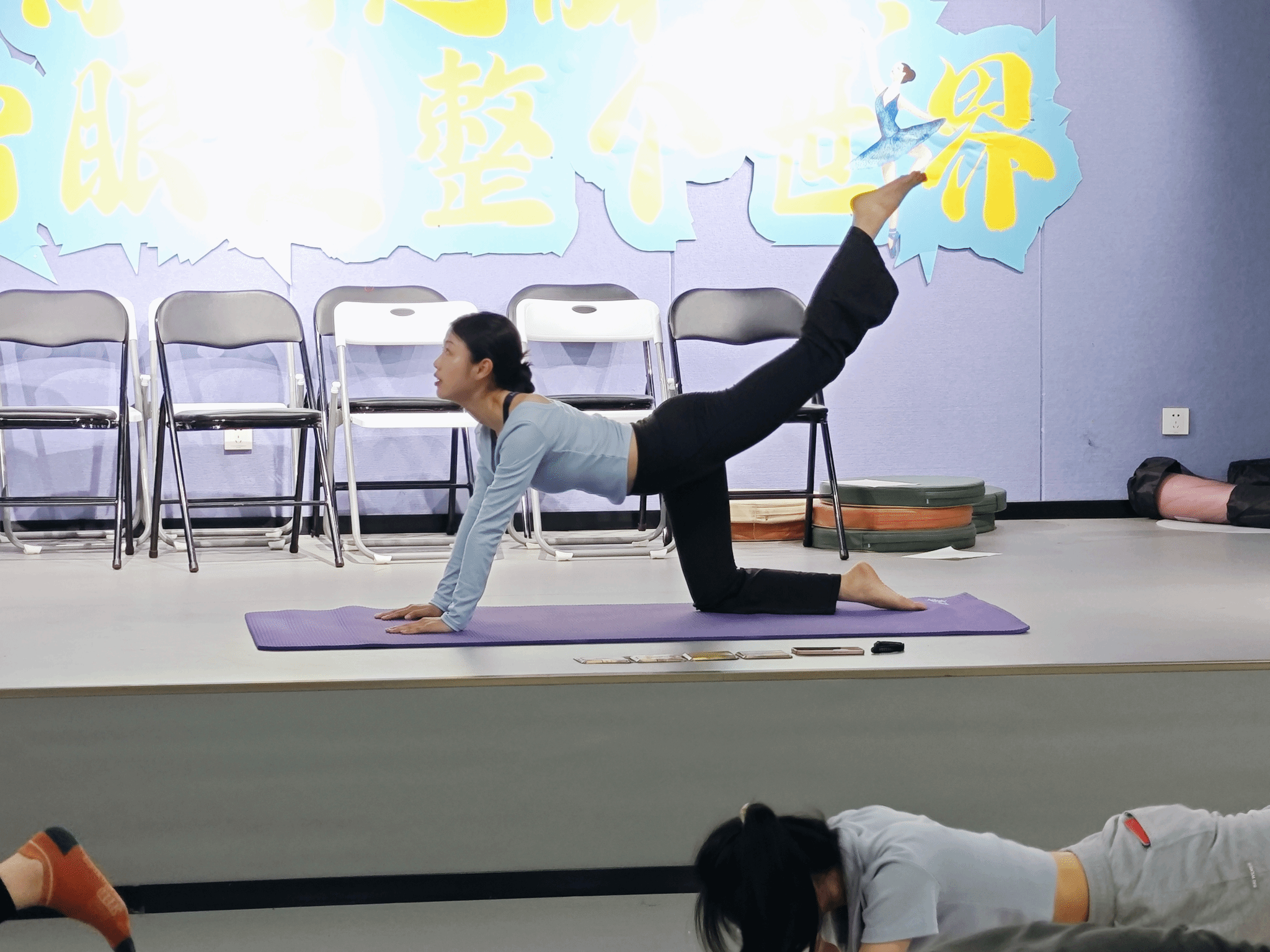 随后,带领大家从指尖到双肩,从脚趾到髋部进行热身,从俯卧体式到坐立体式,从站立体式再到休息术的练习,慢慢打开我们的身体。猫伸展平衡帮助同学们从呼吸、力量和平衡各方面感受自己的身体,唤醒身体的觉知;下犬式让同学们在拉伸大腿后侧的同时也锻炼到我们的肩颈。同学们专注又认真,充分调动全身机能,暂时放下生活中的喧嚣与压力,在静谧的环境中,配合着呼吸,专注练习。