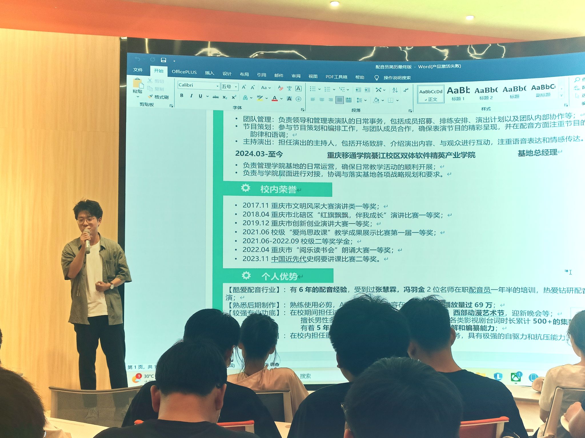 活动伊始,王浩然学长以他一贯的热情和亲切,向在座的同学们介绍了自己。他讲述了自己在大学期间策划和参与的多场大型活动,分享了自己在社区活动比赛中获得的荣誉和成就,例如在漫展上表演舞台剧,并赢得了重庆市社团艺术表演大赛的一等奖。这些经历不仅锻炼了他的组织和沟通能力,也让他对职场有了更深入的理解和认识。