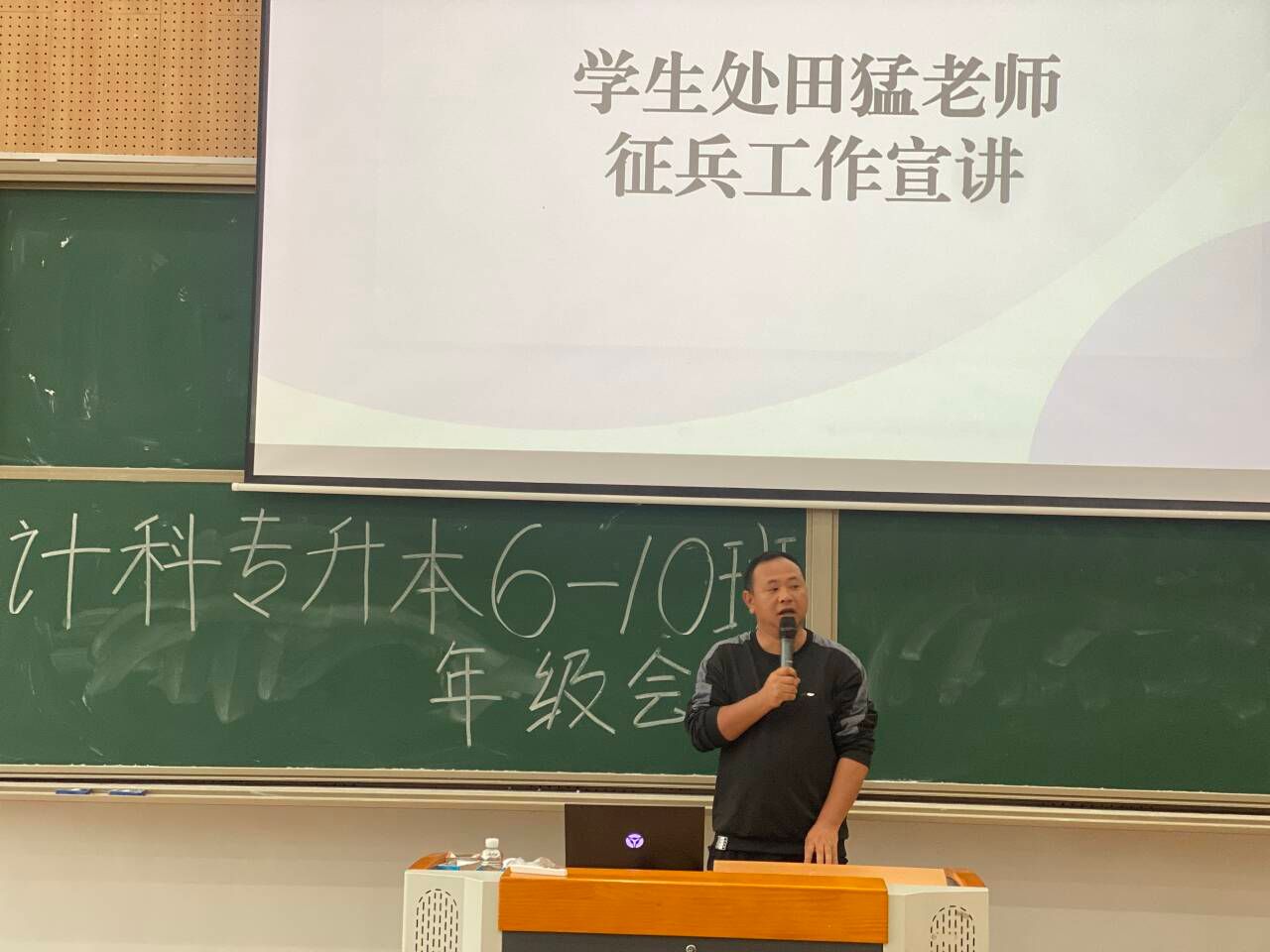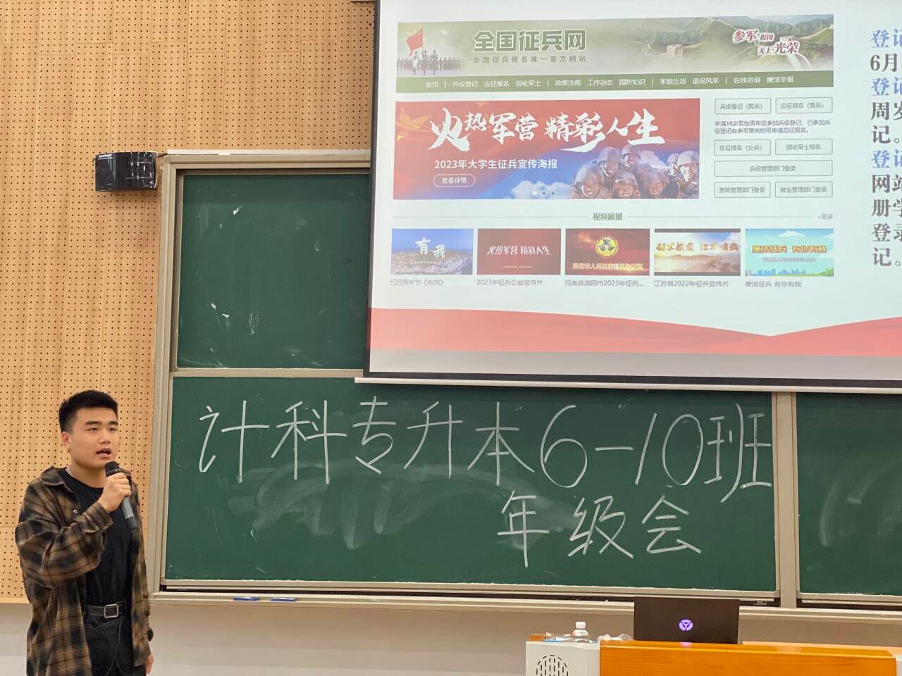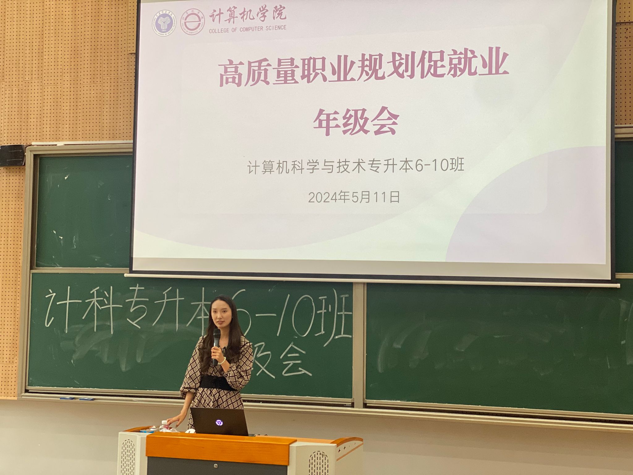 随着就业市场的不断变化和毕业生人数的逐年增长,如何高质量的职业规划已成为大学生顺利就业的关键。为了帮助同学们更好地规划职业生涯,提升就业竞争力,2023级计算机科学与技术专升本6-10班于2024年5月11日在横山书院阶梯教室召开了一场高质量职业规划促就业年级会,由辅导员刘玉凤主持,邀请到了学生处田猛老师,双体精英软件学院职场老师刘益,技术人员刘川以及退伍士兵张檬同学。本次年级会将从退伍士兵张檬分享、学生处田猛老师征兵工作宣讲、双体软件精英产业学院刘益老师宣讲、辅导员刘玉凤老师介绍西部计划以及五月安全教育提醒五个部分展开。