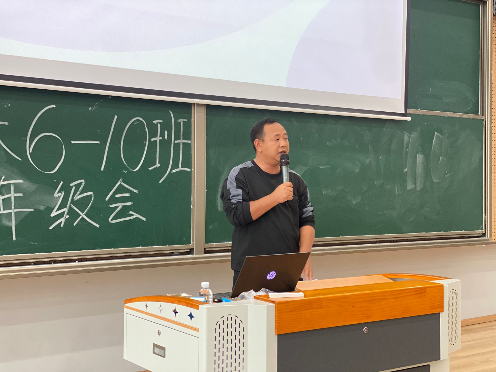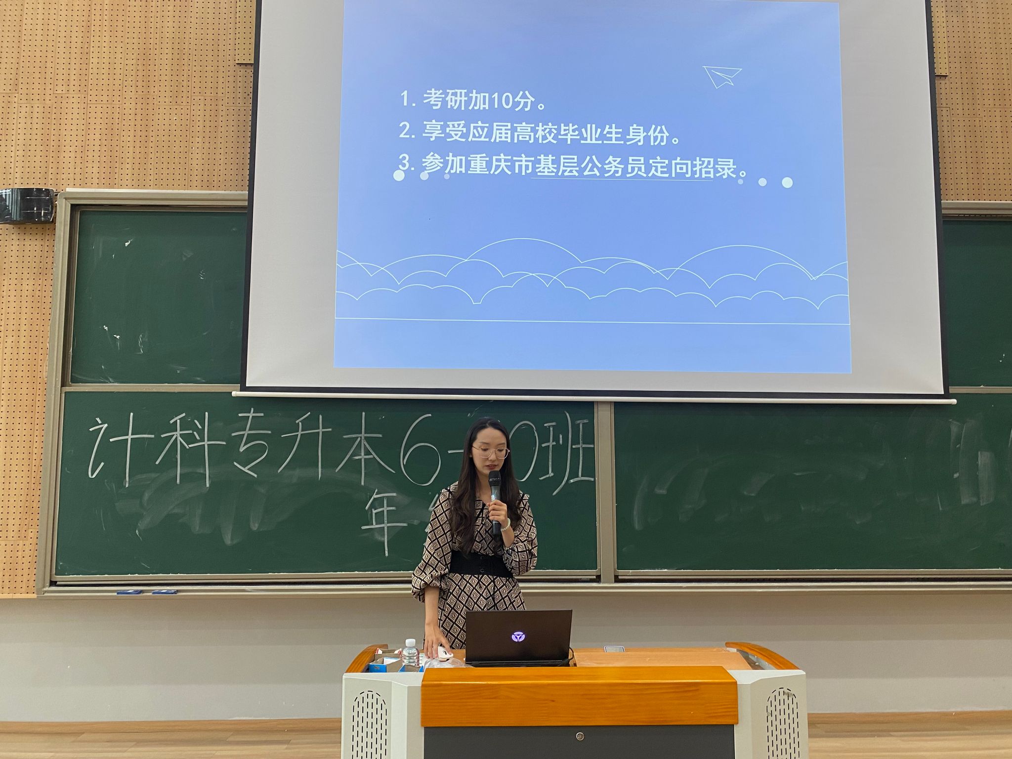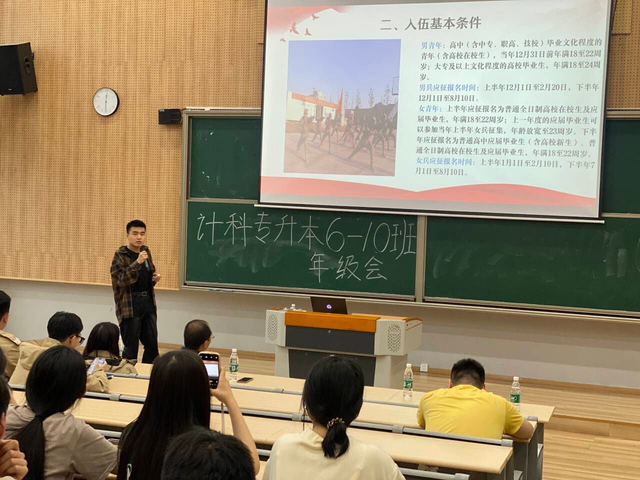 随着就业市场的不断变化和毕业生人数的逐年增长,如何高质量的职业规划已成为大学生顺利就业的关键。为了帮助同学们更好地规划职业生涯,提升就业竞争力,2023级计算机科学与技术专升本6-10班于2024年5月11日在横山书院阶梯教室召开了一场高质量职业规划促就业年级会,由辅导员刘玉凤主持,邀请到了学生处田猛老师,双体精英软件学院职场老师刘益,技术人员刘川以及退伍士兵张檬同学。本次年级会将从退伍士兵张檬分享、学生处田猛老师征兵工作宣讲、双体软件精英产业学院刘益老师宣讲、辅导员刘玉凤老师介绍西部计划以及五月安全教育提醒五个部分展开。
