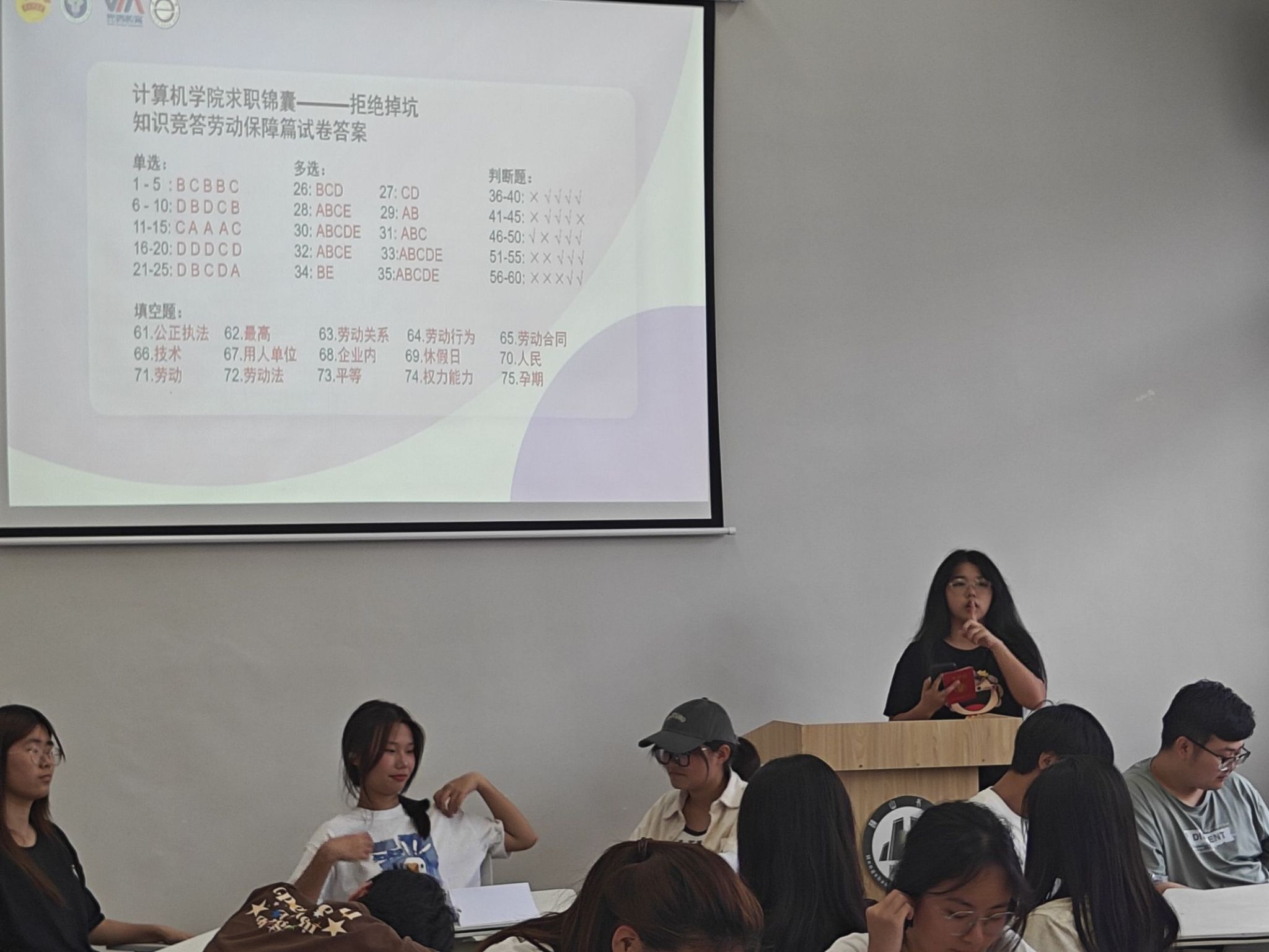 活动现场,学生们积极参与,热情高涨。就业创业助理团精心准备了一系列与劳动保障相关的题目,内容涵盖了劳动合同、工资支付、工作时间、社会保险等方面。同学们通过三人一组的小组竞答,充分展示了对劳动保障知识的理解和运用。经过几轮激烈的角逐,最终评选出了优胜者。