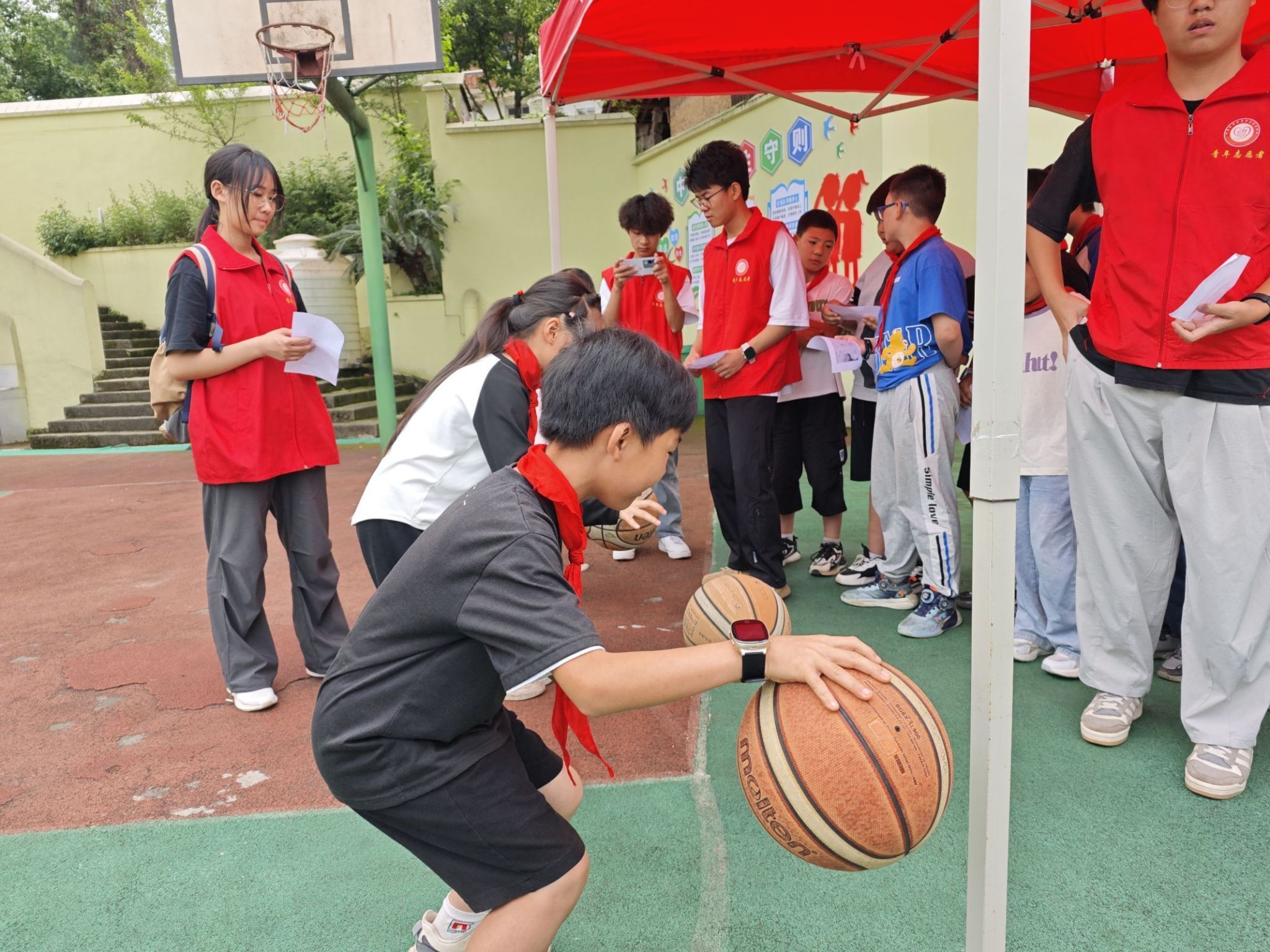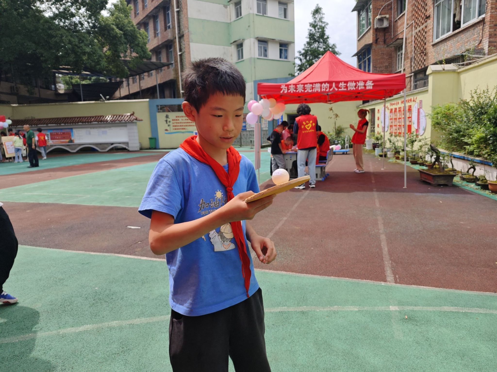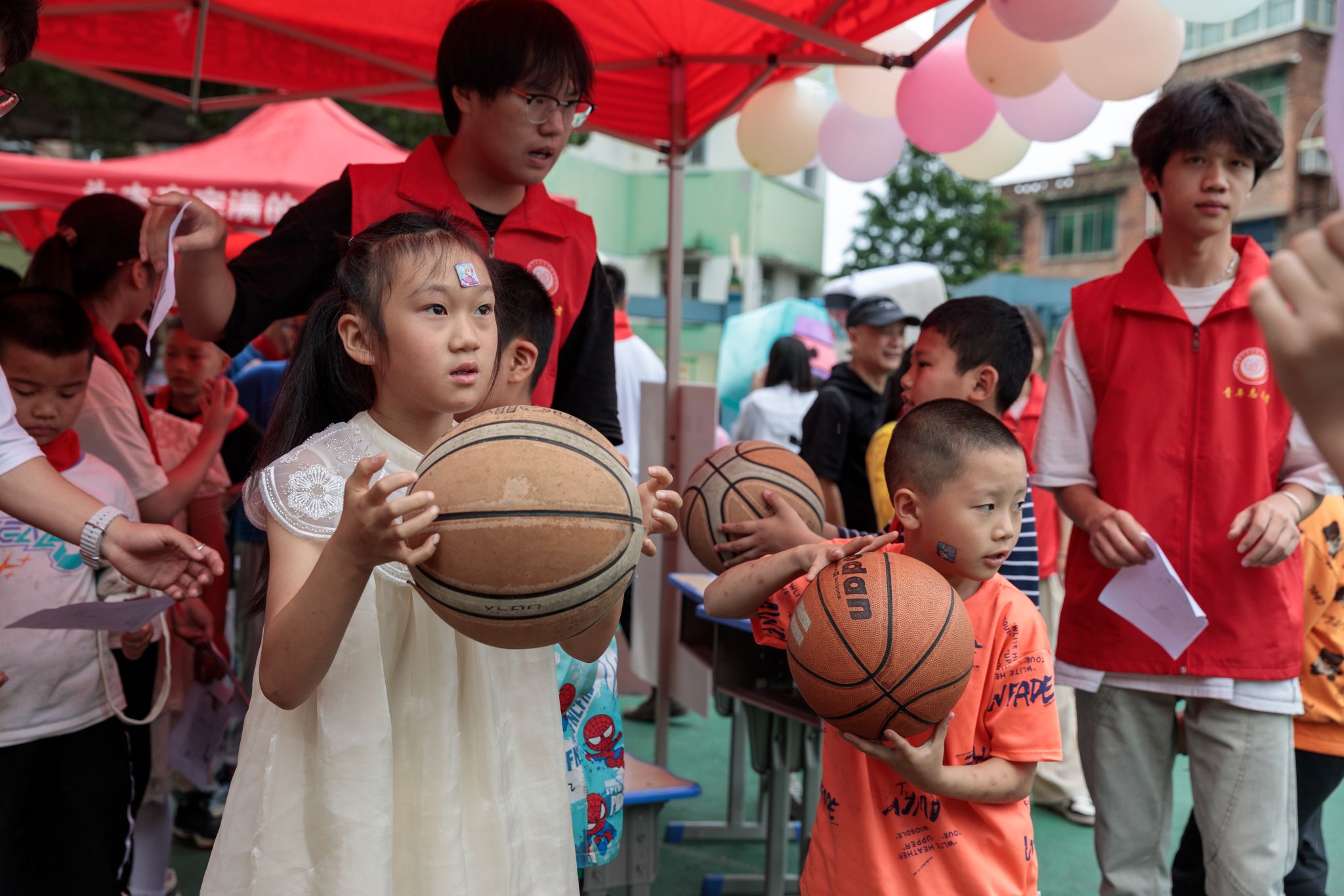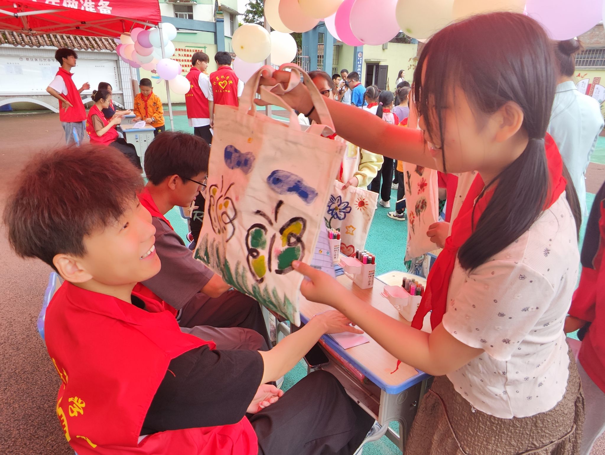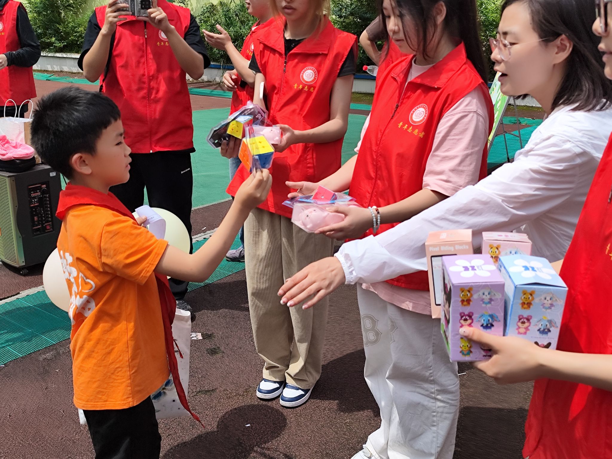 计算机学院的志愿者们也精心策划了一场以“智慧运动,欢乐游园”为主题的六一游园会活动。活动现场,孩子们和自己结对的大哥哥大姐姐们一起“快乐闯关”,积极参与原地拍篮球闯关挑战、帆布袋展示挑战、绕口令挑战、欢乐投壶、运送乒乓球等互动游戏。志愿者们根据孩子们的奖章个数为其分发了不同文创奖品。孩子们在游戏中展现了自己的智慧和勇气,和志愿者大哥哥大姐姐们一起,收获了欢乐和成长。