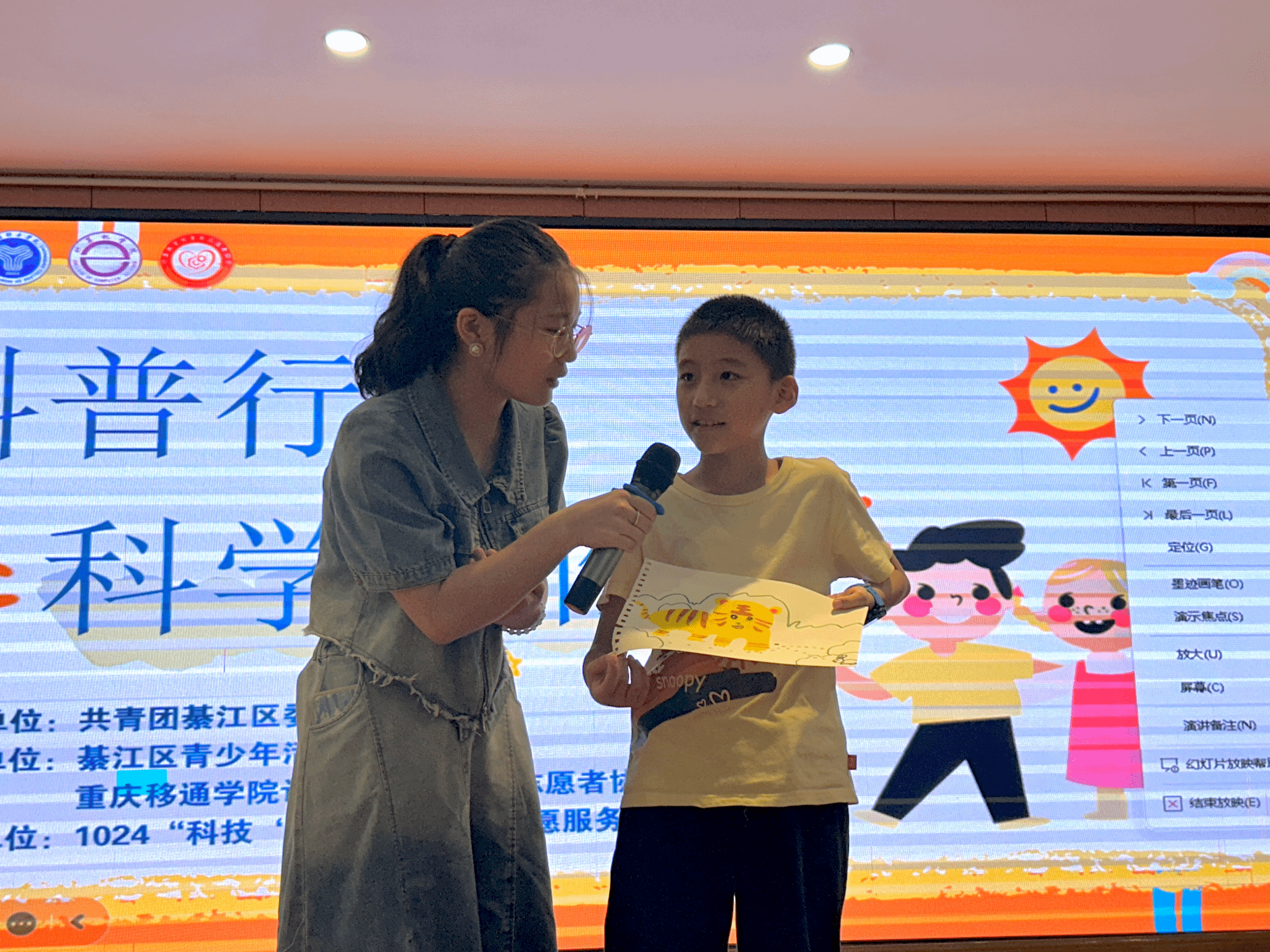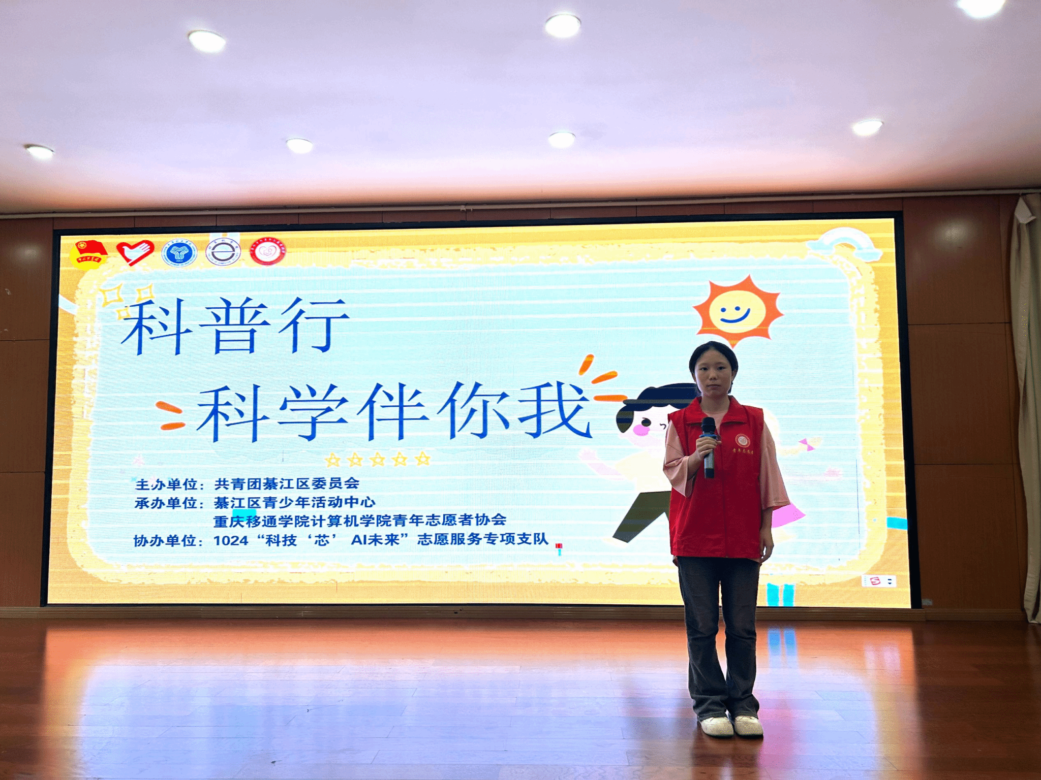 随着社会的发展,科学知识已成为学生日常生活中不可或缺的部分。由共青团綦江区委员会主办、重庆移通学院计算机学院青年志愿者协会承办、1024“科技‘芯’AI未来”志愿服务专项支队以及2024级计算机科学与技术16班、2024级计算机科学与技术17班、2024级计算机科学与技术18班协办的“社区科普行,科学伴你我”——社区科普主题活动,于2024年9月22日的10:00-11:00,在綦江区青少年活动中心顺利开展。本次活动,旨在通过介绍生活中的科学现象和实用科学知识,传播科学思想。以有趣的科普方面和形式,提高青少年的学习兴趣和参与度,使他们在轻松愉快的氛围中掌握科学知识,提高他们的科学素养和实践能力。