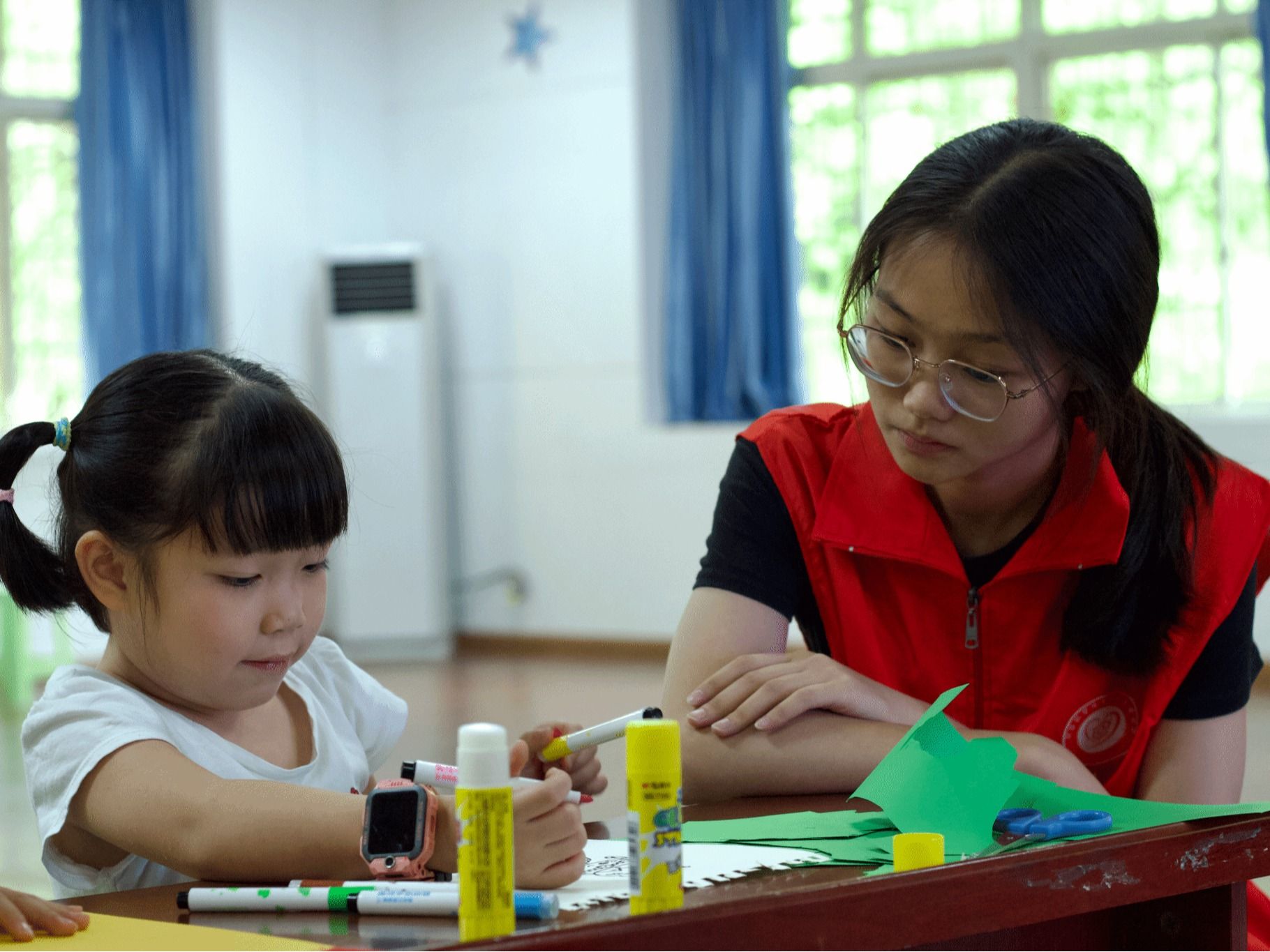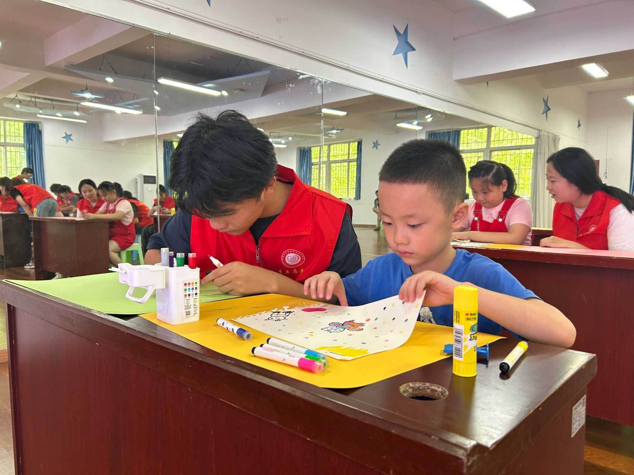 紧接着,志愿者们将准备好的纸板、彩纸、彩笔、剪刀及胶水,分发给小朋友们,并协助他们动手操作和完成“小小生态园建造师”游戏,获取奖励。志愿者们鼓励他们发挥创意,设计出独特的生态园景观。将制作好的元素按照规划布置在“生态园”基地上,形成一个完整的生态园模型。志愿者们面带微笑,眼神中充满了鼓励与耐心,他们或蹲或站,围绕着一张张铺满了彩纸的小桌子,穿梭在孩子们之间。“树上可以画什么?天上可以画什么?土地旁边要不要画条河......”志愿者们耐心地倾听孩子们的创意想法,伴随着脸上洋溢的纯真笑容,他们的小手紧紧抓着画笔,在画纸上尽情地挥洒着创意与想象。