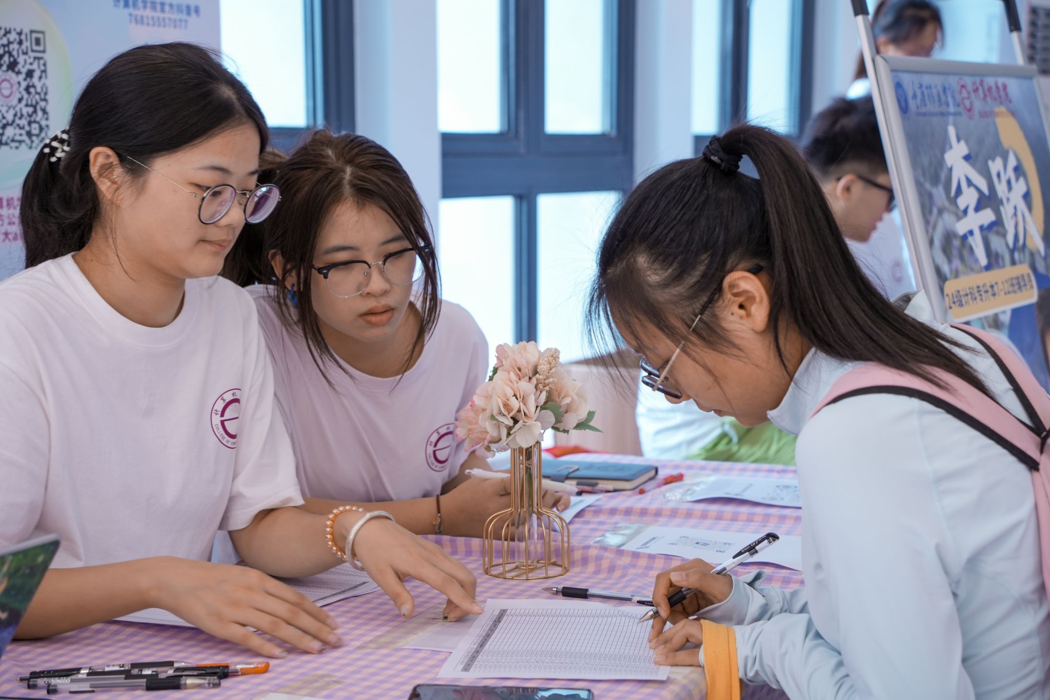 清晨时分,计算机学院的领导、辅导员以及迎新志愿者们便早早地抵达了计算机学院报到站点,他们如同迎接晨曦的第一缕阳光,满怀热忱与期待。他们精心筹备,准备了所有必需的报到材料,以确保新生在报名过程中能够顺畅无阻,避免不必要的麻烦。他们的身影忙碌而有序,为即将到来的新成员们铺设了一条温暖而顺畅的迎新之路。