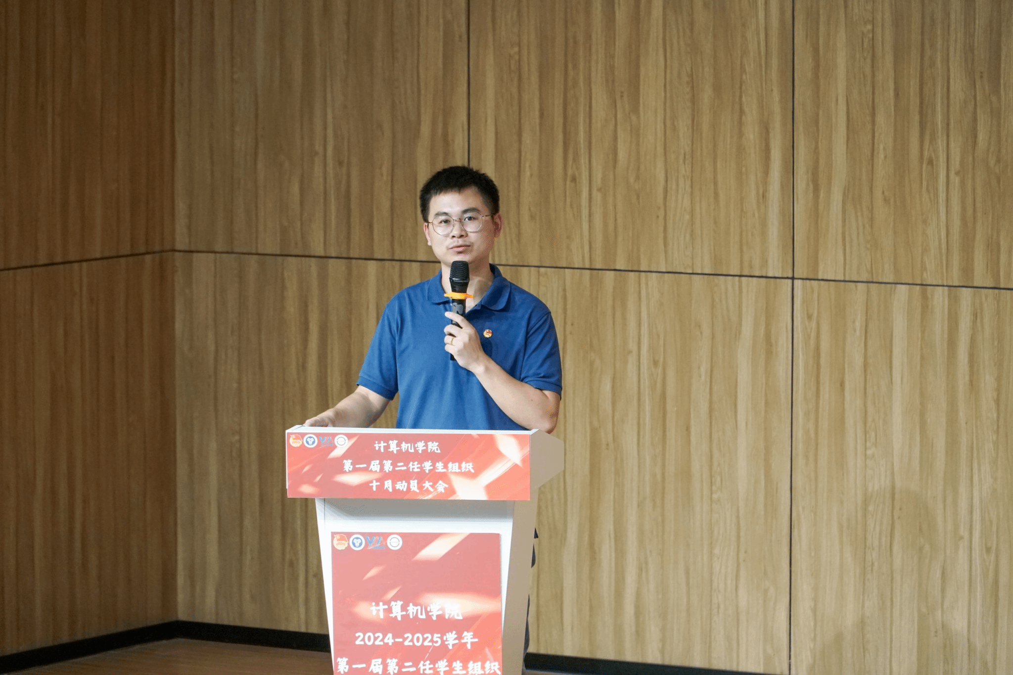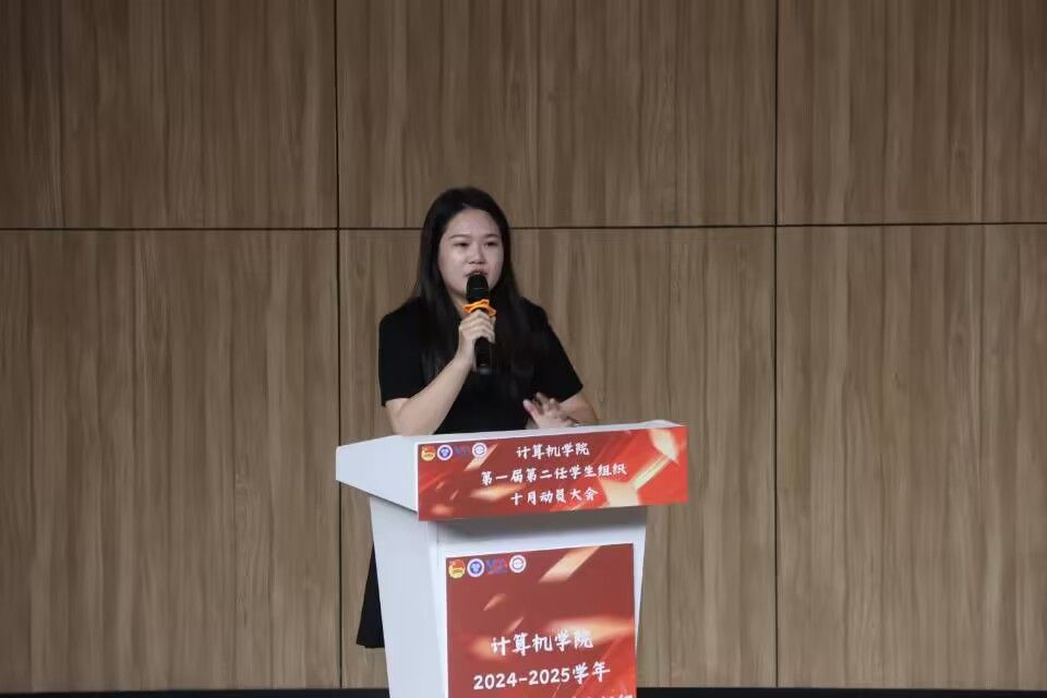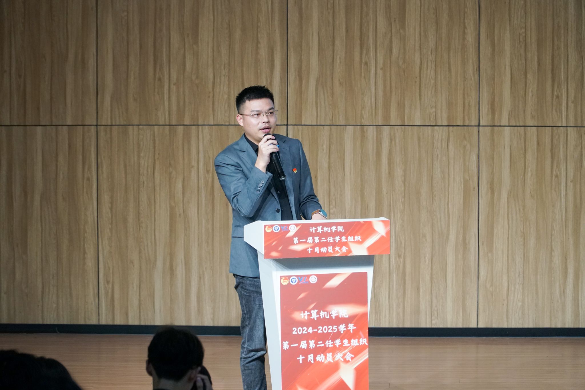 在金秋十月这个充满希望与收获的季节里,计算机学院第一届第二任学生组织十月动员大会于2024年10月23日在贤者楼多功能报告厅盛大召开。此次大会犹如璀璨的繁星,照亮了学院学生组织未来发展的道路,吸引了众多师生的目光,为校园增添了一抹别样的光彩。