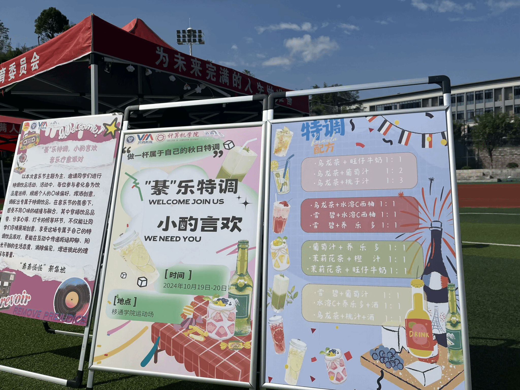 2024年10月19—20日,计算机学院学生会文艺部组织的“綦” 乐特调,小酌言欢音乐节外围活动在重庆移通学院綦江校区运动场举行。本次活动不仅展现了特调艺术的独特魅力,也为参赛者们带来了丰富多彩的感官享受。