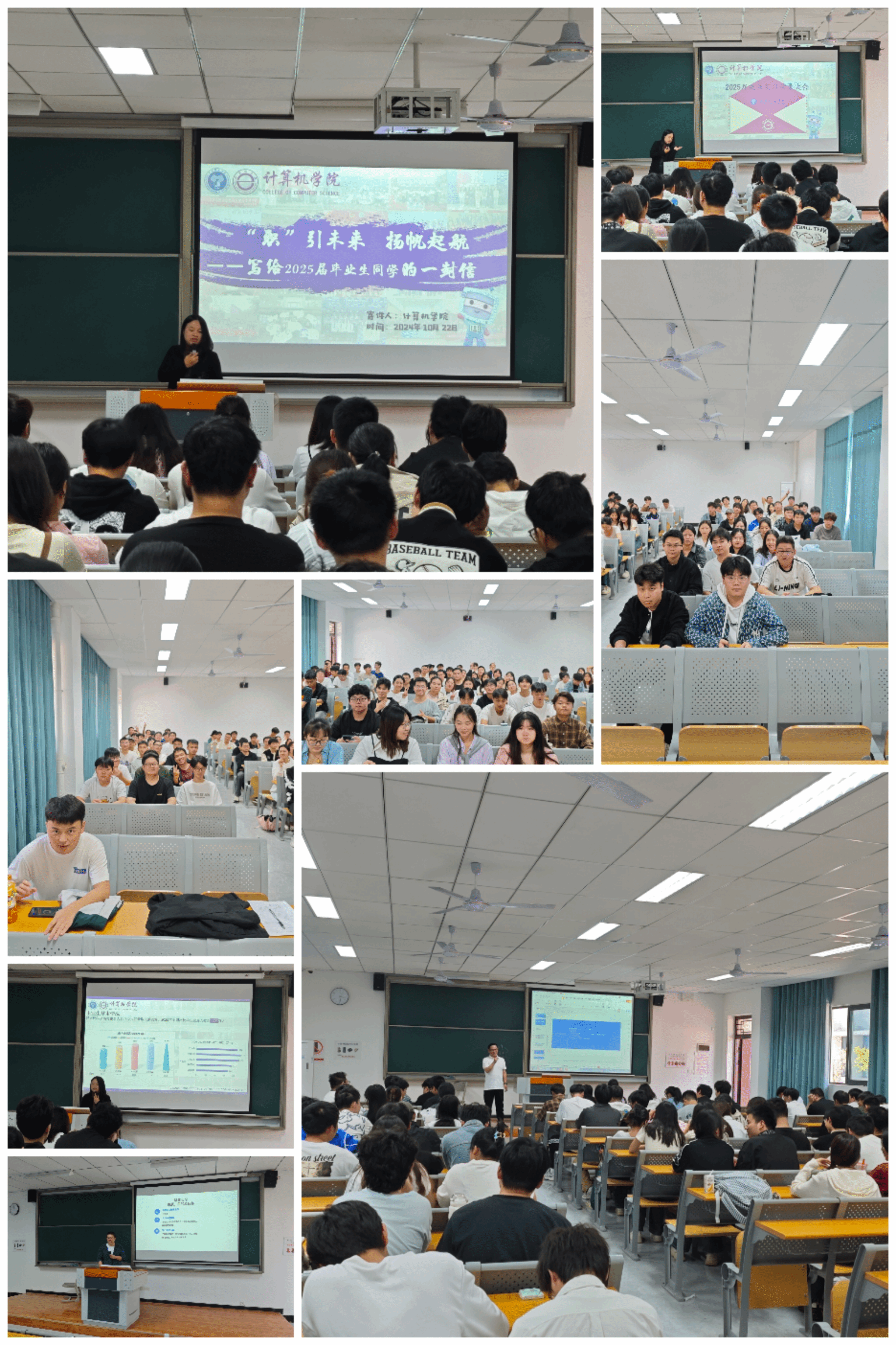 为全面推进落实学院2025届毕业生就业工作,引导毕业生树立正确的就业观念、了解就业形势、学习就业政策、明确个人方向、增强就业紧迫感和危机感,计算机学院于10月22日15:00在贤者楼131报告厅召开了2025届毕业生秋季就业动员大会,本次大会邀请学院院长向碧群、教学副院长林泽金、学工副院长周俊、教研室主任王强以及全体2025届毕业班辅导员出席,21级计科同学以及23级计科专升本1-5班全体同学参加。