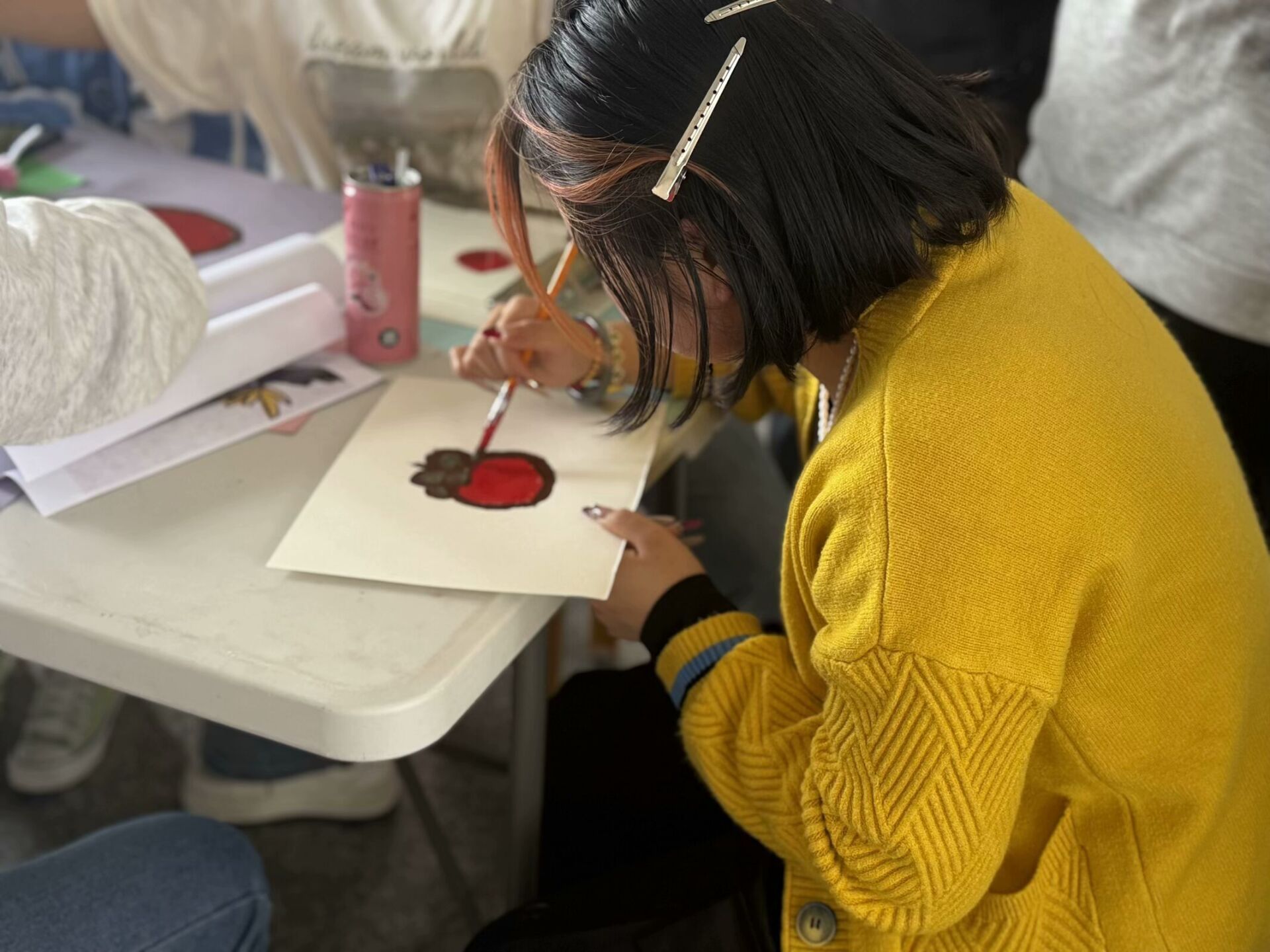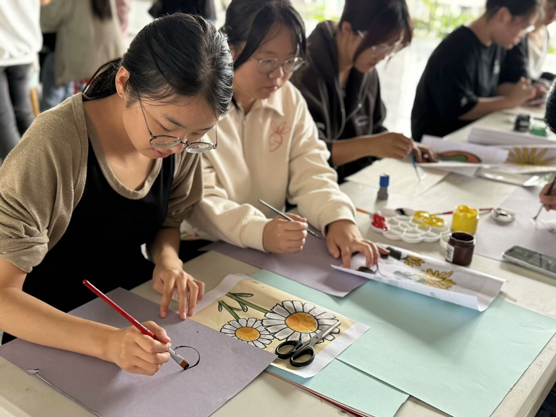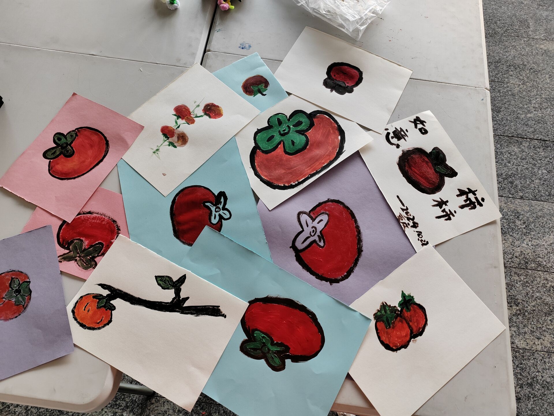 随后,志愿者们准备了丰富多彩的卡纸,和参与者们一同发挥自己丰富的想象力,用画笔和剪刀在彩色卡纸上创造出独一无二的图案。在这个环节中,参与者们尽情挥洒创意,有的细致勾勒出柿子的圆润饱满,有的则是大胆用色,将菊花的美丽姿态展现得淋漓尽致。大家在艺术创作的过程中享受到了无限的乐趣,每一幅作品都是对传统文化的独特诠释和个人情感的真挚表达。