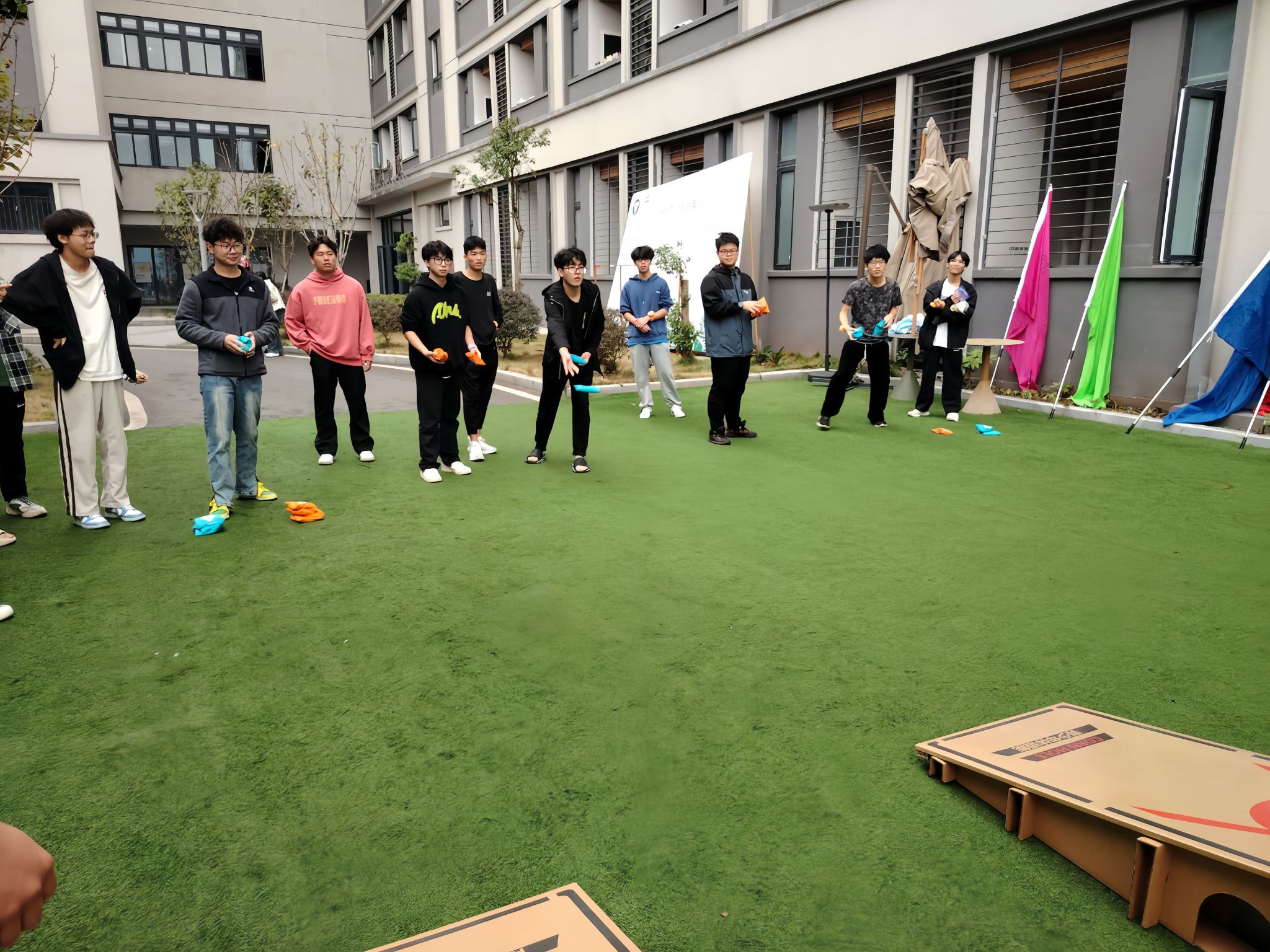 随着开幕式结束,同学们跟着工作人员去向不同的游戏区域。“掼蛋”游戏区域,几张方桌整齐排列,周围围满了观战的同学。空气中弥漫着紧张而又兴奋的氛围,每当有人打出精彩的组合或成功拦截对手的攻势时,周围便会爆发出阵阵欢呼和掌声。而“美式布袋球”则是一款充满趣味的投掷游戏,看着布袋在空中划过一道优美的弧线,然后精准地落在目标区域,同学们心中成就感是无法言喻的。而在室内的一角,“桌面冰壶”比赛正悄然进行。这里相对安静,但却散发出紧张与期待的气氛。参赛者们围成一圈,专注地盯着桌面上的冰壶轨道,每一次推杆都小心翼翼,力求精准无误。观赛的同学也不甘寂寞,纷纷讨论着最佳策略,偶尔还会为选手提供建议。