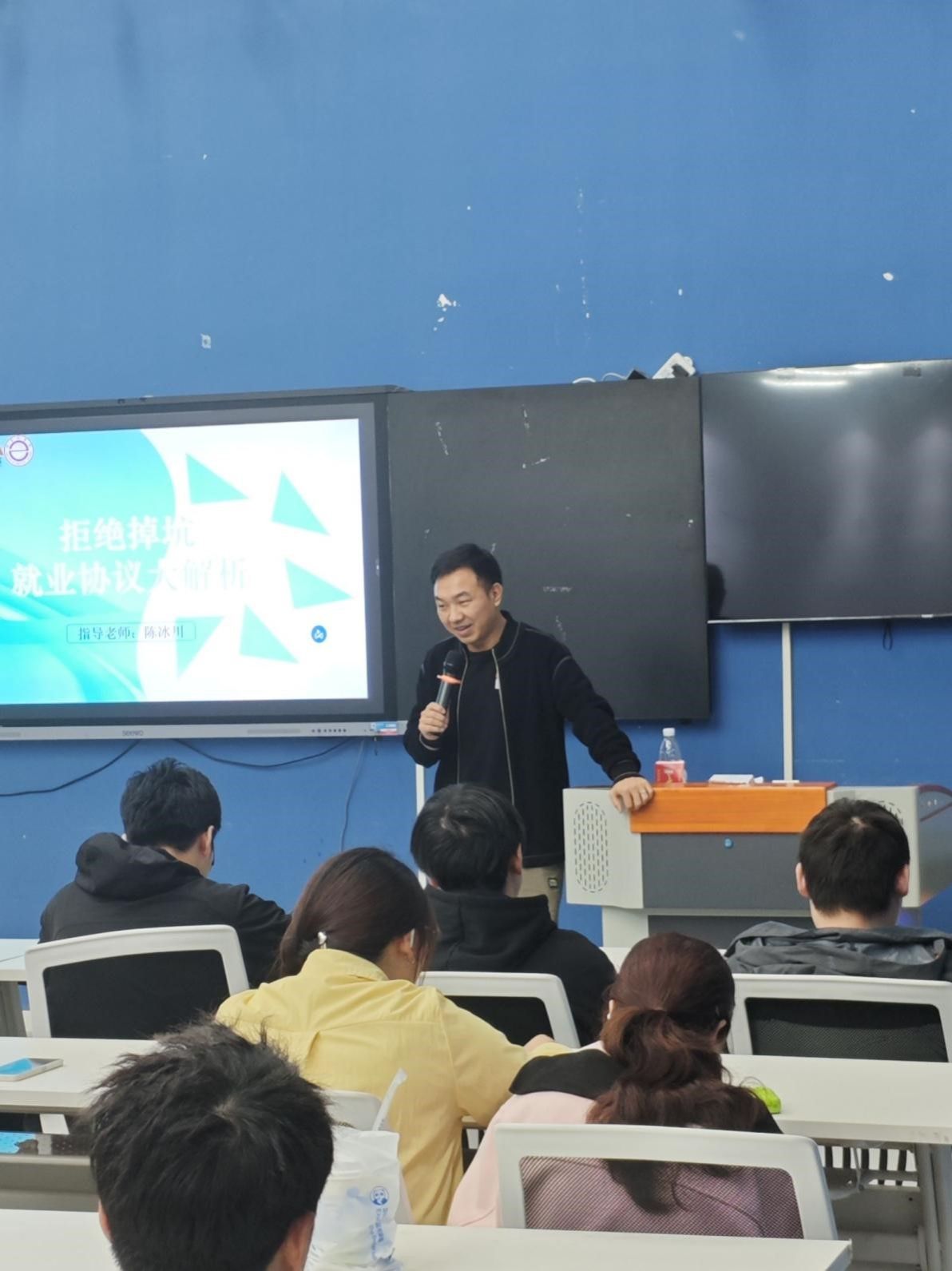 讲座伊始,现场座无虚席,同学们对这一关乎自身未来的主题充满期待。本次讲座邀请到了就业创业导师库成员陈冰川老师作为主讲人。陈冰川老师指出,就业协议是毕业生与用人单位在正式确立劳动人事关系前,经双向选择,在规定期限内确立就业关系、明确双方权利和义务而达成的书面协议,它对于同学们来说意义重大,但其中也暗藏不少容易被忽视的问题。