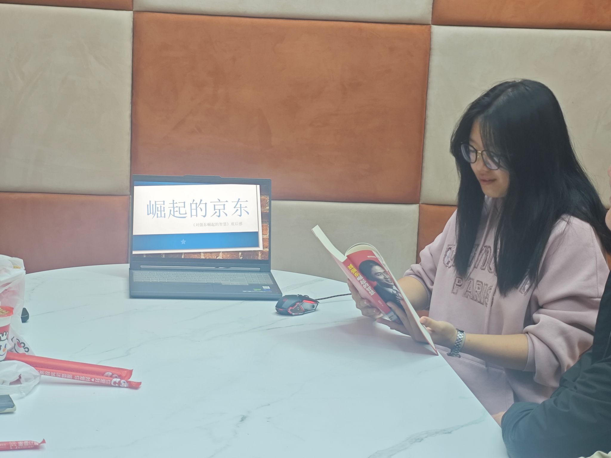 本次分享会旨在通过阅读《刘强东崛起的智慧》这本书,带领同学们领略到刘强东的不同于常人的商业信念、思想和策略,以及他和团队非凡的创新能力。会议开始由冀思彤同学介绍了《刘强东崛起的智慧》这本书的大致内容,还深入剖析了刘强东的创业智慧和人生态度。“读完《刘强东崛起的智慧》,让我深刻体会到坚持的力量,刘强东面对重重困难却从不言弃,这让我在面对学业难题时也有了更多的勇气。”冀思彤同学感慨道。徐弘一表示:“刘强东的创新思维太震撼我了,他在商业布局上的眼光独特,让我明白创新是成功的关键,无论是在未来的创业还是工作中,我都要努力培养自己的创新能力。”牛青峰同学直言:“这本书里蕴含的团队管理智慧,对我们参加社团活动等集体事务有着很大的启发,就像刘强东打造京东团队一样,凝聚力和目标感是团队前行的重要动力。”