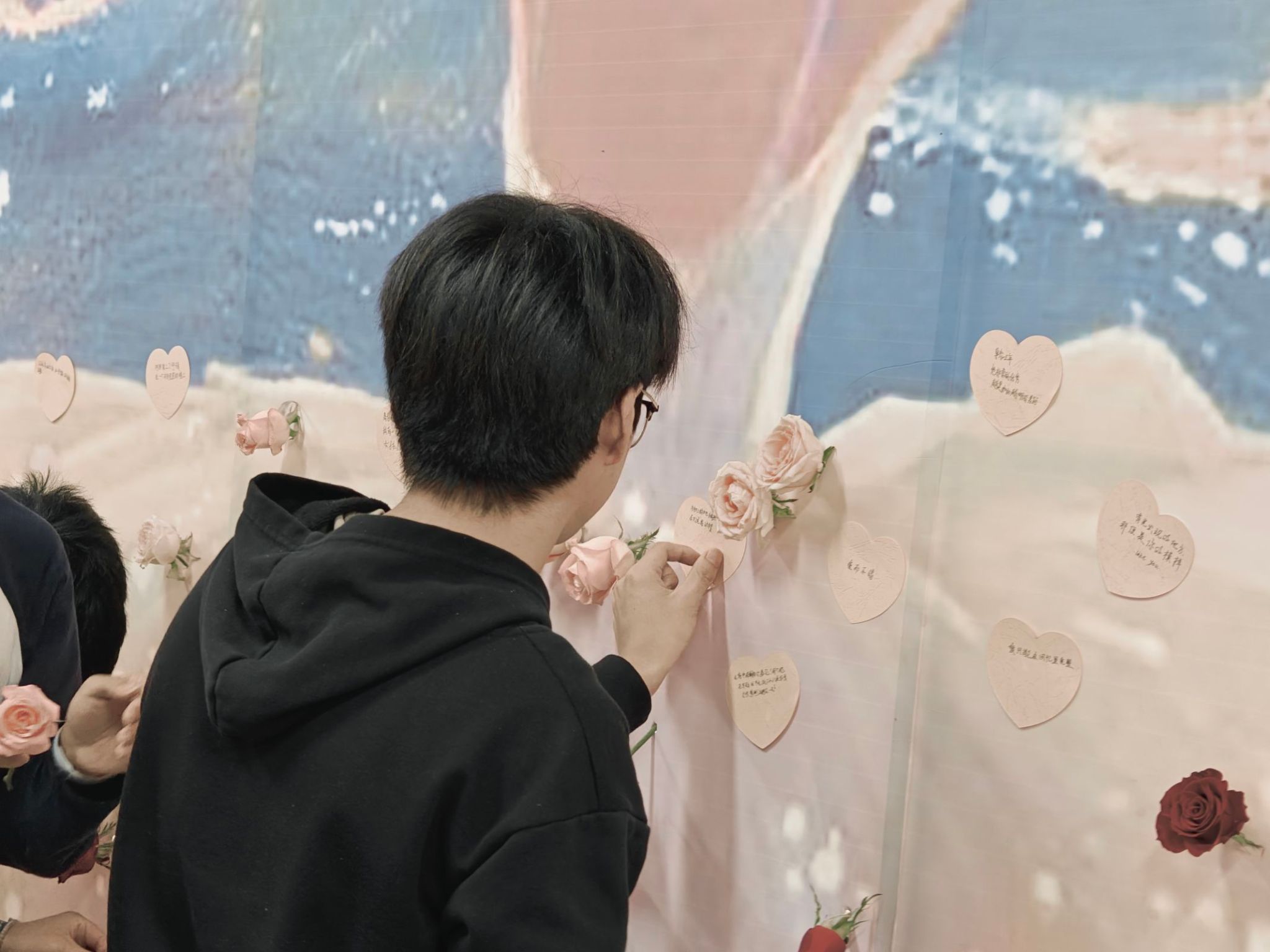 在故事换花环节,同学们积极写下自己的爱情故事以及对爱情的理解和期待,带着属于自己的那朵鲜花,继续向着美好的未来前进。有的同学认为爱情是相互扶持,共同成长;有的同学则强调爱情需要责任和尊重。老师在总结时说道:“爱情不是一颗心去敲打另一颗心,而是两颗心共同撞击的火花。”这句话引起了同学们的深思。
