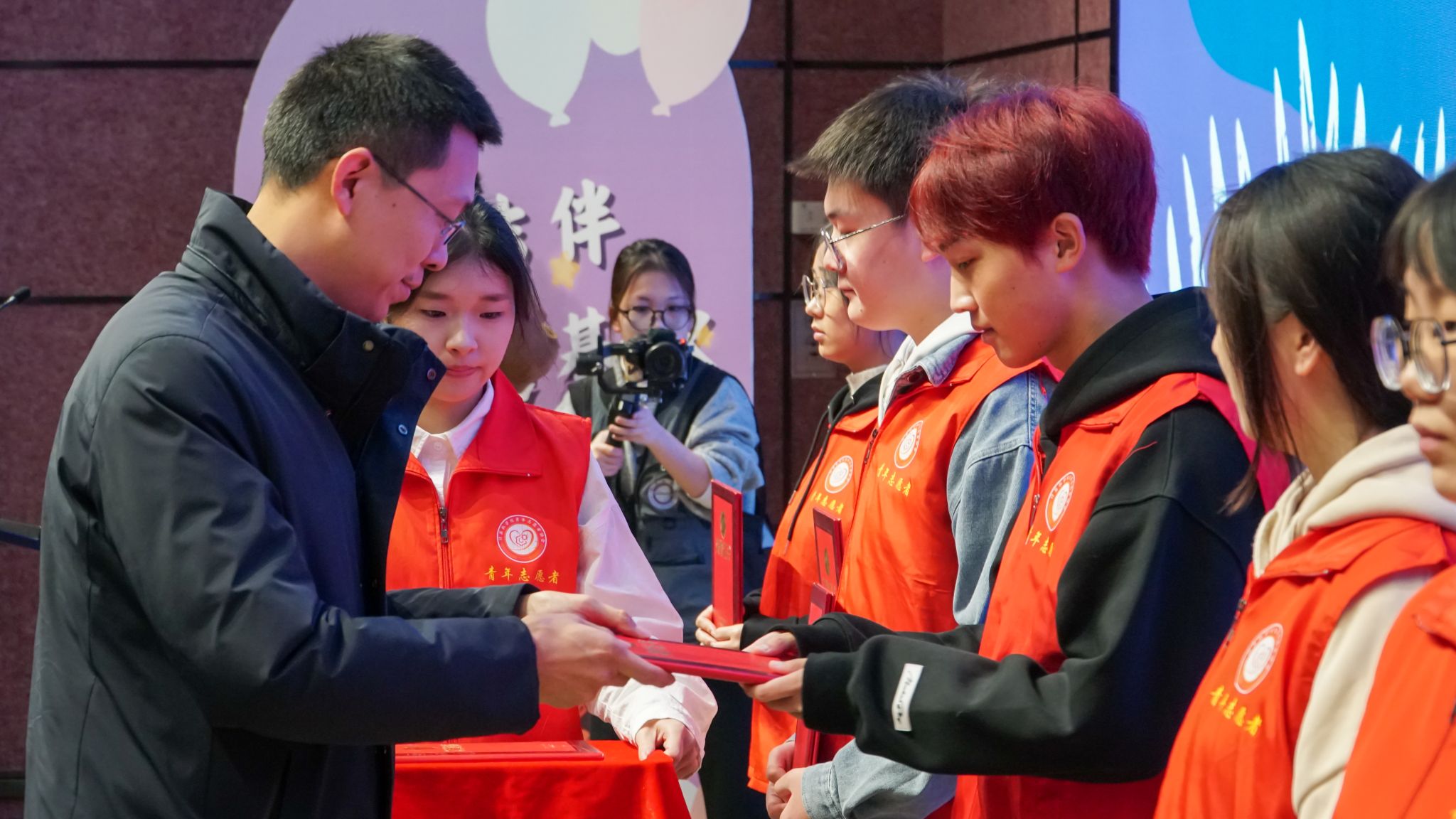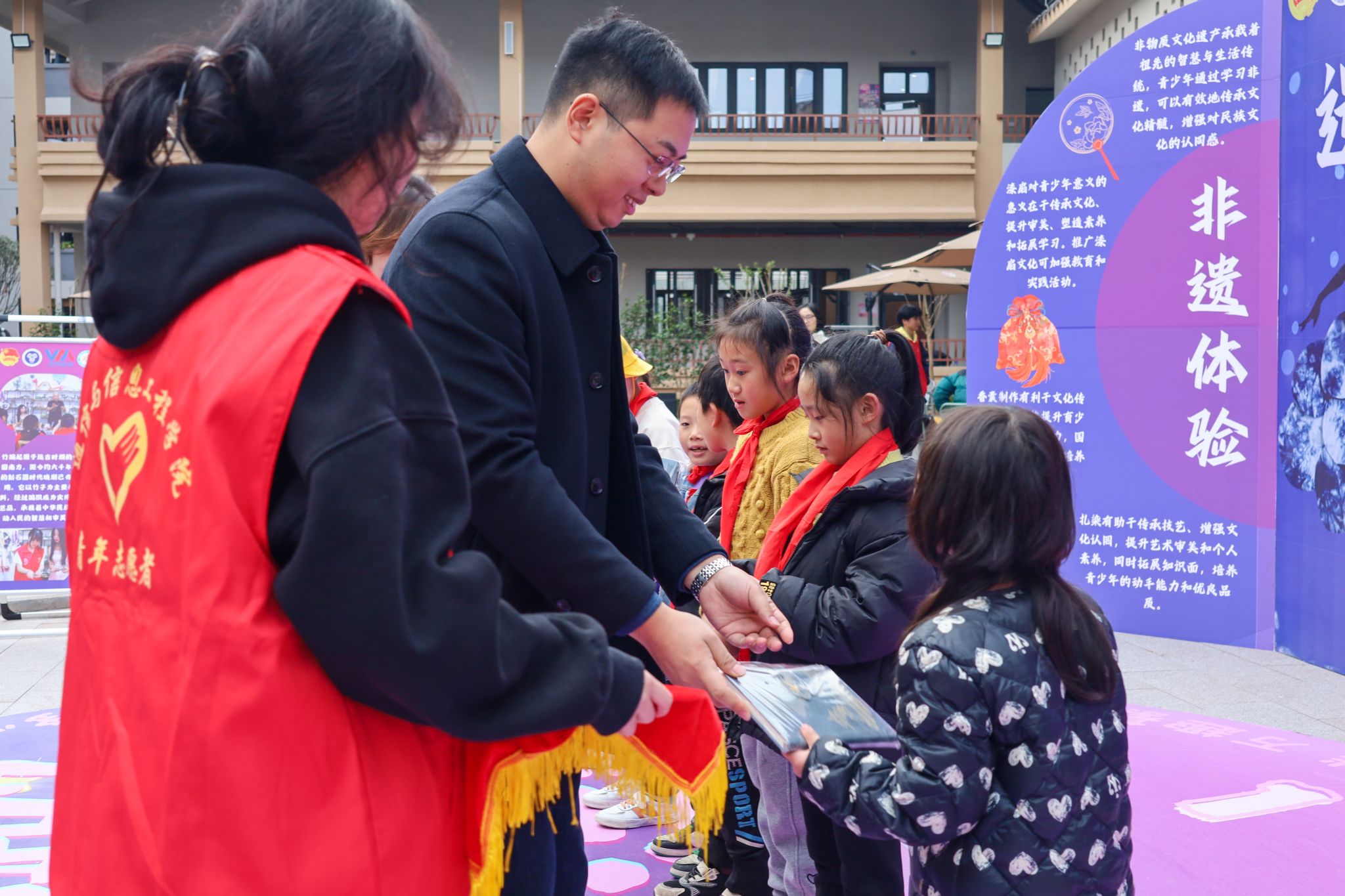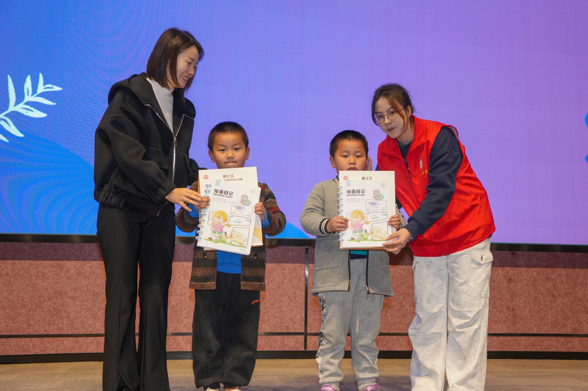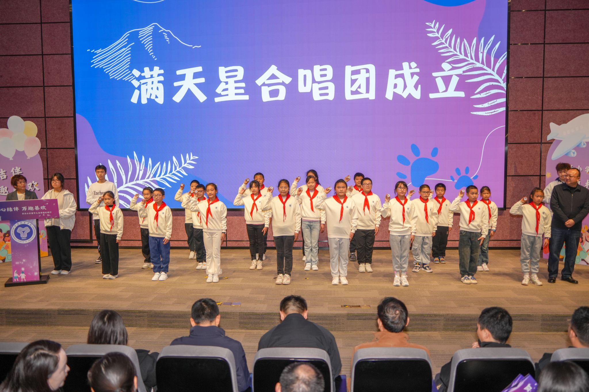 表彰环节,团綦江区委副书记刘刚为优秀志愿者代表颁发了优秀志愿者证书。这一荣誉不仅是对志愿者们辛勤付出的肯定,更是对他们无私奉献精神的赞扬。紧接着,活动迎来了最为激动人心的时刻——万兴小学满天星合唱团成立,并带来了他们的首秀表演《想要说声谢谢你》。孩子们悠扬婉转的歌声表达了对美好生活的向往和对志愿者的感激之情,现场观众无不为之动容。在王校长和向院长的共同见证下,合唱团成员佩戴上了专属徽章,这一刻,他们有了新的身份。