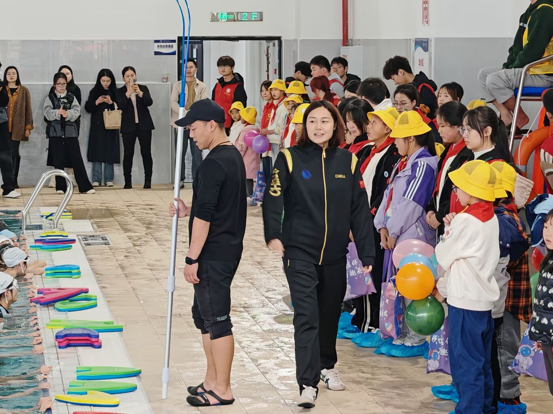 观影结束后,穿过长廊来到游泳池,校队表演早早做好了准备。恒温的泳池,精彩的表演,小朋友们激动的尖叫,有的还拿起小水枪和游泳队成员玩起了互动,欢乐声和水花声充满整个空间。