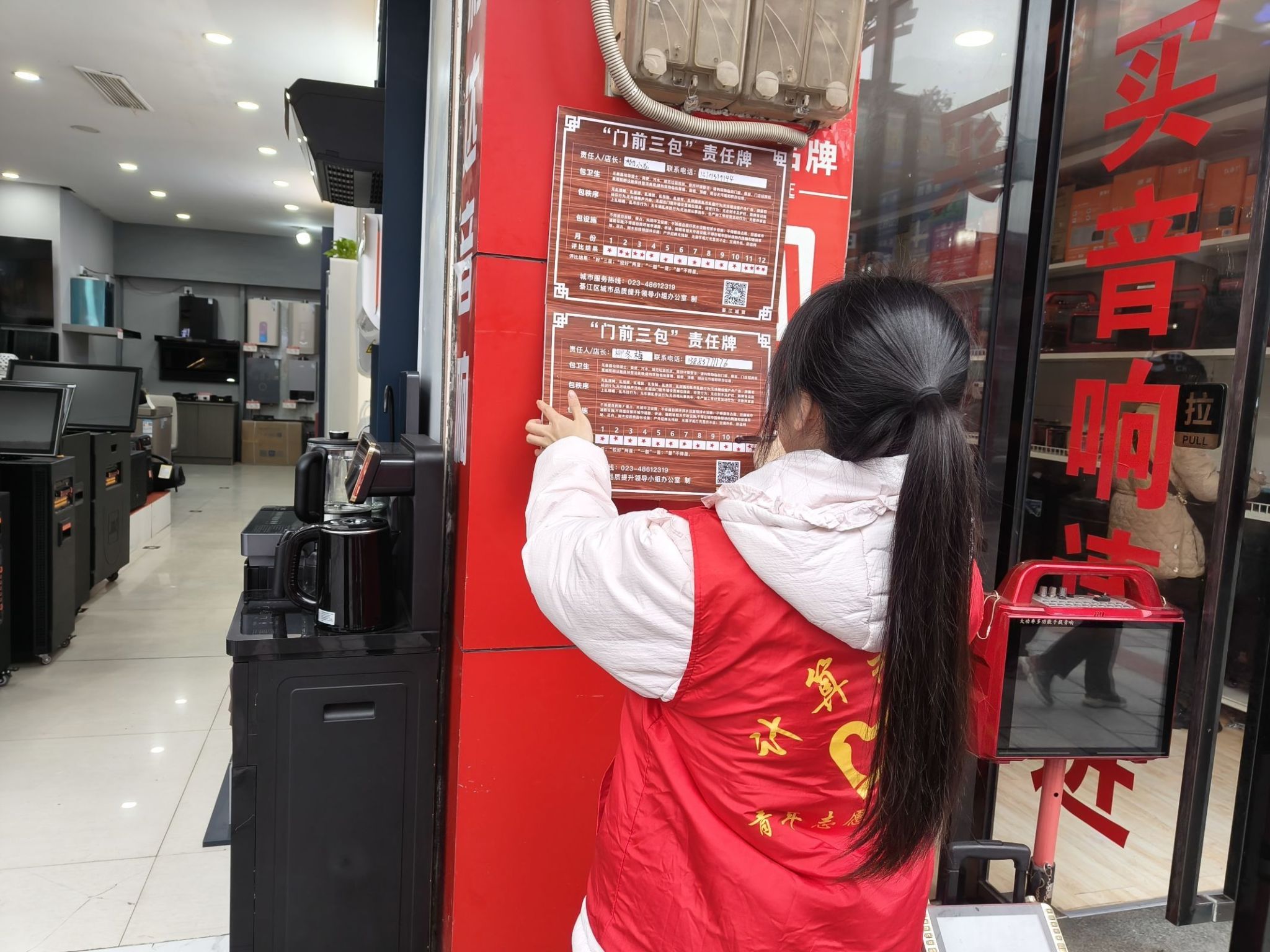接着是贴责任牌行动。志愿者们拿出提前准备好的牌匾,跟随社区负责人前往街区,通过跟商铺负责人的积极沟通,他们一起在商铺的门前贴上“门前三包”责任牌。以此提醒居民共同维护社区环境,呼吁更多人参与到环境保护中来。活动接近尾声时,志愿者们组织与老人们合影留念,记录下这一美好的时刻。