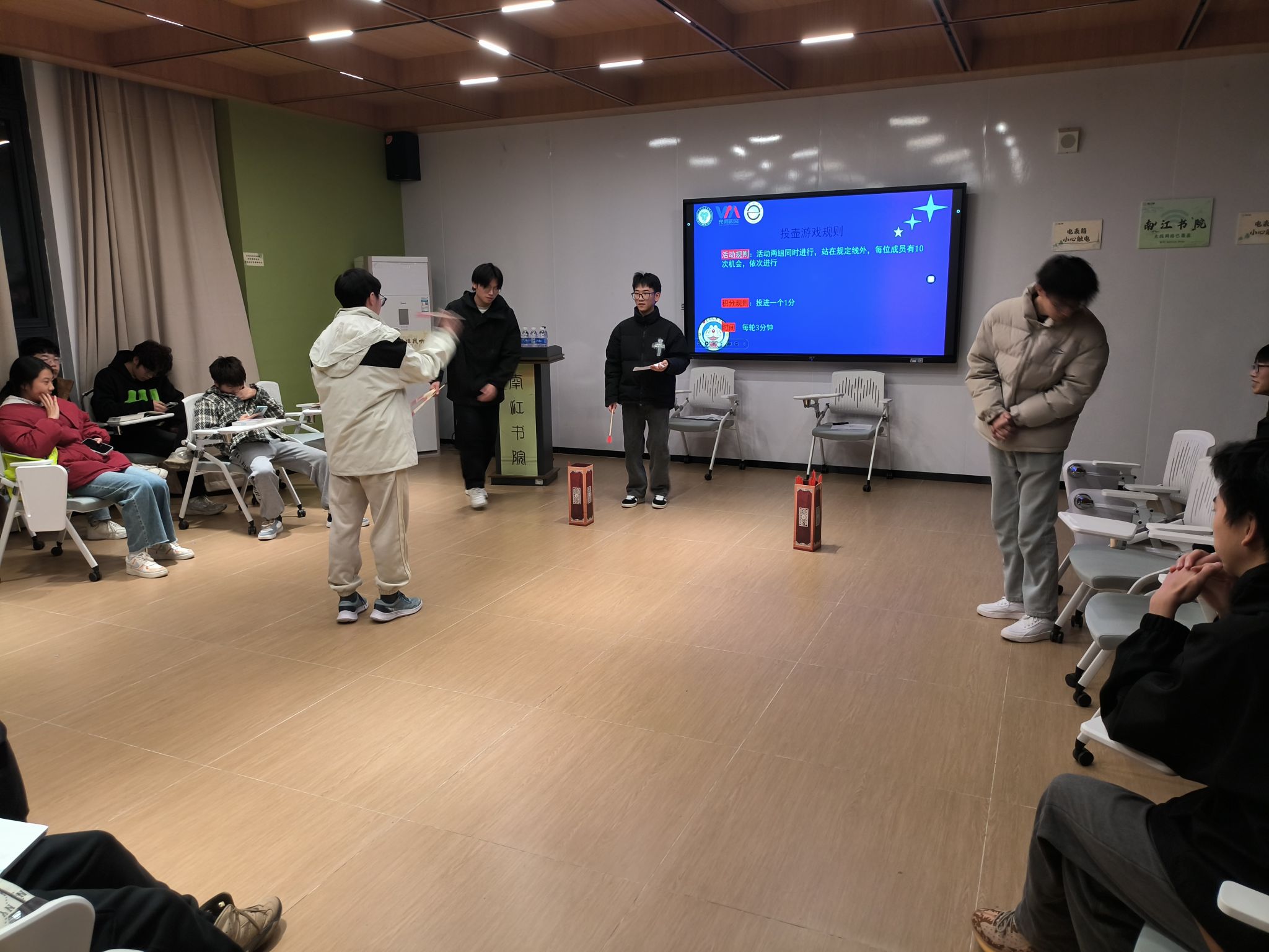 投壶的过程中,现场气氛既紧张又活跃。同学们彼此鼓励,每次成功命中都会引发热烈的掌声和欢呼声。通过这个环节,同学们不仅感受到传统文化的魅力,也在互相支持中增进了彼此间的默契。