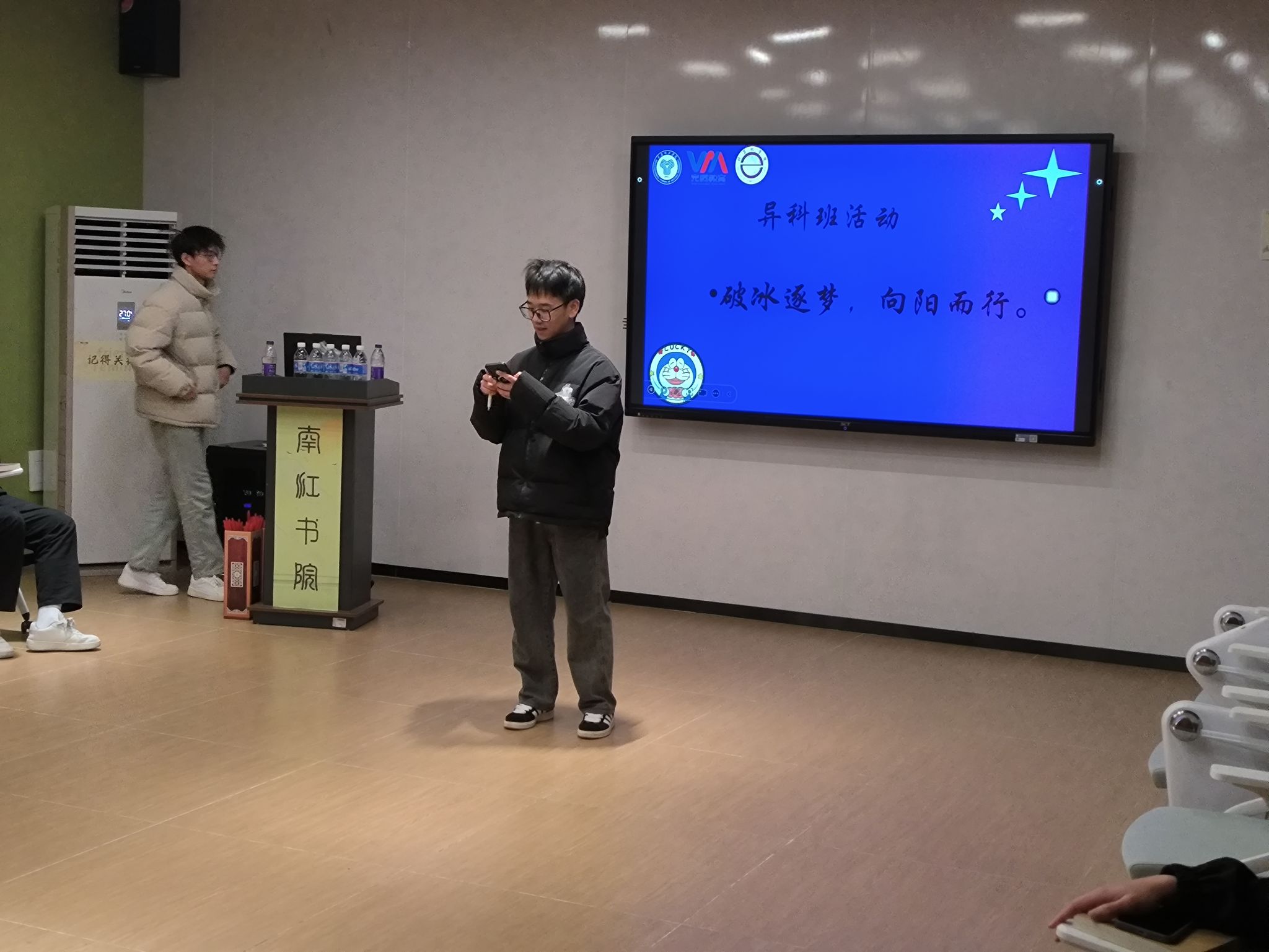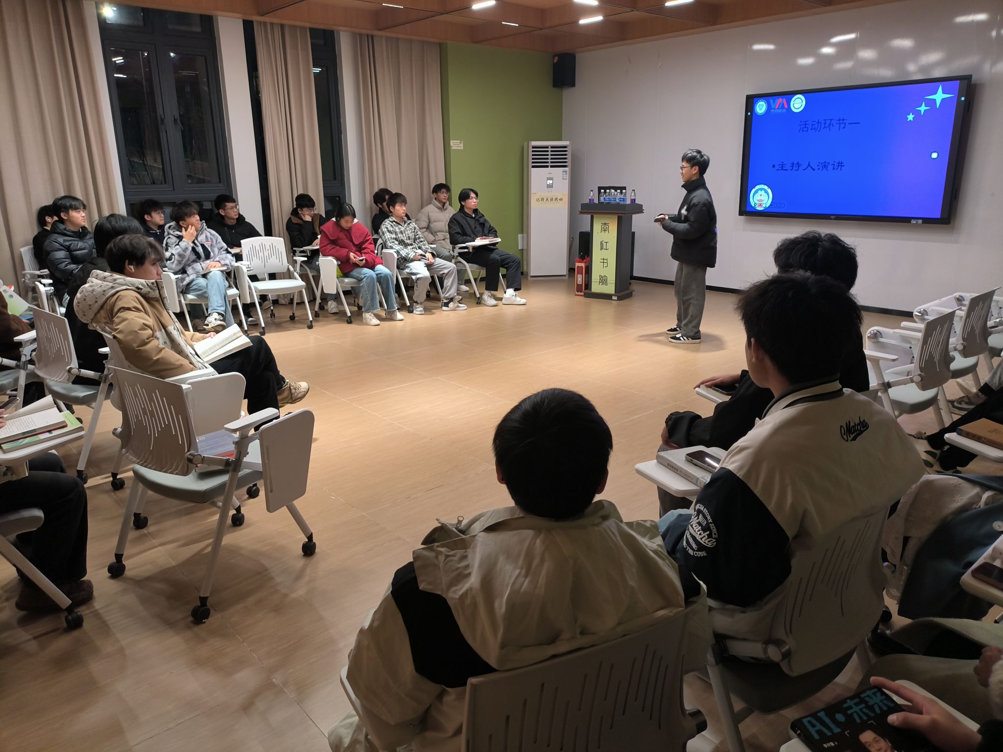 2024年12月12日晚,南江书院博学·悦享互动空间内,计科17、18异科班的同学们齐聚一堂,在徐瑞皓老师的引领下,展开了一场主题为“破冰逐梦,向阳而行”的团队建设活动。这场活动以精心设计的互动游戏和团队挑战为载体,旨在打破同学间的陌生感,增强彼此的信任与合作,为未来的学习与生活奠定坚实的团队基础。