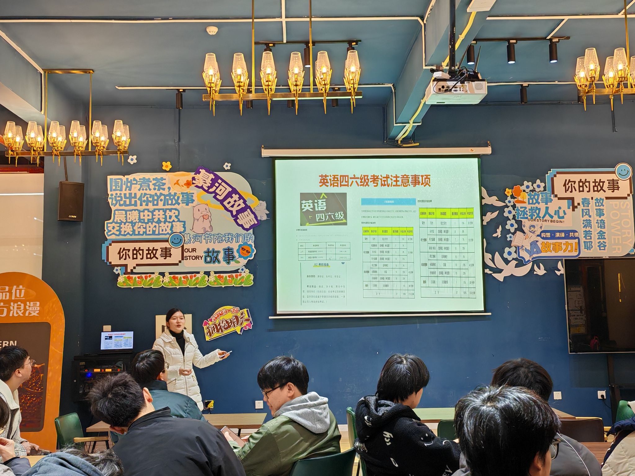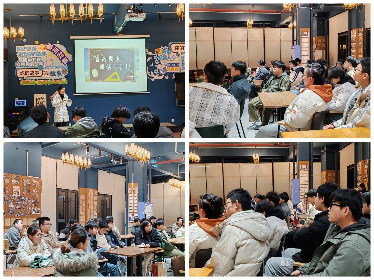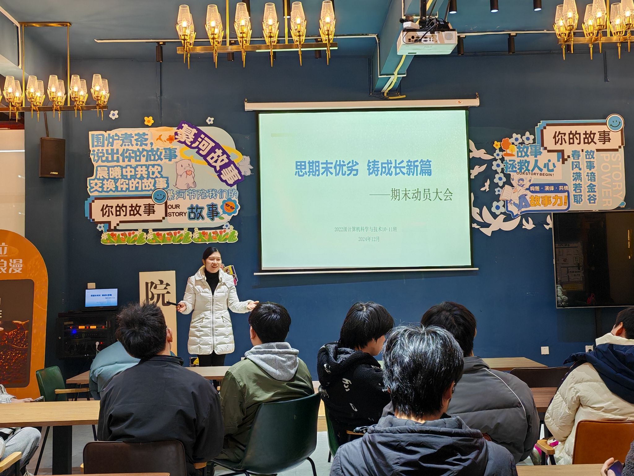 在期末考试即将来临之际,为了帮助同学们以最佳状态迎接即将到来的挑战,在英语四六级考试及期末考试中取得优异成绩。2024年12月10日,异科导师杨丽娟精心组织计算机科学与技术10-11班35位同学在綦河书院东篱故事茶馆召开了一次以“思期末优劣 铸成长新篇”为主题的期末动员大会。