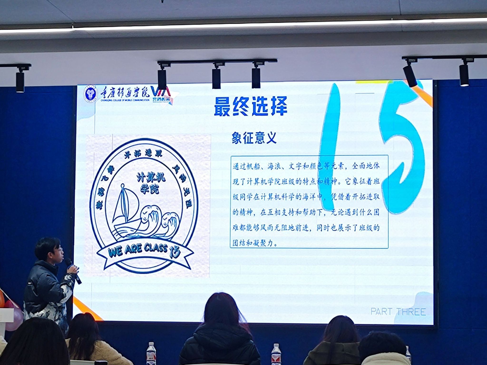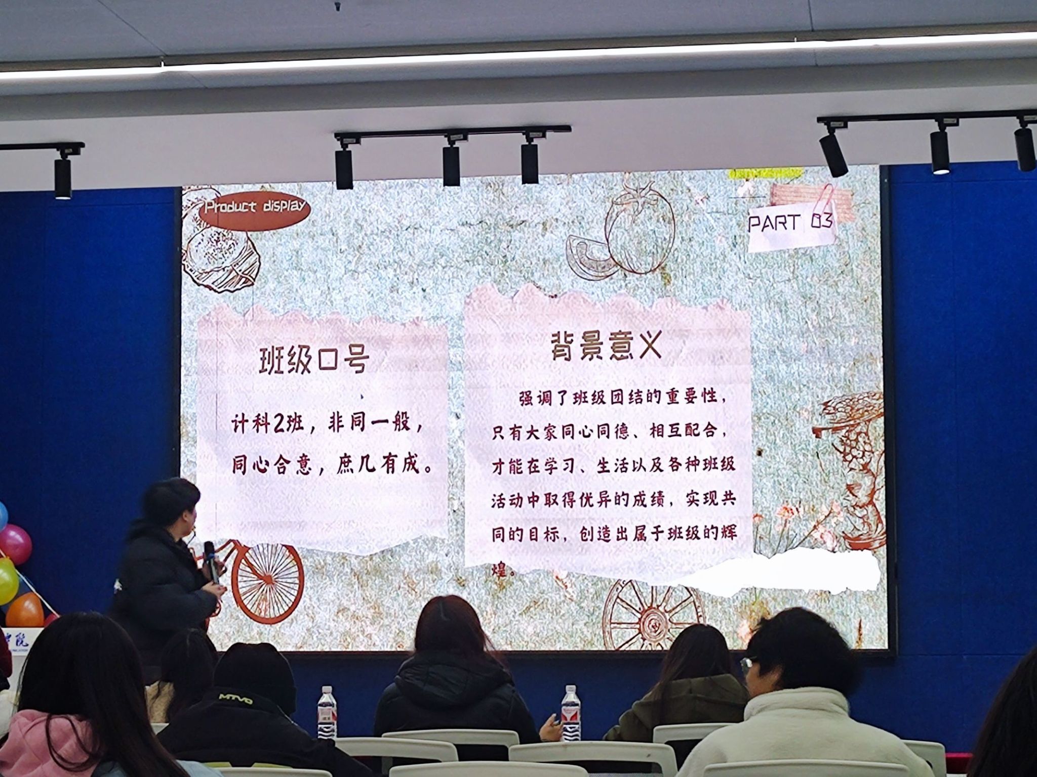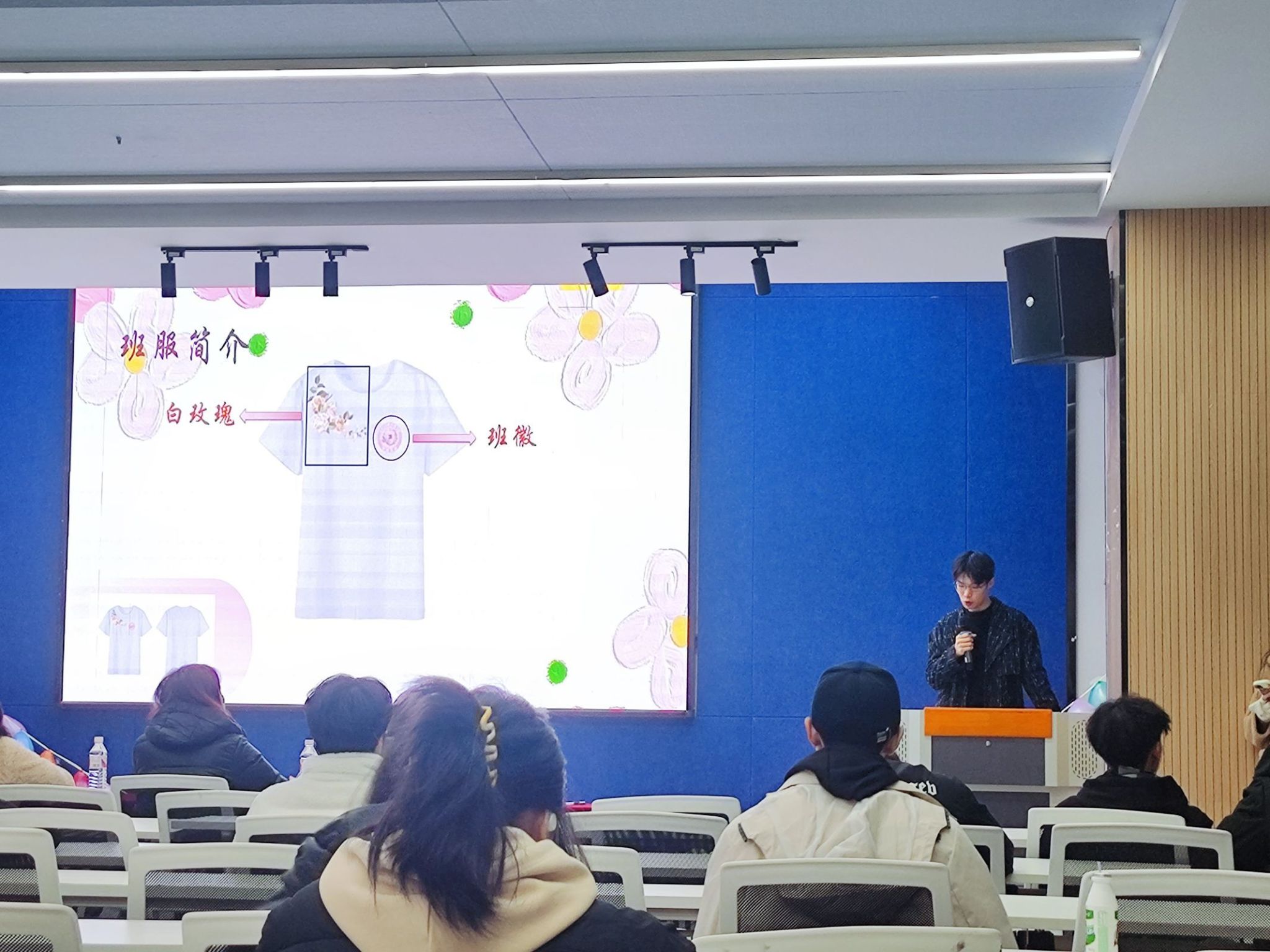 活动以班级为单位,同学们通过PPT展示、现场演说和互动表演等形式,生动呈现了班服与班徽的设计创意与文化内涵。各班班服设计独具匠心,有的融入电路图案与代码符号,凸显计算机专业特色;有的采用流行元素,将青春活力展现得淋漓尽致。在班徽设计展示中,计算机科学与技术3班凭借以粉色为主基调的班徽设计脱颖而出,荣获一等奖。粉色象征团结友爱与温暖包容,充分体现了班级的精神内涵与文化自信。评委们高度评价其独特构思与视觉表现,称其为“当晚最具感染力的作品”。