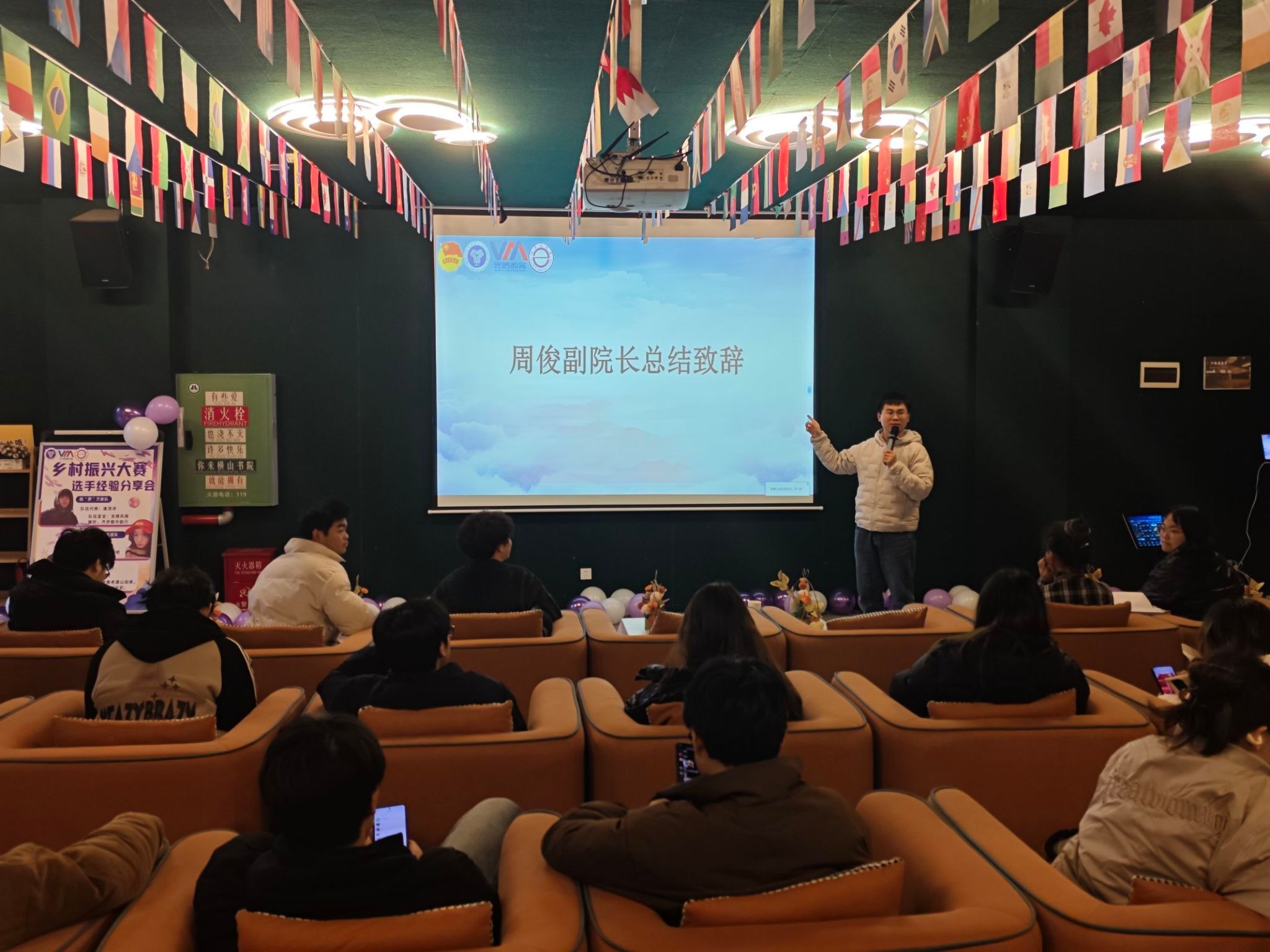 随后,周俊副院长进行总结致辞。他鼓励同学们积极投身乡村振兴项目,他强调大赛对乡村发展意义深远。作为所有队伍的指导老师,他站在指导老师的角度说,他们这几支参赛队伍的一开始作品很差,完全不是现在这个模样,是经过了指导老师的精心指导,在经过指导以后,不断对作品进行修改和打磨,用时间和心血去浇灌作品,最终长成一朵盛开的鲜花。周院的发言给了同学们参加比赛的信心与勇气,也让同学们感受到其实获奖也没有那么难,是可以通过垫一垫脚、伸一伸手就可以取得成绩的。