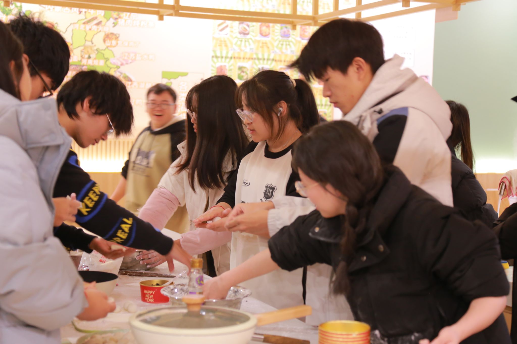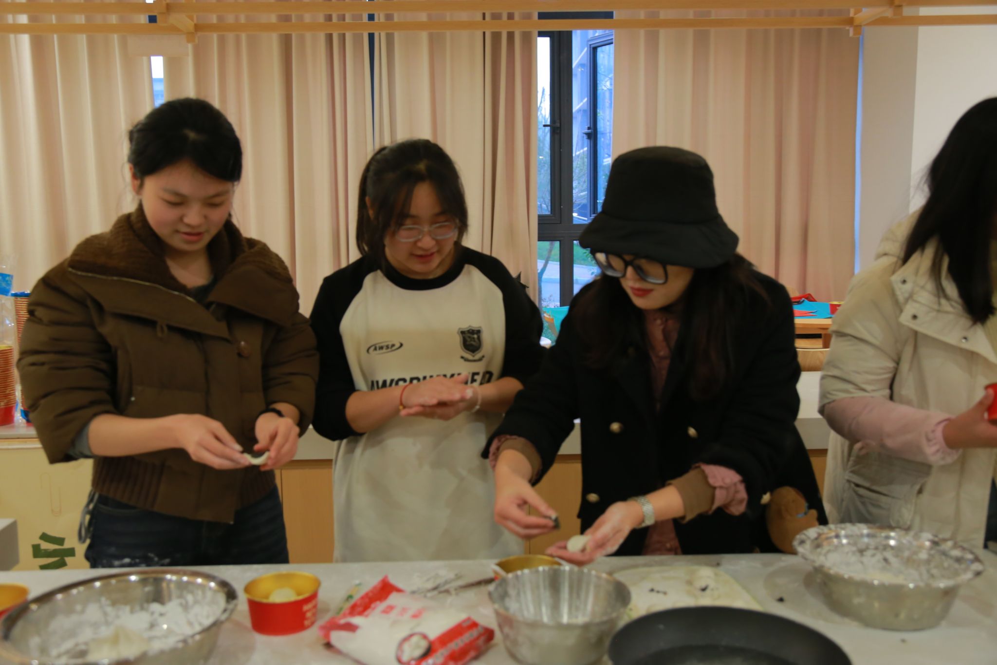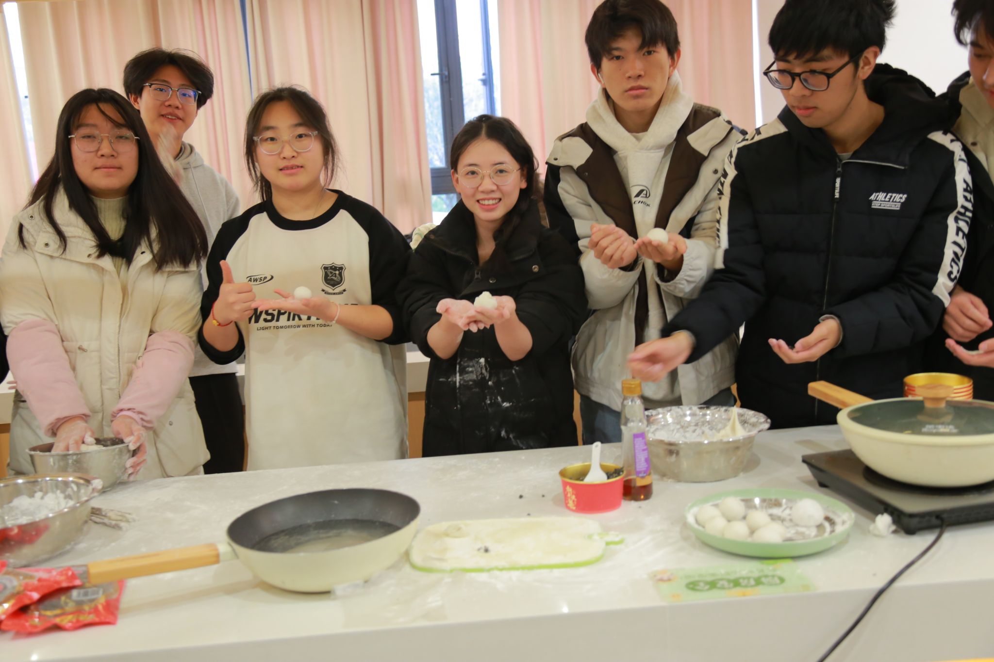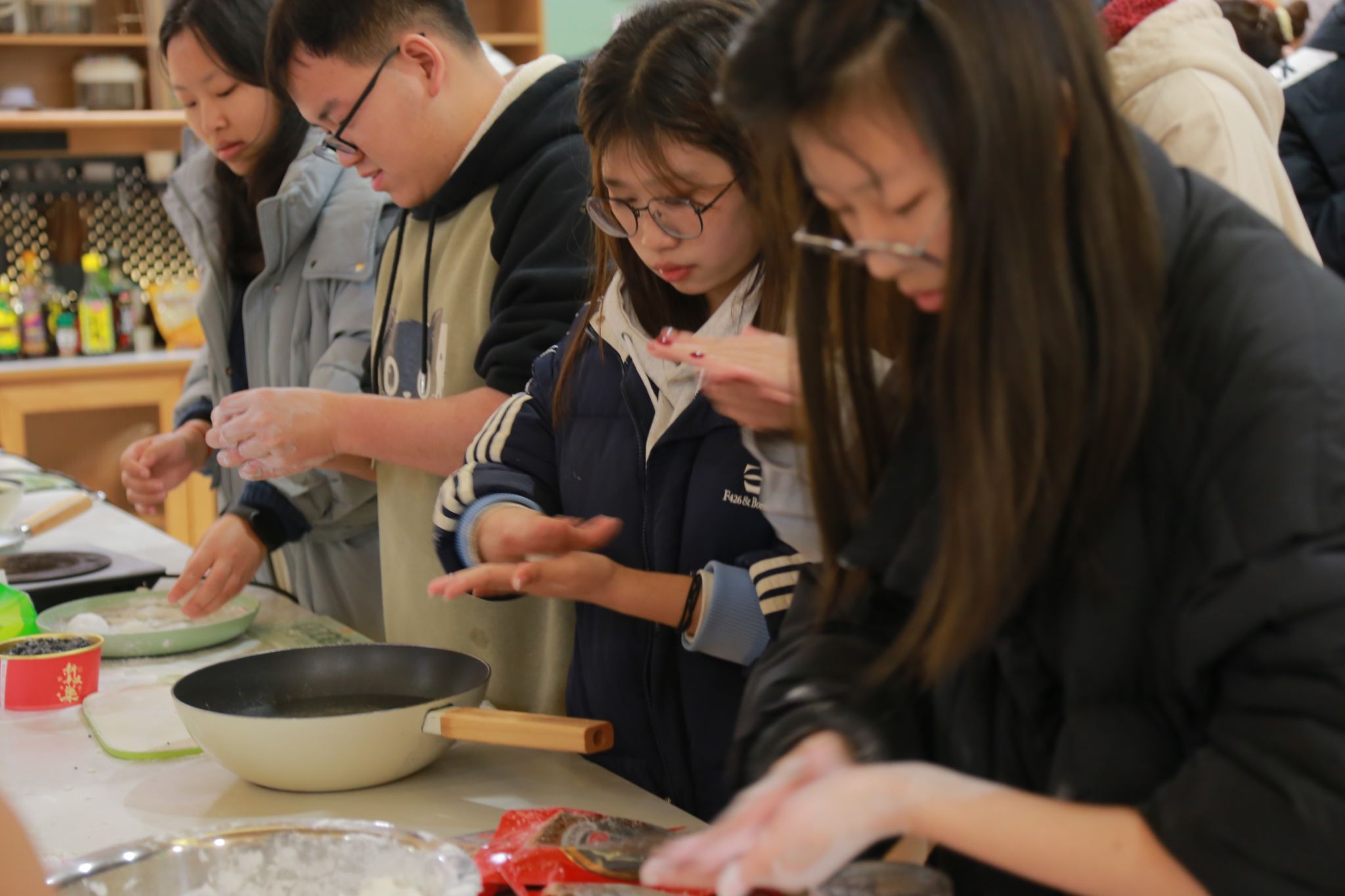 接下来是包馅环节,同学们将精心准备的各种馅料放置在面团中间,手法虽略显生疏,但每个人都全神贯注,努力将汤圆包得圆润饱满,象征着团圆美满。看着一个个形态各异却充满心意的汤圆在自己手中诞生,现场欢声笑语不断,浓浓的年味儿也在这种互动中弥漫开来。