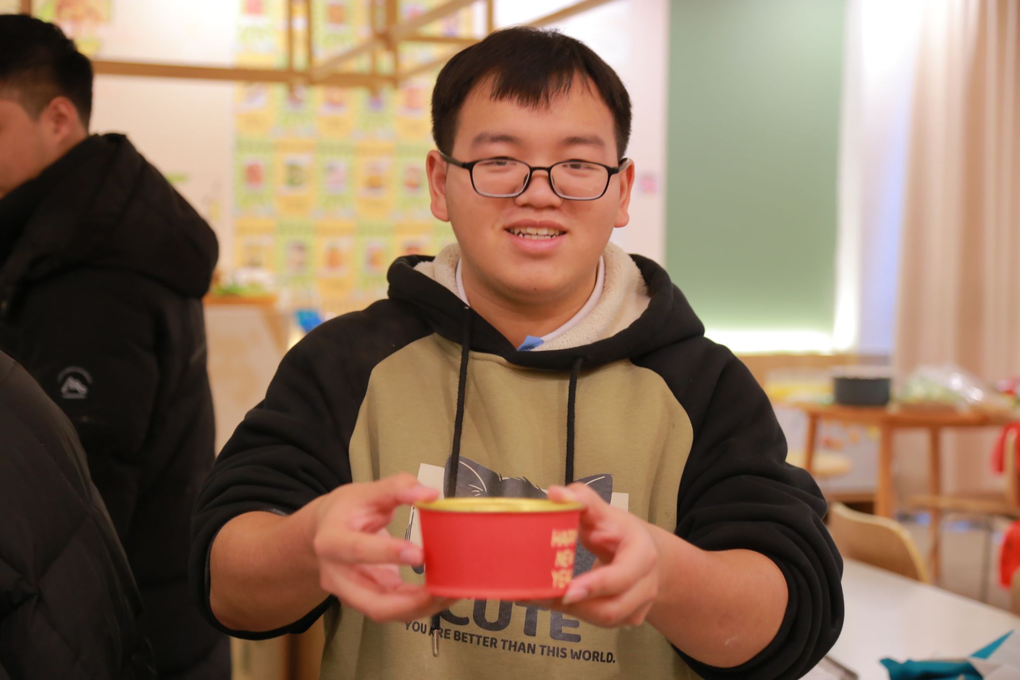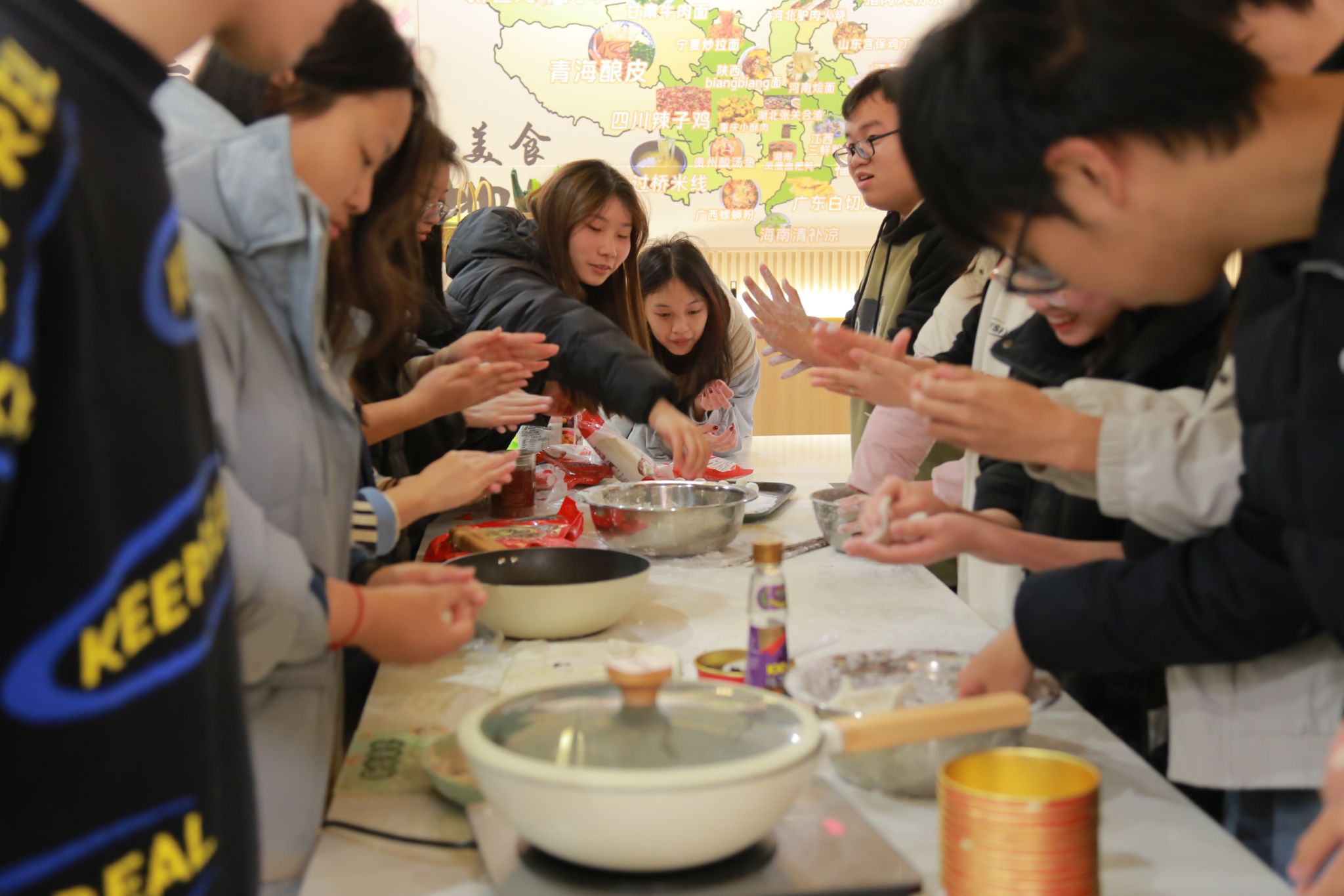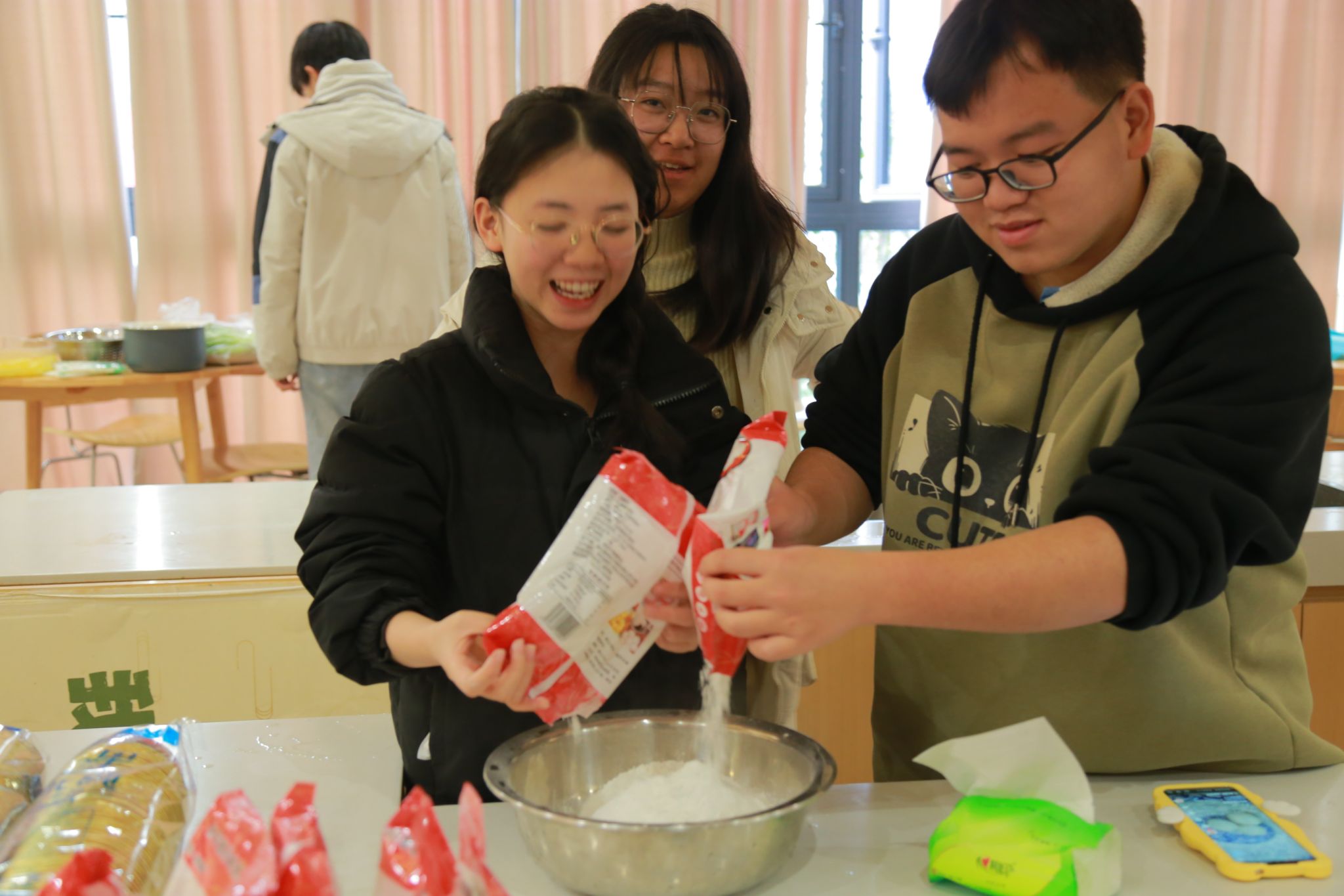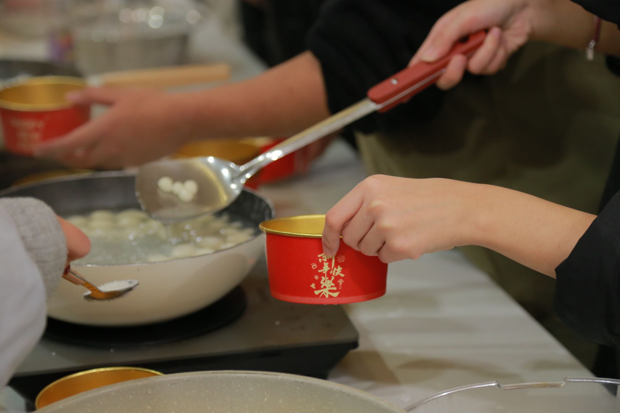 接下来是包馅环节,同学们将精心准备的各种馅料放置在面团中间,手法虽略显生疏,但每个人都全神贯注,努力将汤圆包得圆润饱满,象征着团圆美满。看着一个个形态各异却充满心意的汤圆在自己手中诞生,现场欢声笑语不断,浓浓的年味儿也在这种互动中弥漫开来。