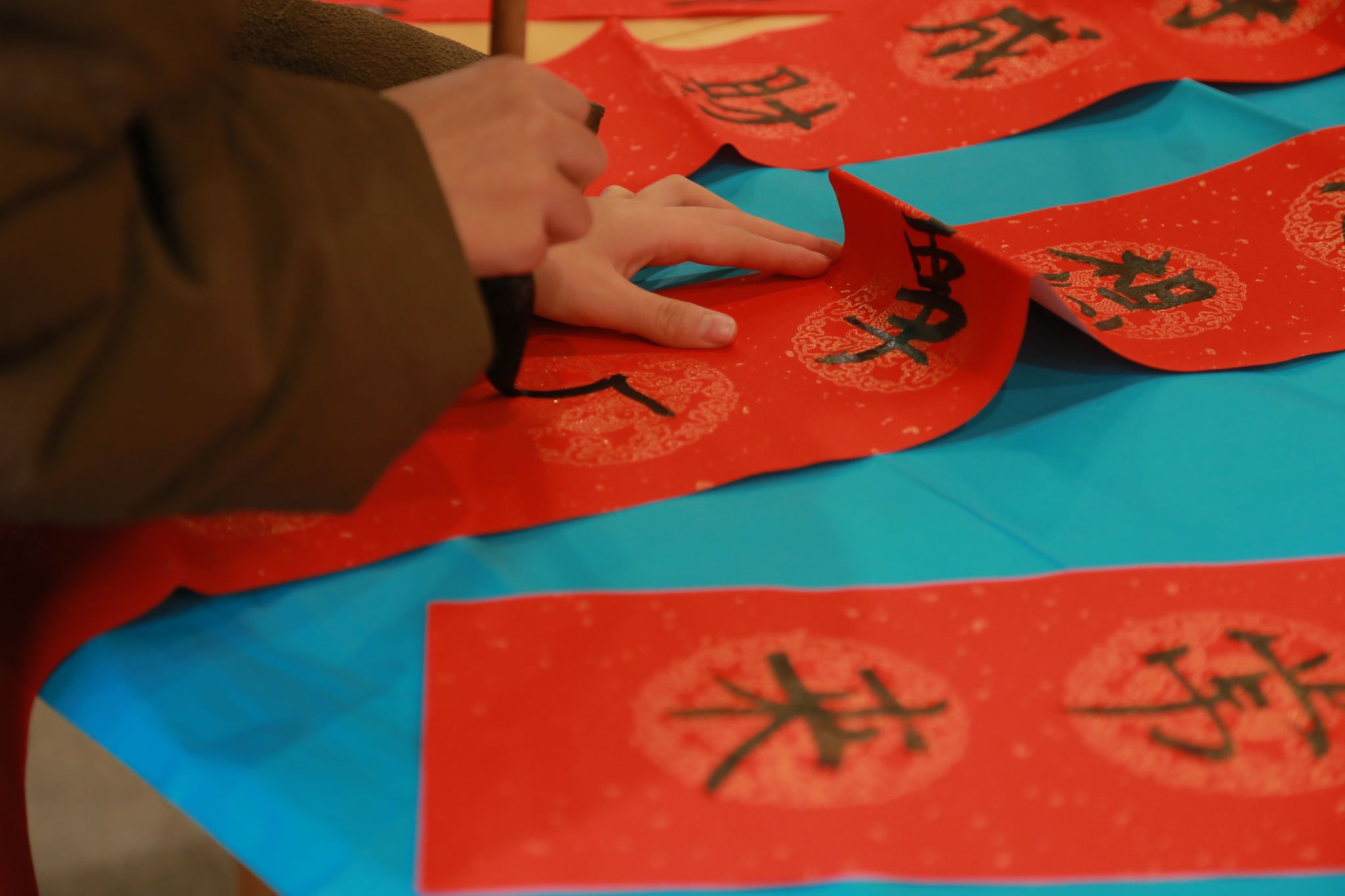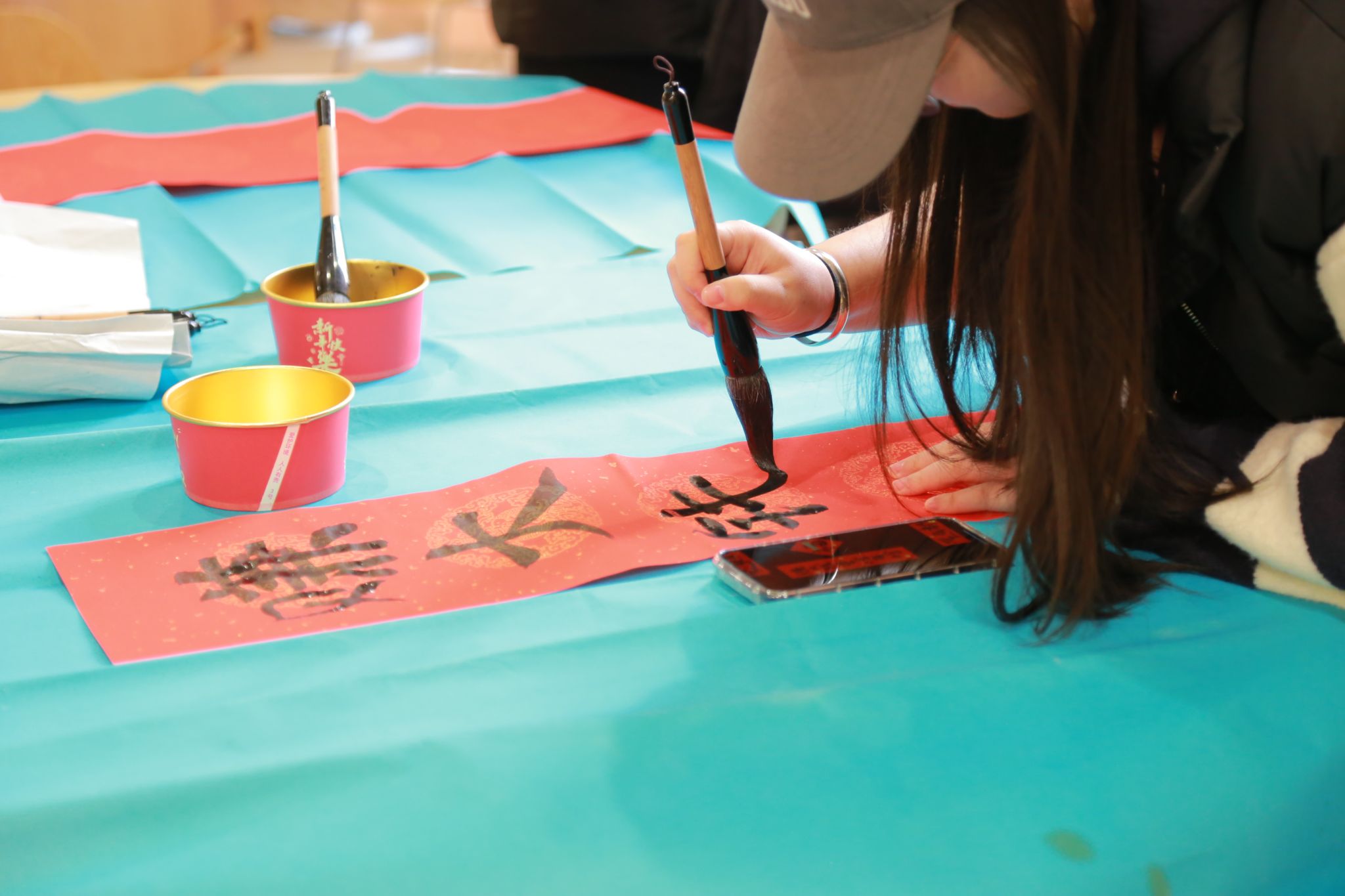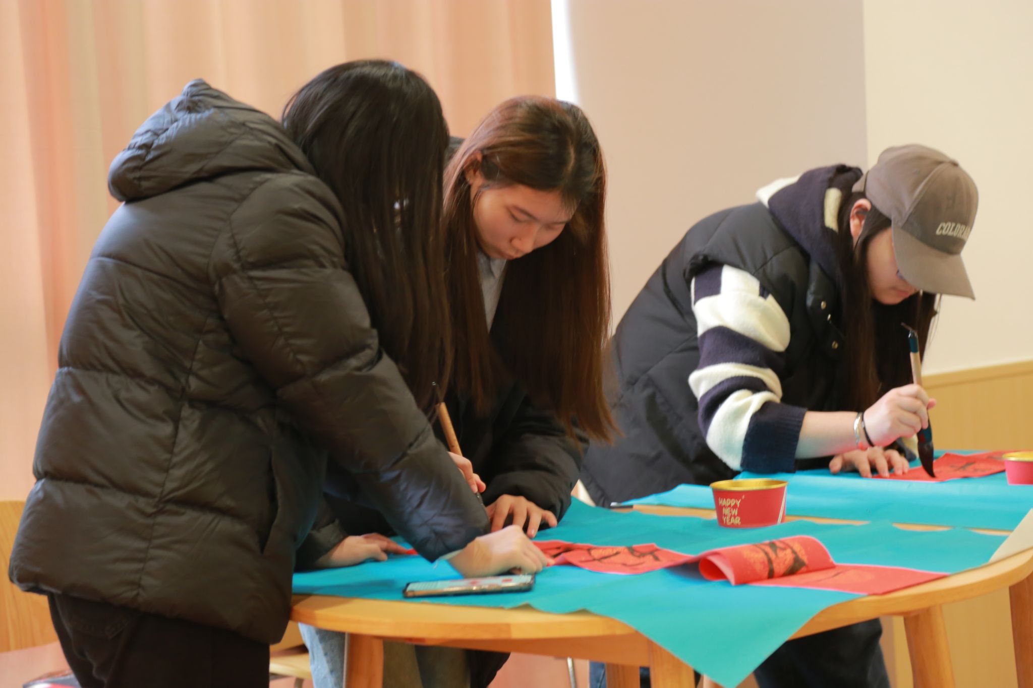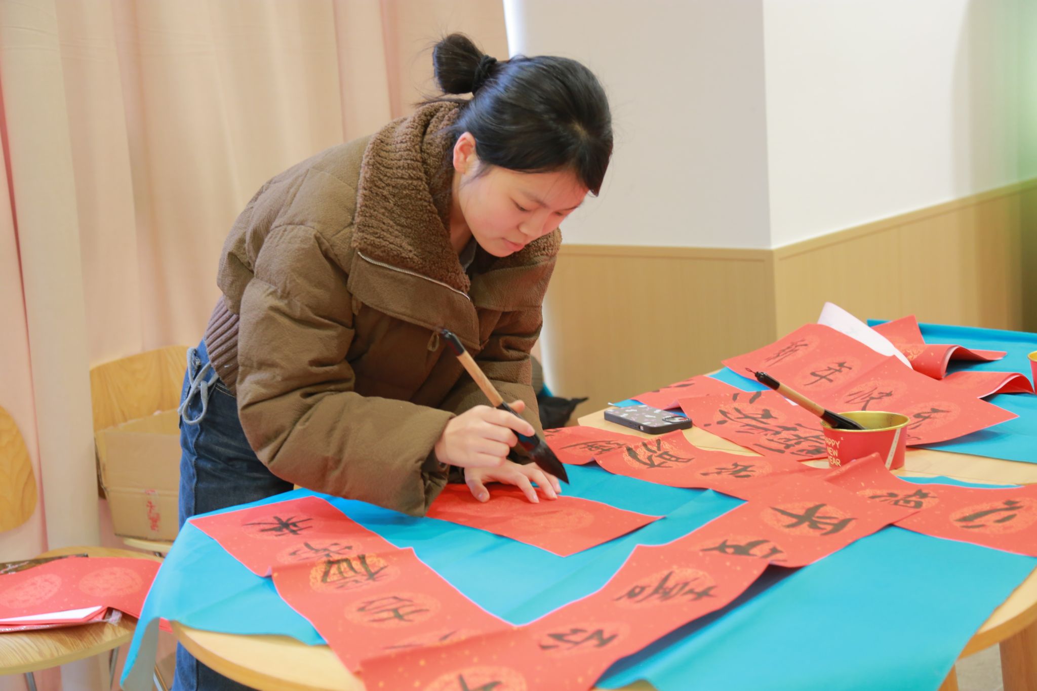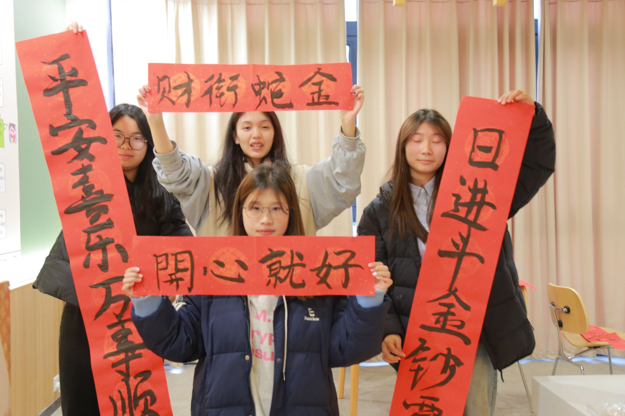 与此同时,汤圆在锅中烹煮,热气腾腾的水汽弥漫在整个厨房,散发出诱人的香甜气息。在等待汤圆出锅的空隙,写对联活动也热火朝天地进行着。同学们挥毫泼墨,将对新年的美好愿景与祝福倾注于笔尖,一副副对仗工整、寓意吉祥的对联跃然纸上。“万事如意福临门,风调雨顺年丰穗”“日进斗金钞票多,平安喜乐完事顺”……这些充满诗意与喜庆的语句,不仅展现了同学们的美好向往,更传递出大家对新一年的热切期盼。