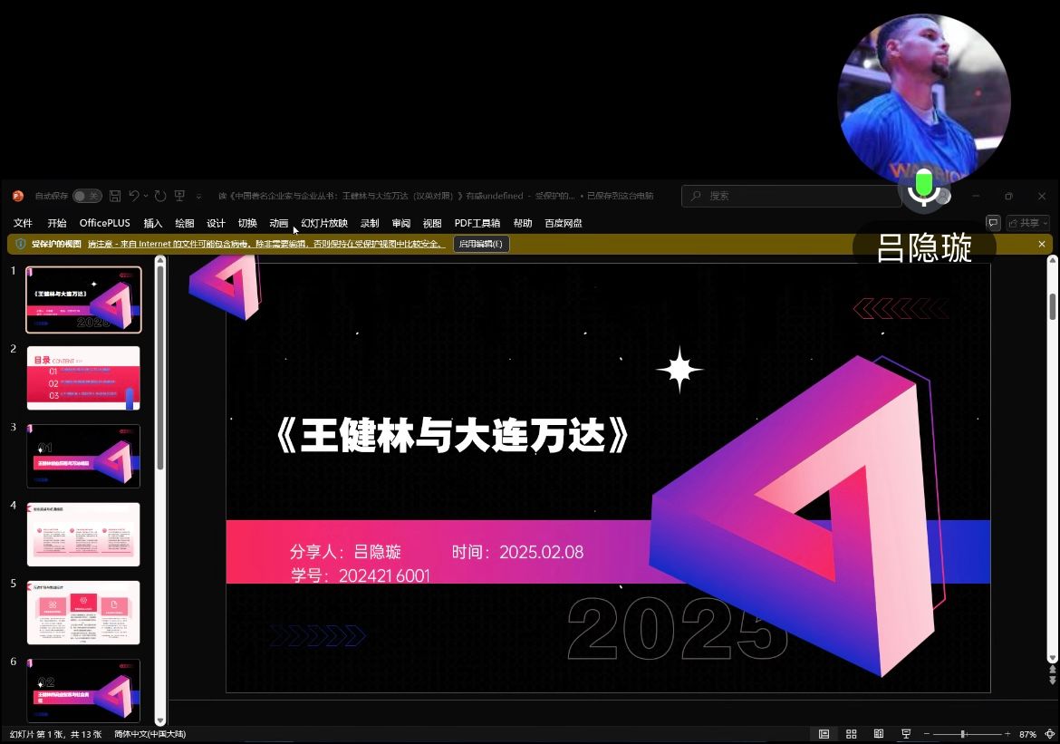 吕隐璇同学则聚焦于《王健林与大连万达》,深入分析了王健林的创业历程与企业管理智慧。她从万达的创立讲起,详细回顾了王健林如何凭借敏锐的商业洞察力和敢闯敢拼的精神,逐步将万达发展成为国际知名的跨国集团。吕隐璇指出,万达的成功不仅在于商业模式的创新,更在于王健林强烈的社会责任感和对员工的关怀。她提到,万达的“订单式商业地产”模式,不仅解决了资金回笼问题,还提升了项目的商业价值和市场竞争力。通过分享,同学们对创业和企业管理有了更全面的认识,也为未来的职业规划提供了新的思路。