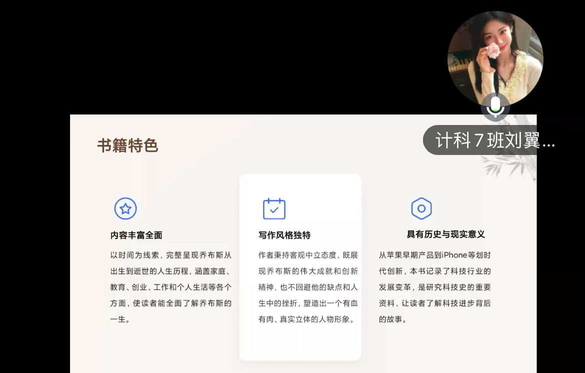 刘翼同学分享了《史蒂夫·乔布斯传》中的精彩内容,深入解读了乔布斯的创业历程与创新理念。他从乔布斯的创业初期讲起,详细阐述了苹果公司从创立到被赶出公司,再到乔布斯回归并带领苹果走向巅峰的传奇经历。刘翼着重强调了乔布斯对产品极致追求的工匠精神和敢于突破传统的创新勇气。他提到,乔布斯对产品细节的苛刻要求,从Macintosh到iPhone,每一款产品都堪称艺术品。通过分享,同学们不仅对乔布斯的创新精神有了更深刻的理解,更在假期中获得了关于如何将创新思维融入学习和生活的启示。