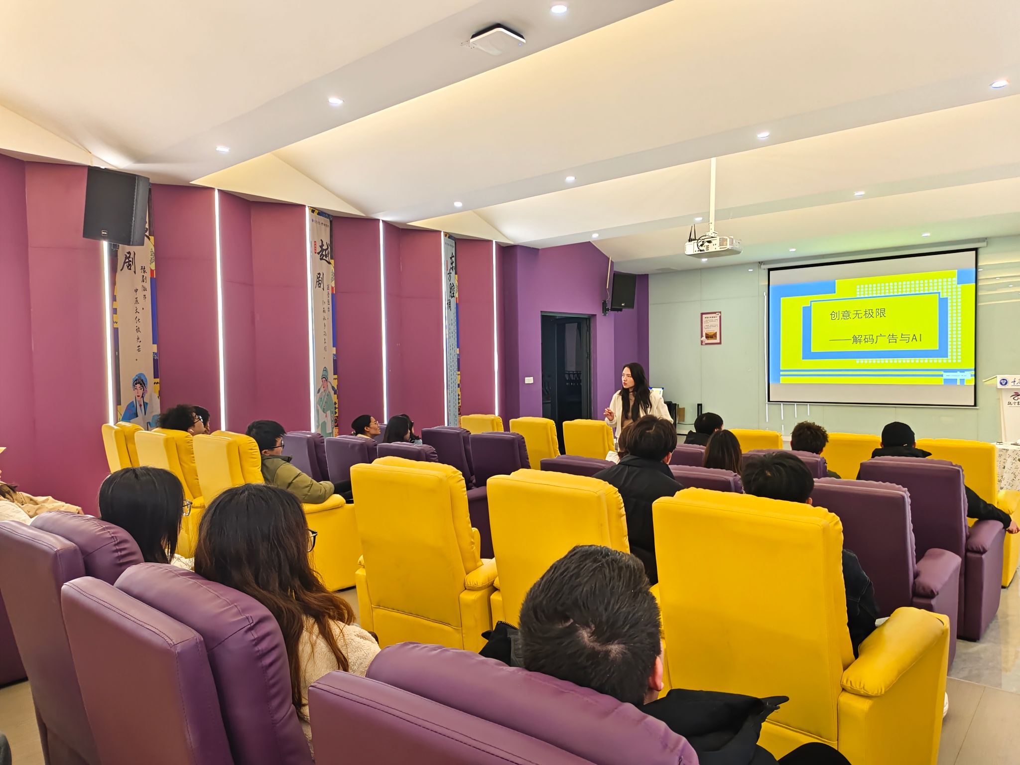 在“AI重构广告生态”专题研讨中,梁老师以“从算法到创意:AI如何重塑广告价值链”为题展开分享。并现场给出关键词尝试让同学们进行创作,共同讨论AI与广告的深度联系。活动尾声,梁老师总结,我们的优势在于“跨界”与“融合”。希望同学们以AI为翼,在各大赛事参与中突破自我,成为兼具技术深度与行业视野的复合型人才。